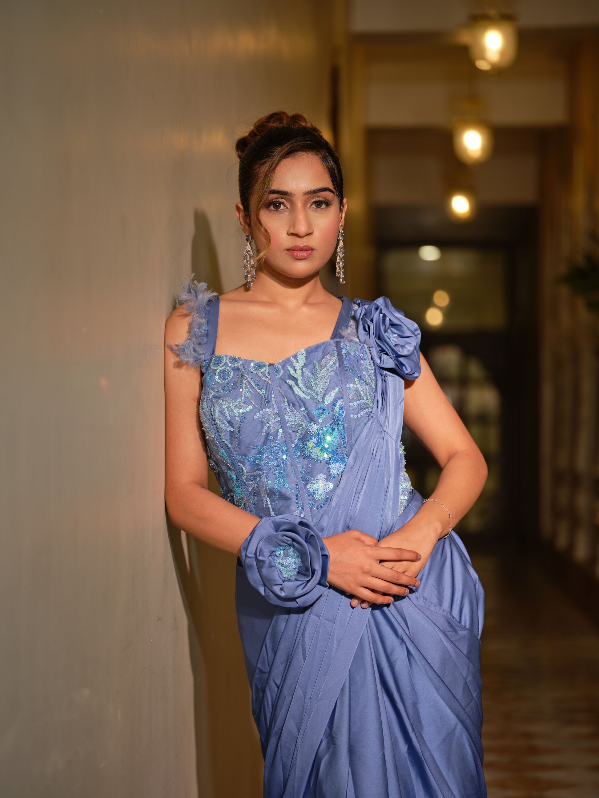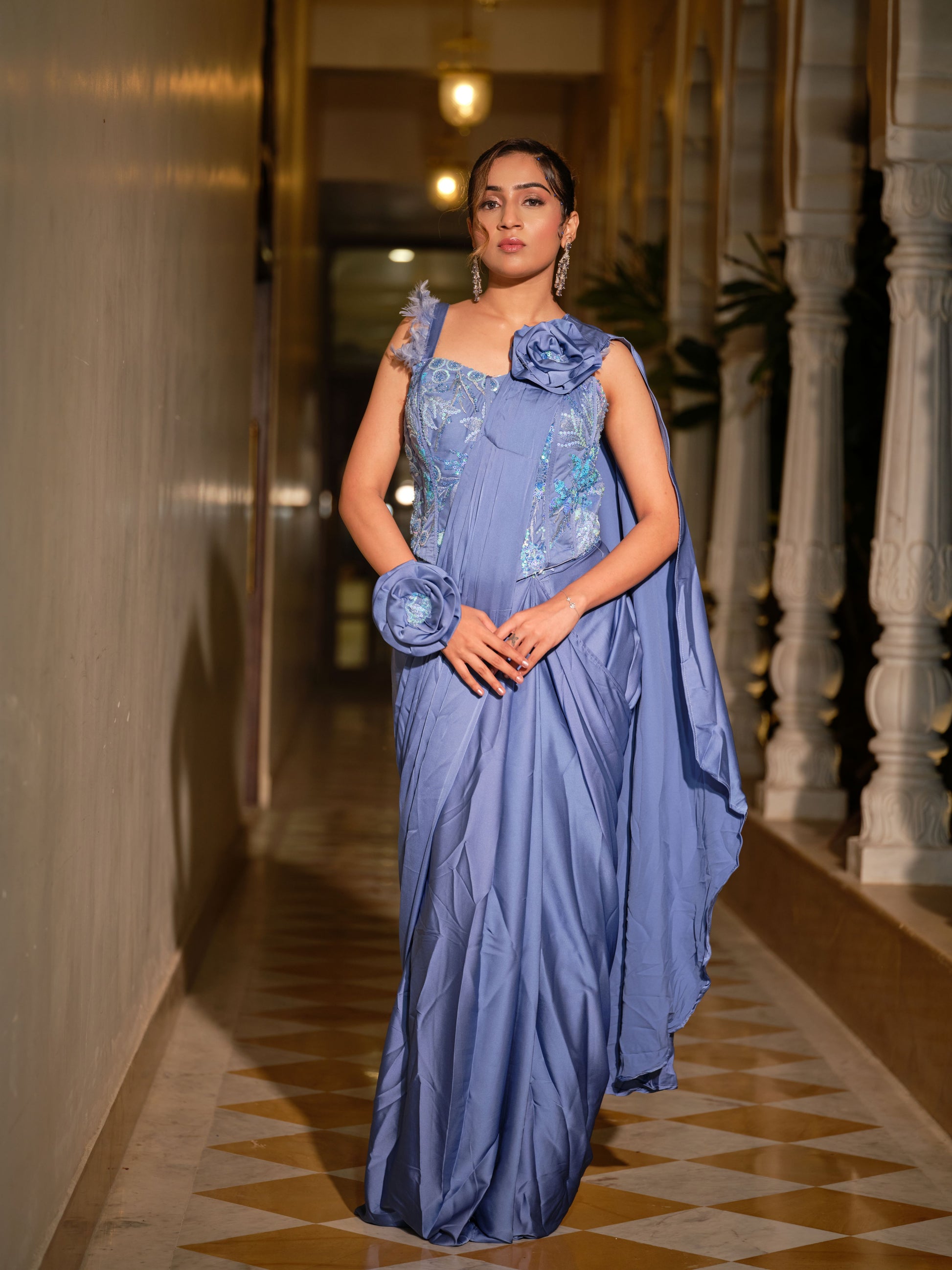 Dreamy drape saree in a serene periwinkle blue tone. The corset-style blouse, embellished with delicate sequins and floral appliqué, adds a touch of fairytale charm, while the fluid drape gives it a contemporary edge. Finished with a statement fabric flower on the shoulder, this ensemble is elegance reimagined for the modern diva.