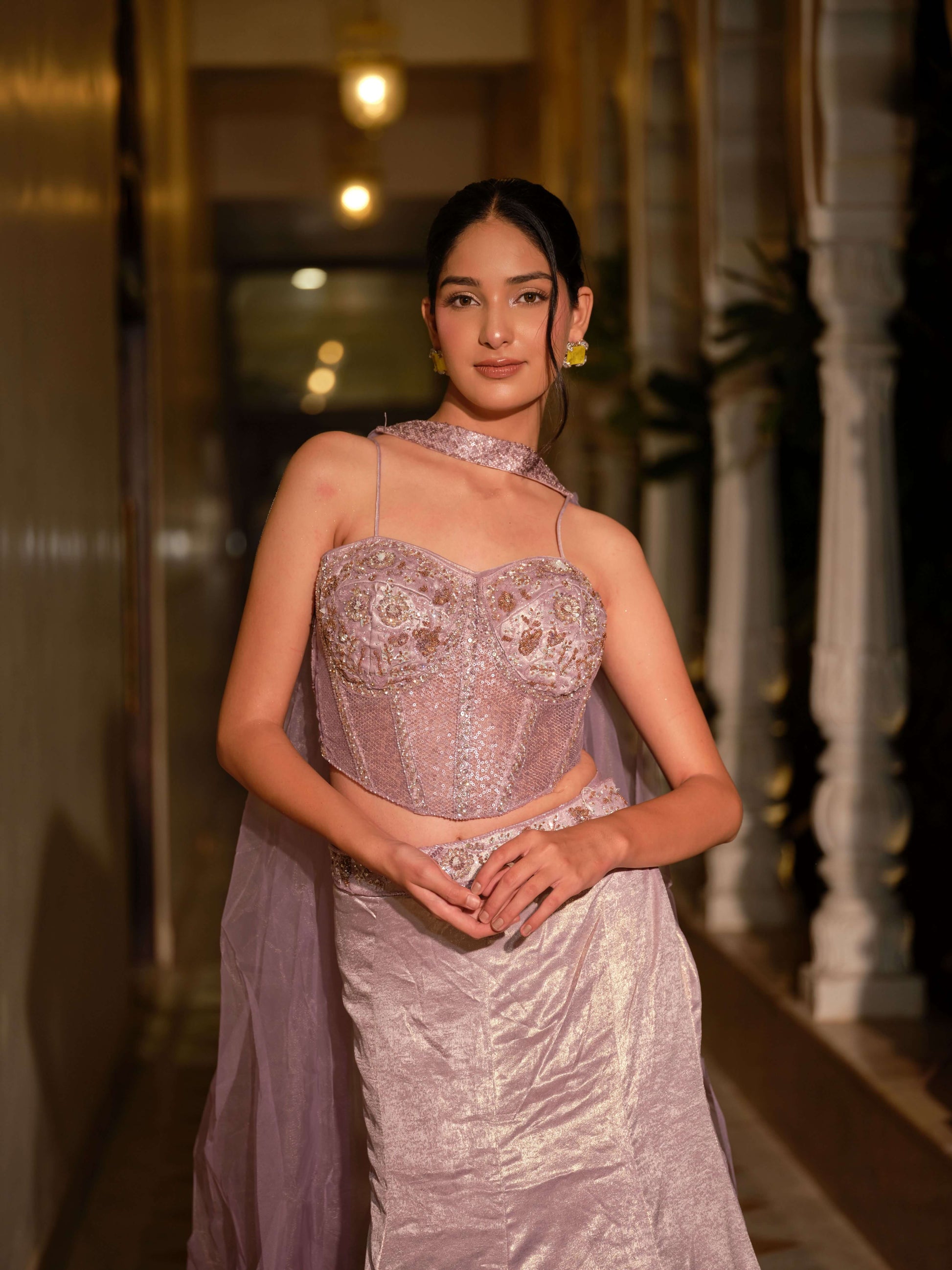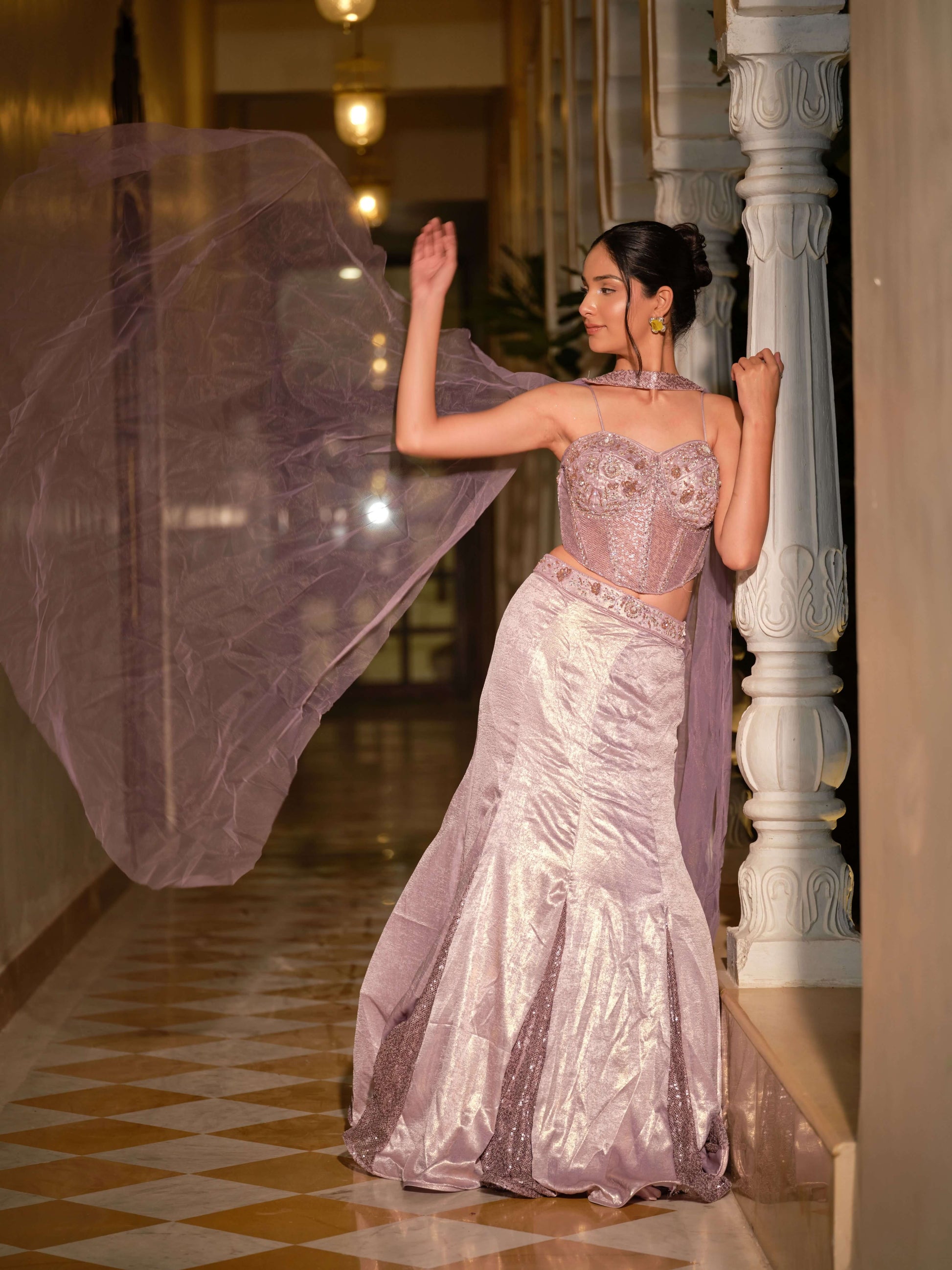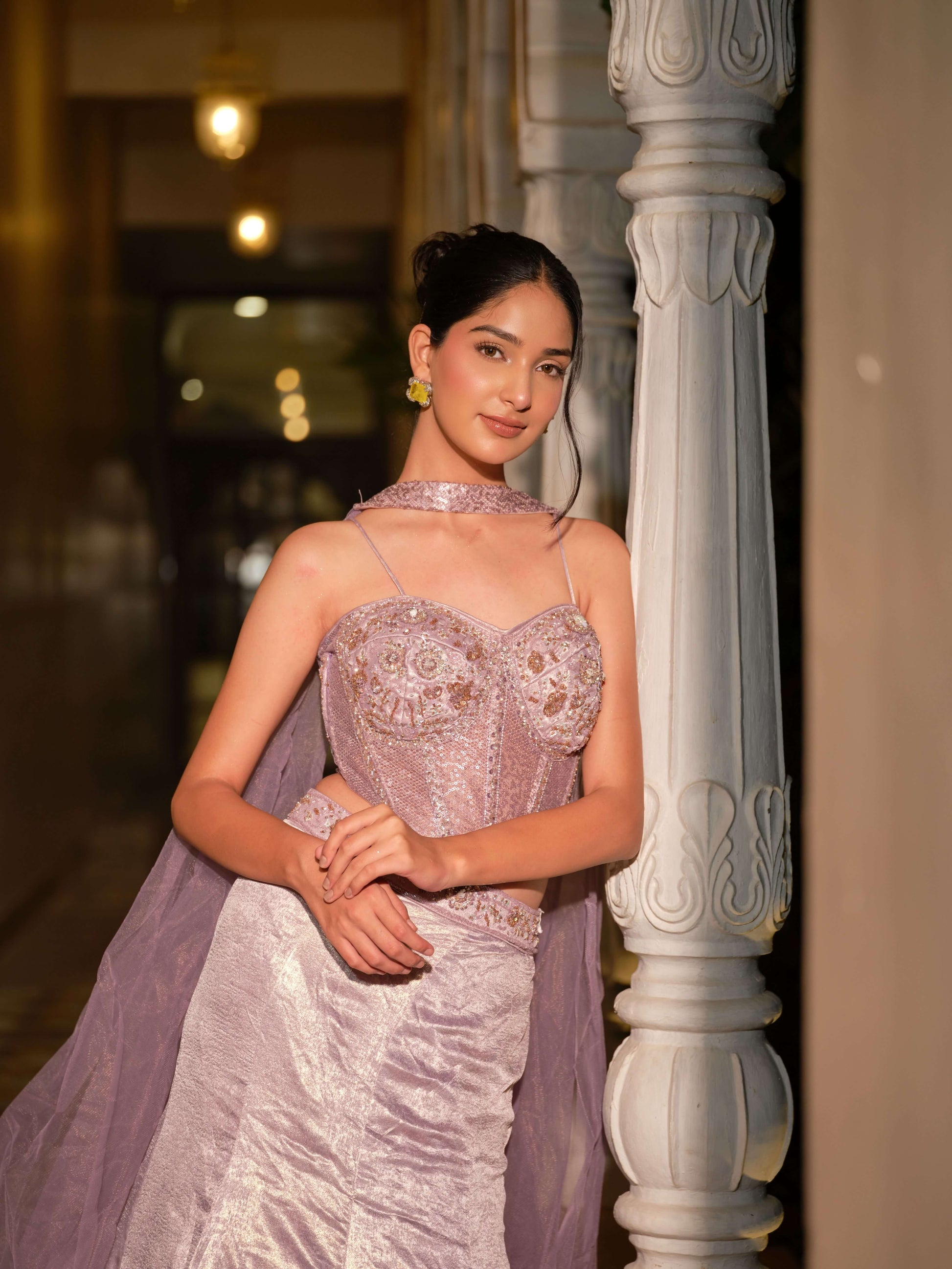 A luxurious lavender drape gown crafted with a sculpted embellished corset and a fluid mermaid-style fall. The sheer detailing, shimmer accents, and soft draped pallu-style extension give it a modern couture charm. Designed to blend elegance with glamour, this outfit creates a feminine, dramatic silhouette perfect for high-fashion events.