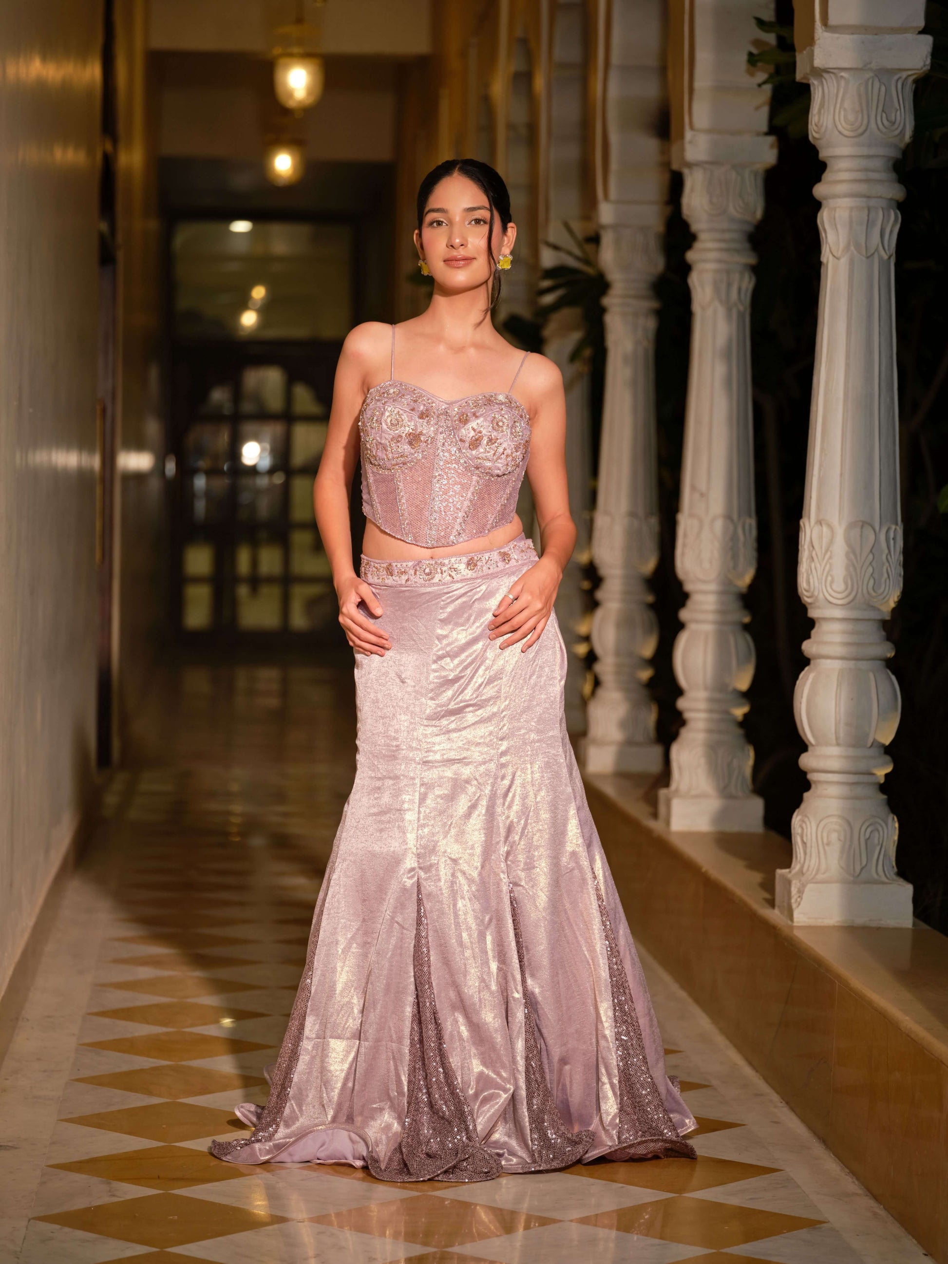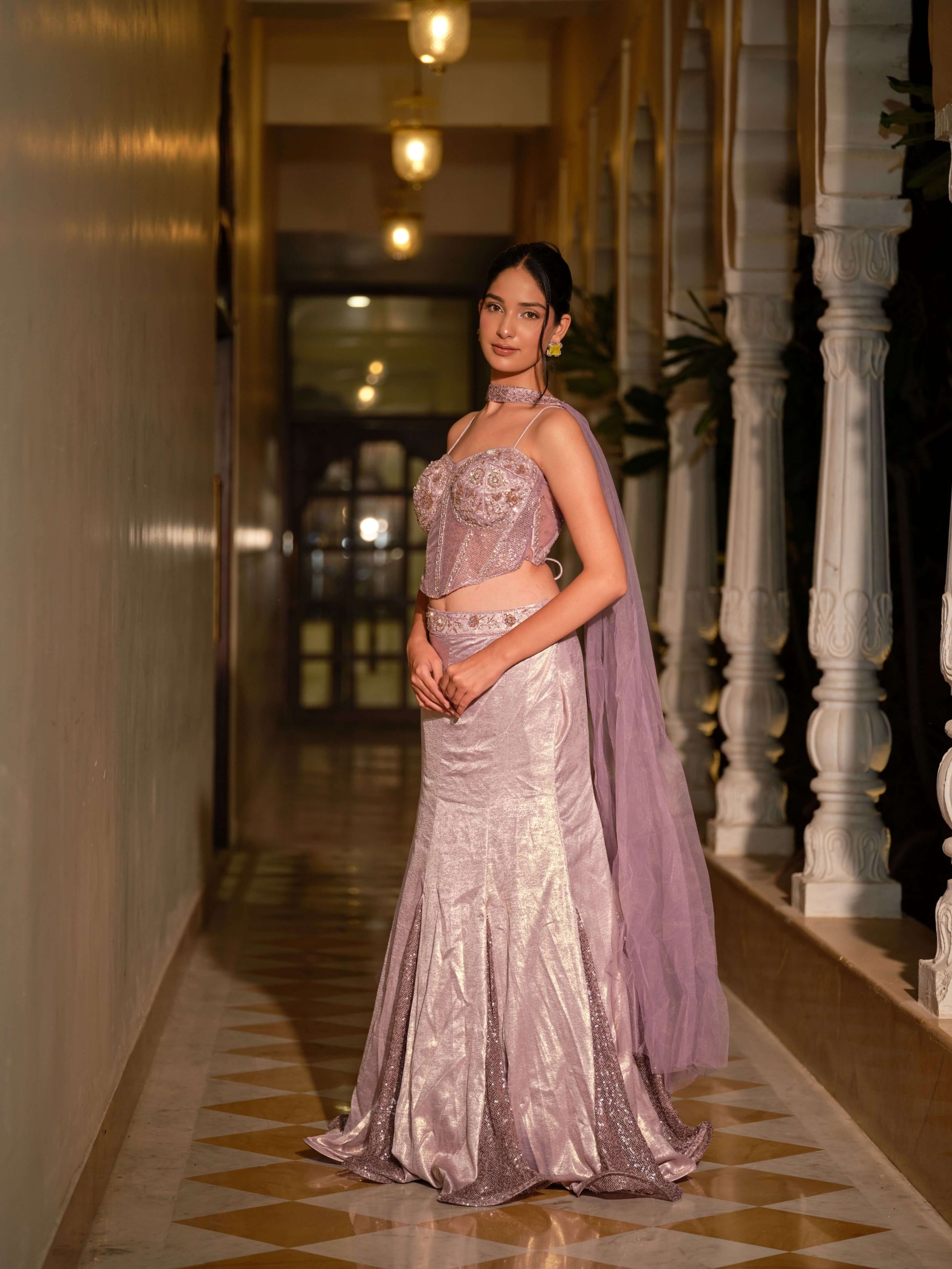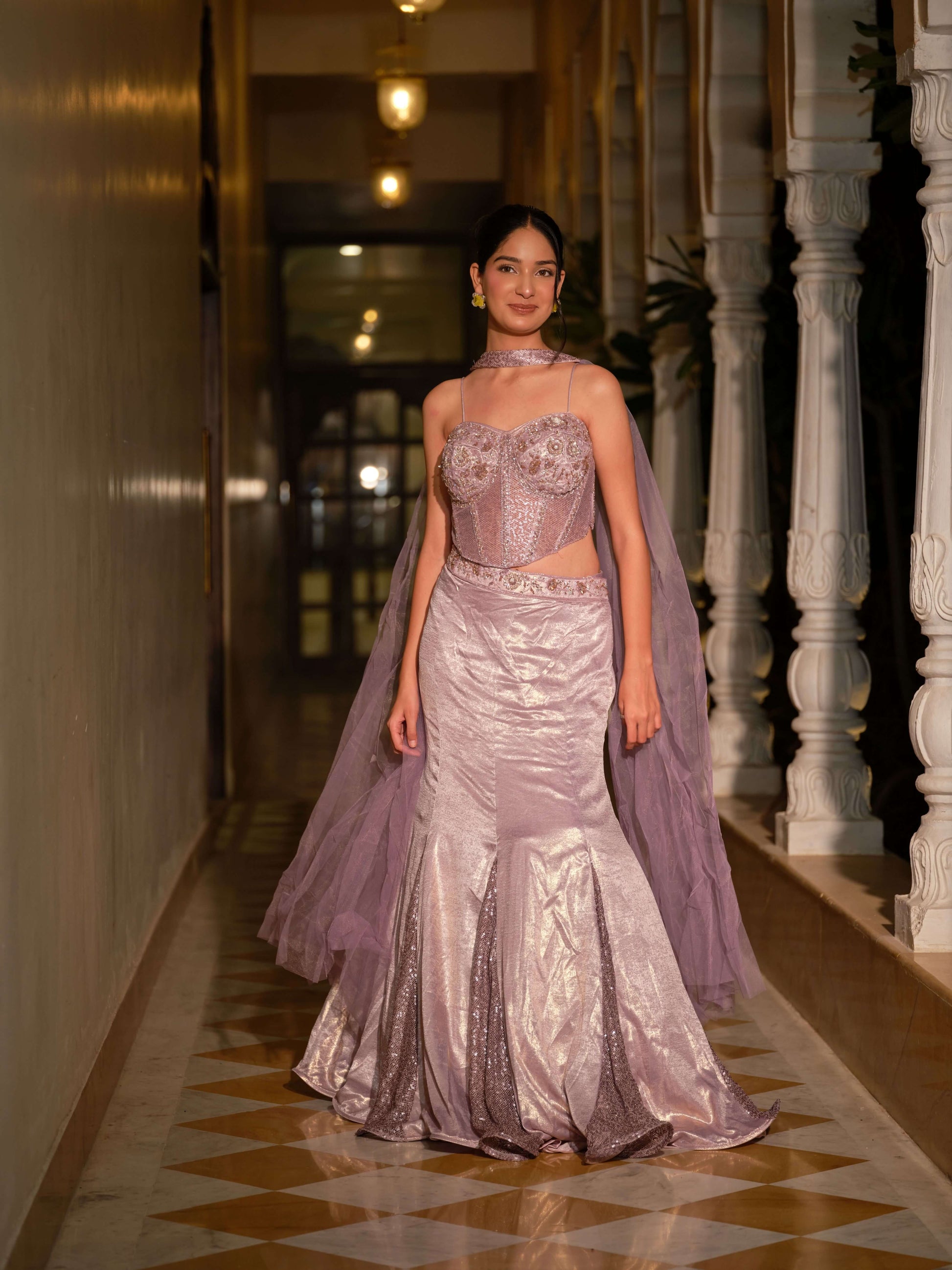 A luxurious lavender drape gown crafted with a sculpted embellished corset and a fluid mermaid-style fall. The sheer detailing, shimmer accents, and soft draped pallu-style extension give it a modern couture charm. Designed to blend elegance with glamour, this outfit creates a feminine, dramatic silhouette perfect for high-fashion events.