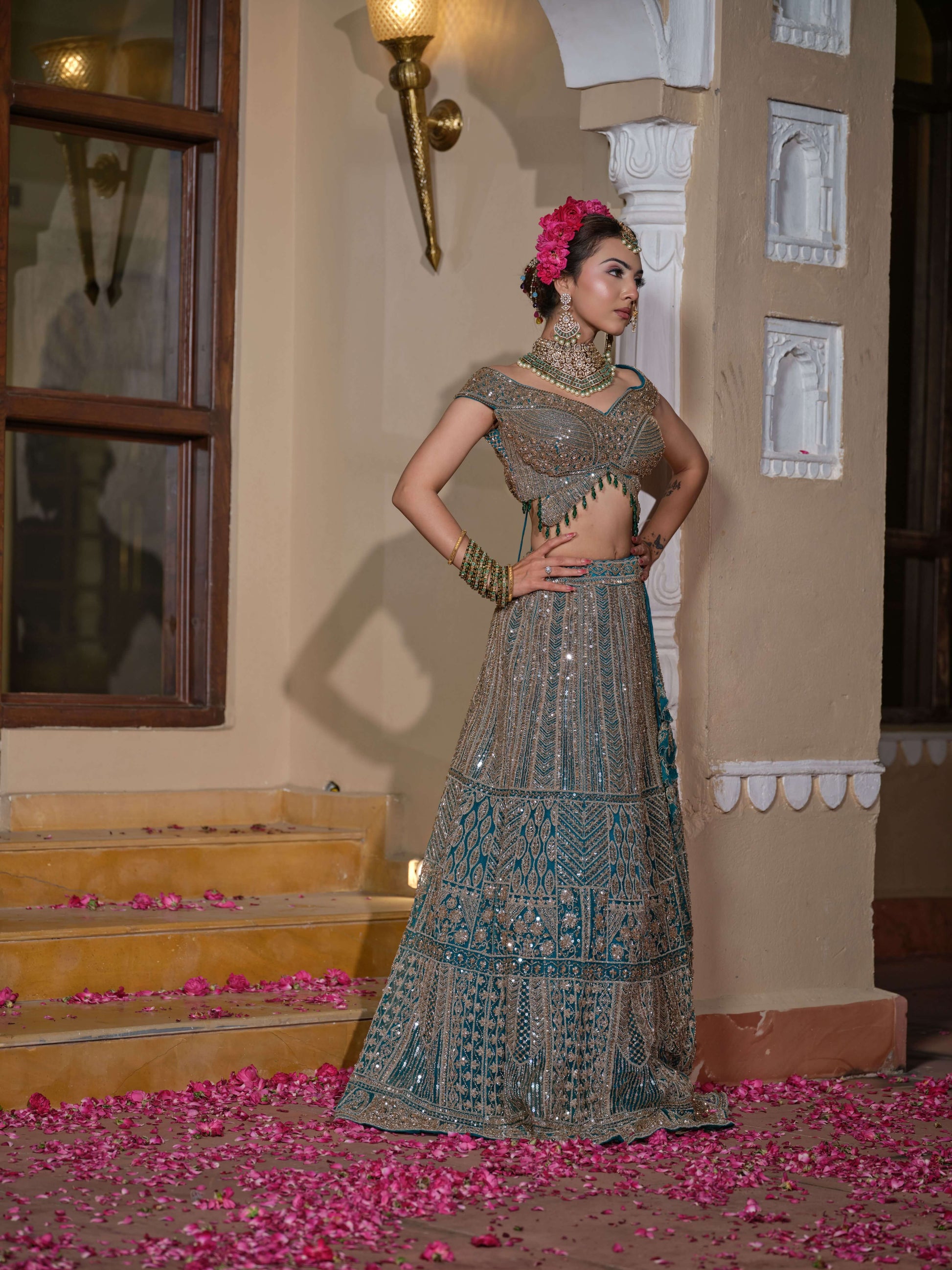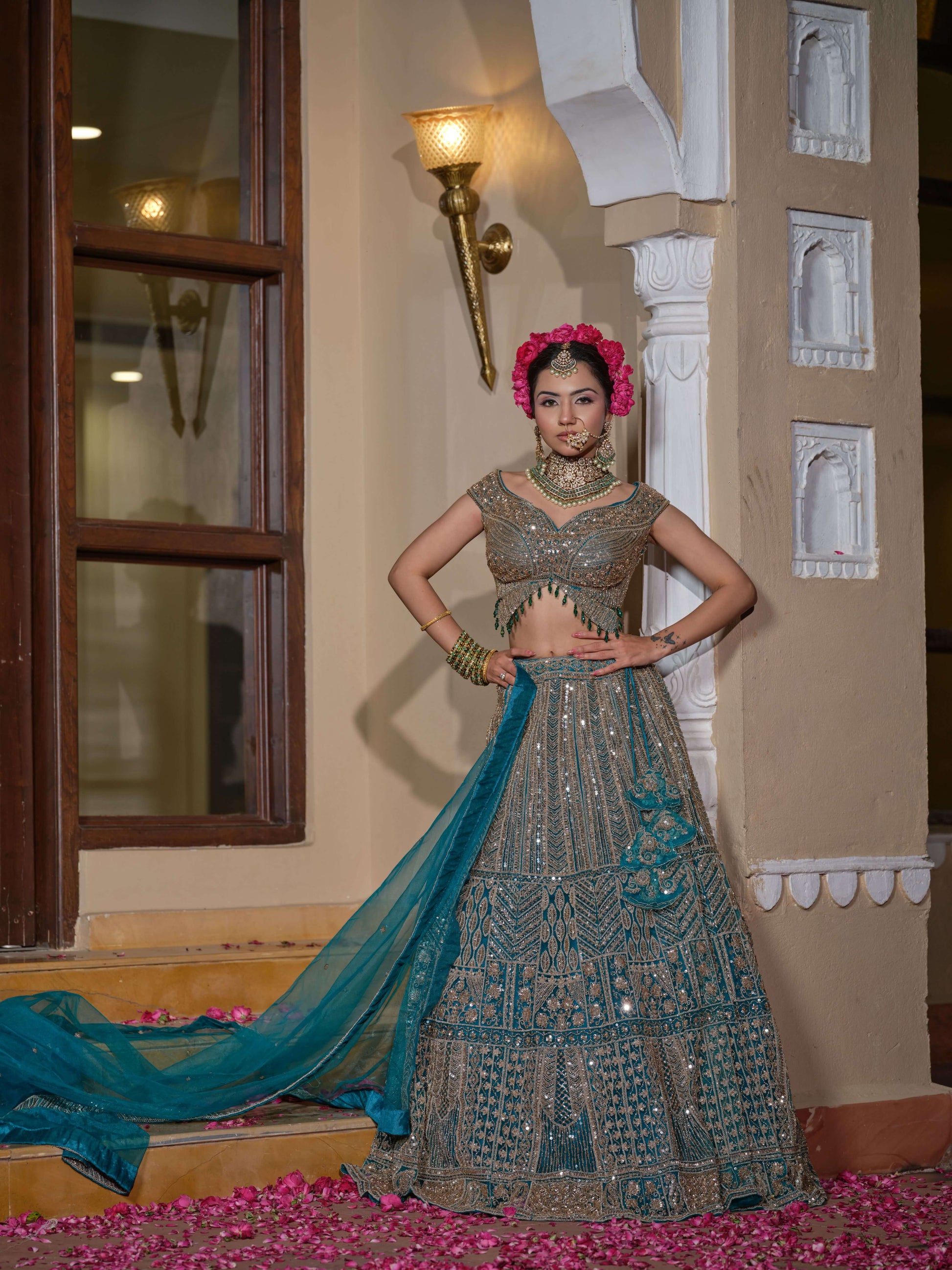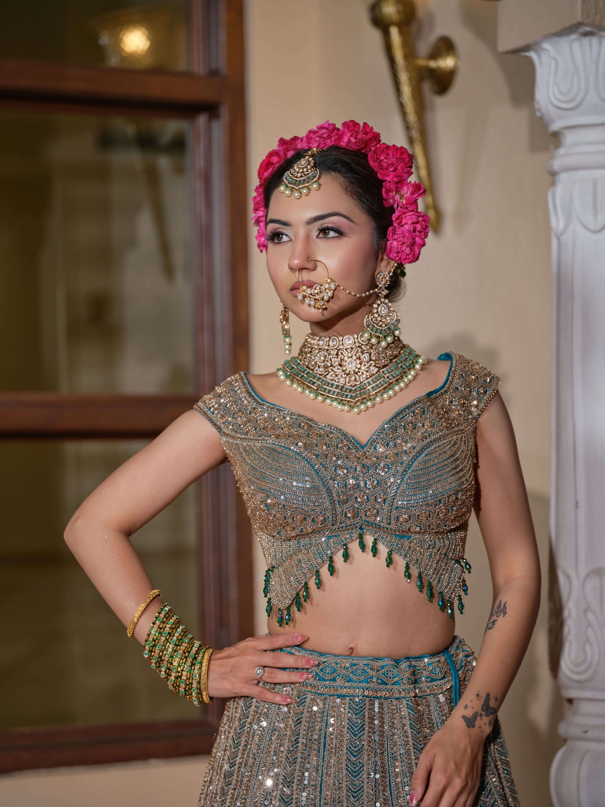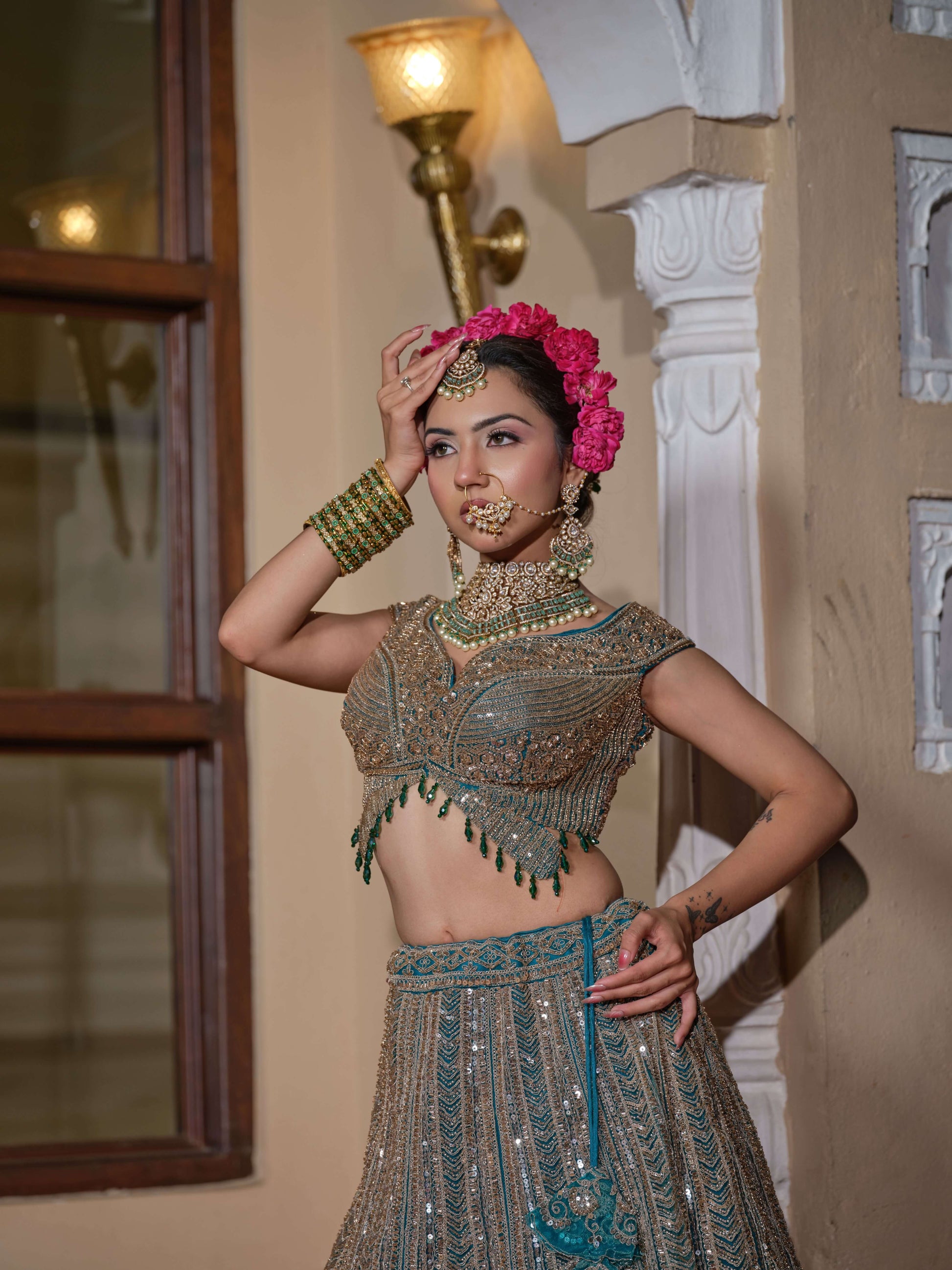 Celestial Mist is a masterpiece of modern royalty—an opulent teal blue lehenga drenched in antique gold sequins, cutdana, and hand-embroidered detailing that shimmers like stardust.
