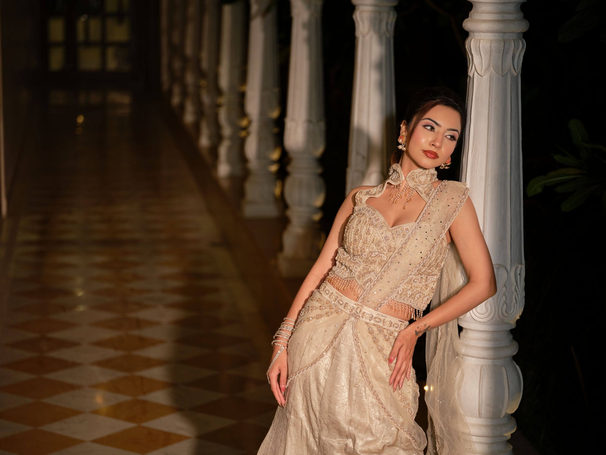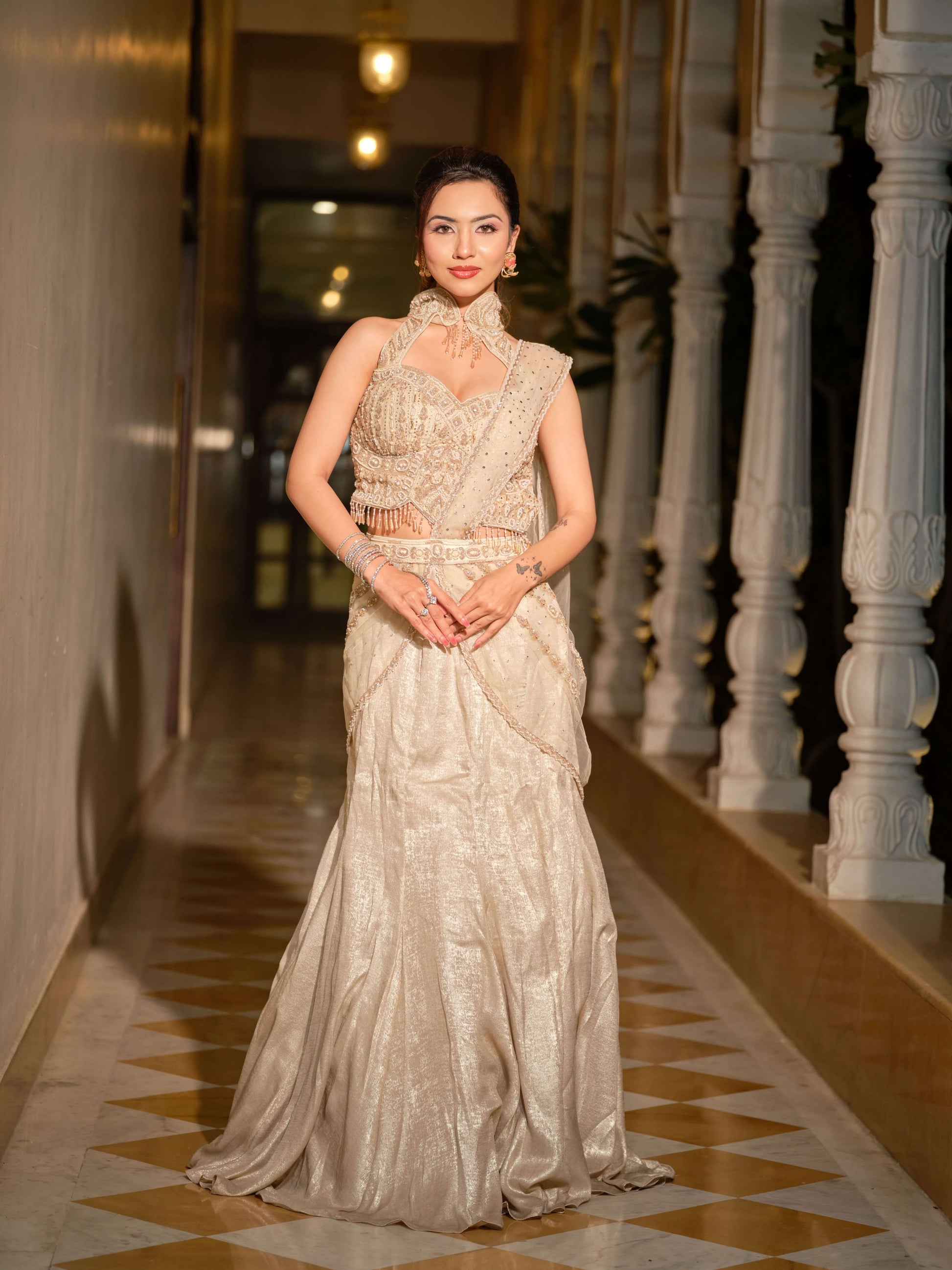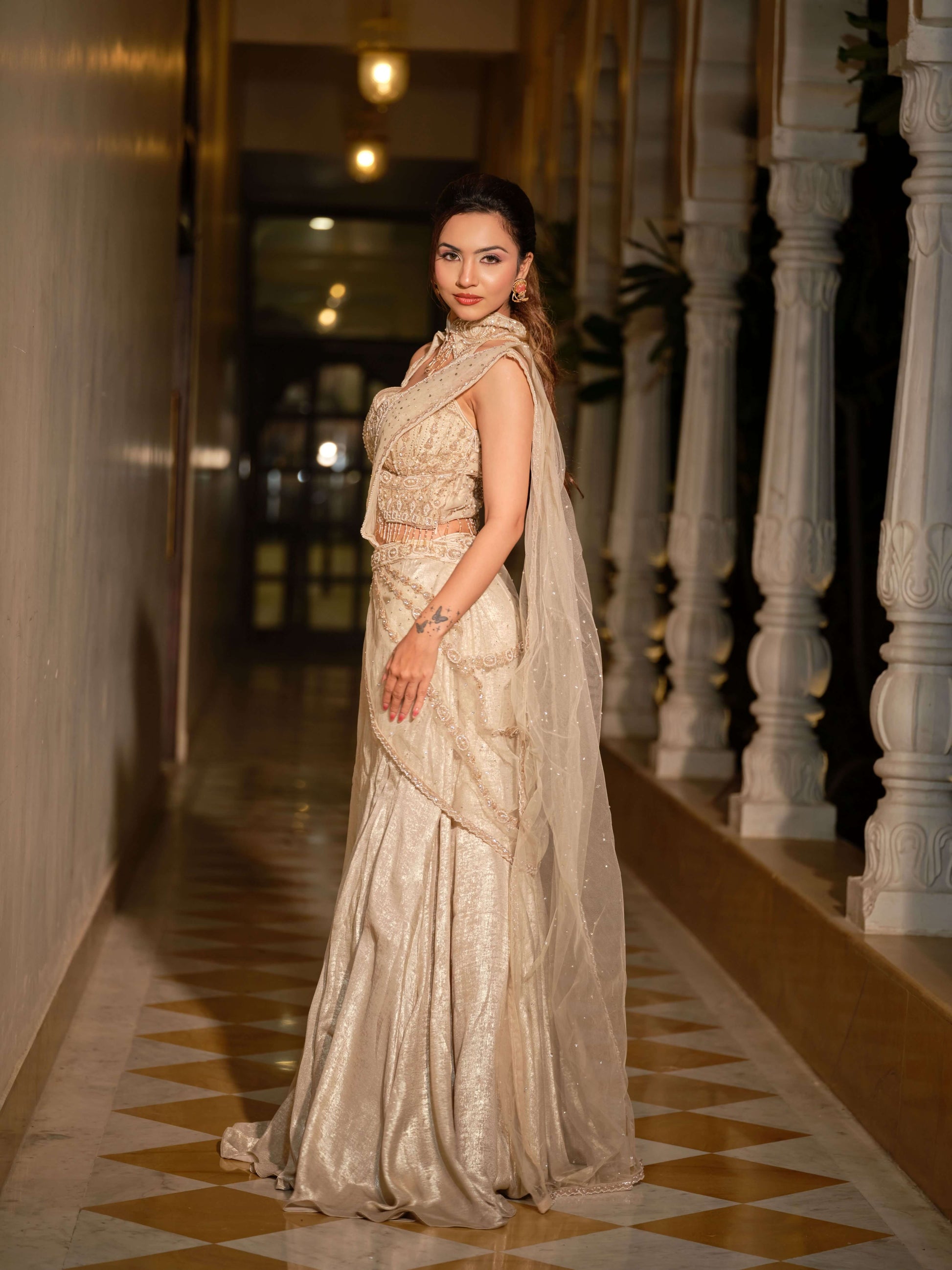 Radiate timeless sophistication in this Champagne Glow Draped Lehenga Gown, a perfect fusion of modern allure and classic grace. The ensemble features a shimmering champagne-toned base intricately embellished with delicate sequins and beadwork, lending a luminous sheen with every step. The halter-neck blouse adorned with ornate embroidery and crystal accents adds a contemporary edge, while the draped lehenga-style skirt flows effortlessly, creating a statuesque silhouette.