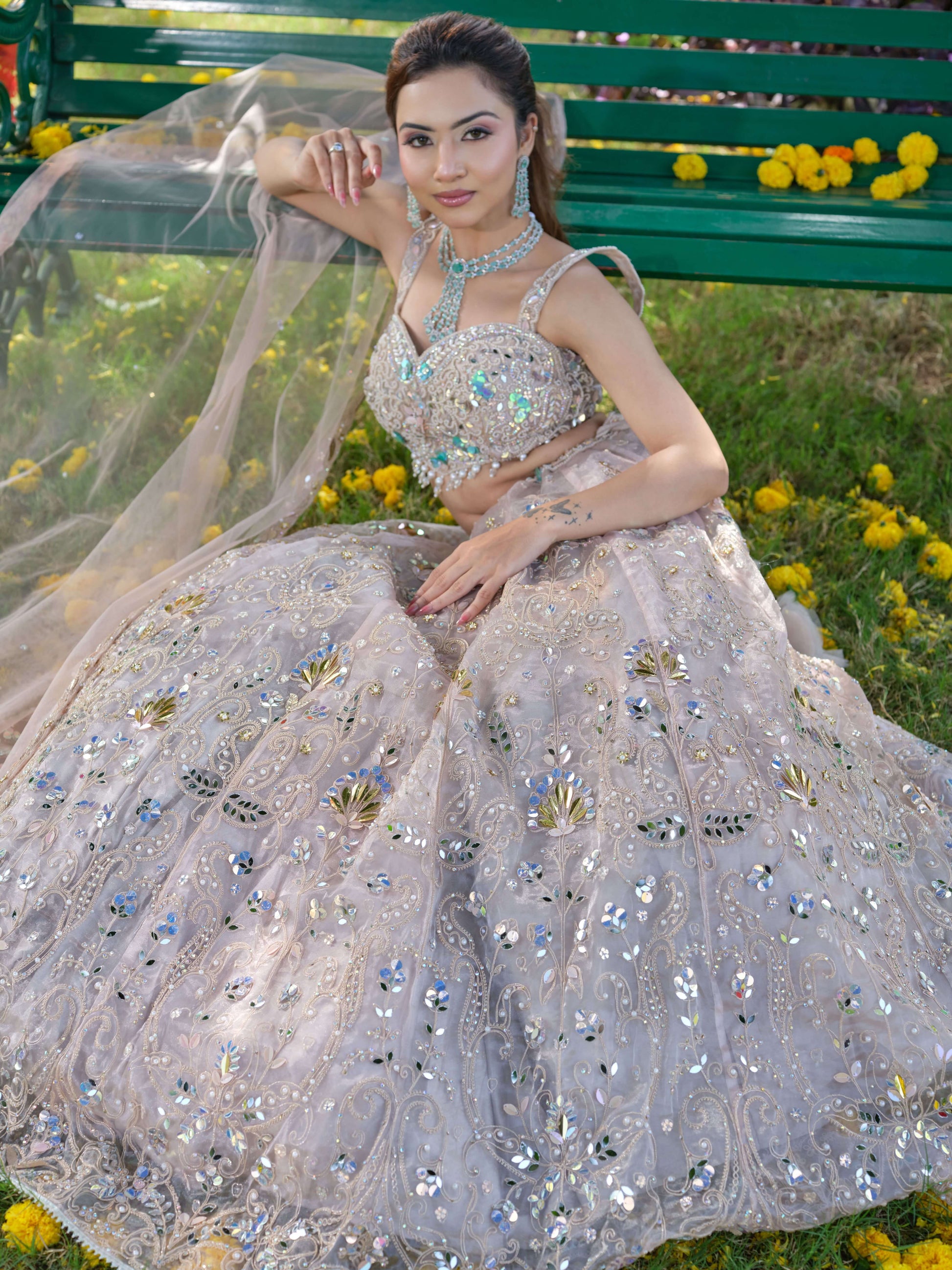 Step into timeless elegance with this intricately embroidered lehenga set, featuring a sleeveless blouse and a sheer dupatta. The ensemble dazzles in rich shades of gold and green, adorned with sequins and traditional motifs that evoke regal charm. Paired with statement jewelry and set against a lush garden backdrop, this look is a celebration of heritage and glamour.