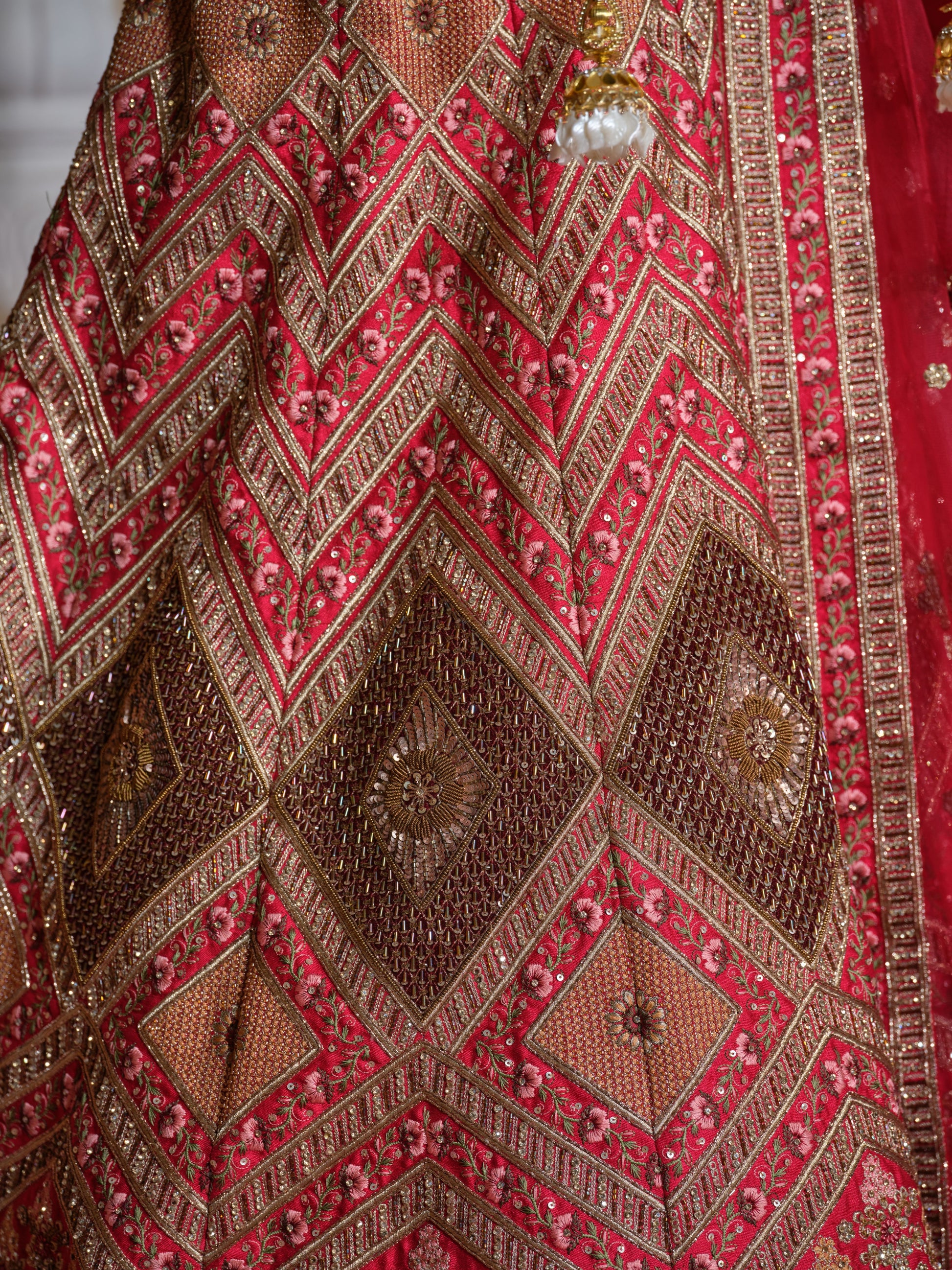 Effortlessly enchanting, the Empress of Traditions weaves together intricate patterns, zari detailing, and traditional craftsmanship. The blend of red and earthy undertones in the geometric embroidery gives the outfit a distinctive royal aura. With every swirl, it celebrates the timeless beauty of the Indian bride.