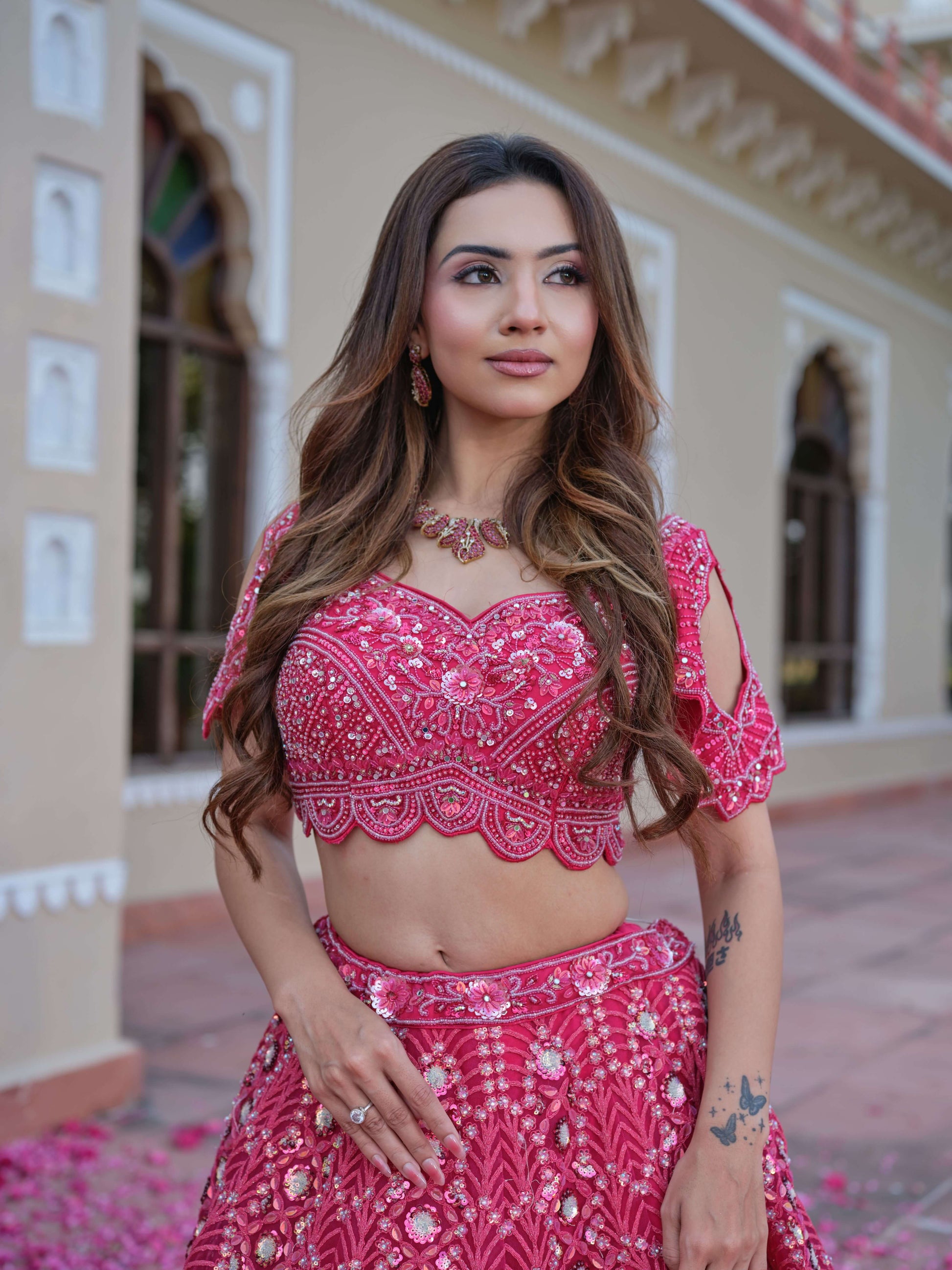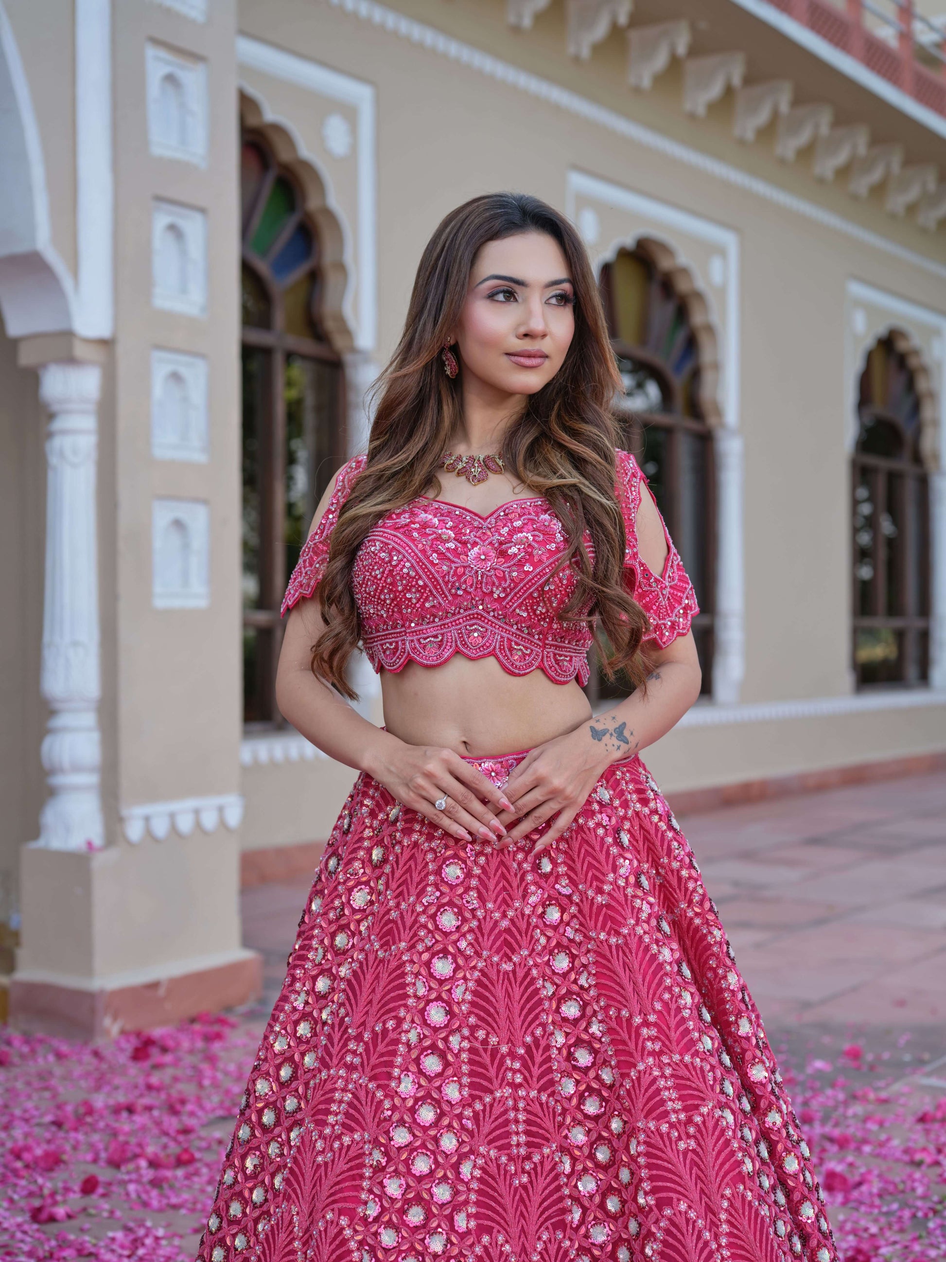A beautifully crafted fuchsia pink lehenga set featuring intricate threadwork, mirror embellishments, and delicate hand embroidery. The blouse is designed with elegant detailing and a flattering neckline, paired with a flowy embroidered skirt that adds grace to every step. Completing the look is a soft net dupatta that enhances the outfit’s feminine charm. Perfect for women who love a blend of tradition, glamour, and royalty.