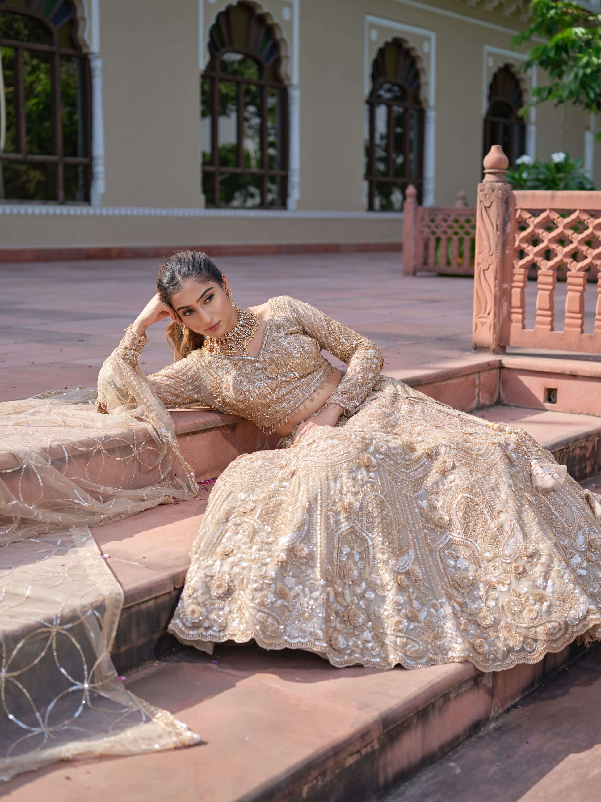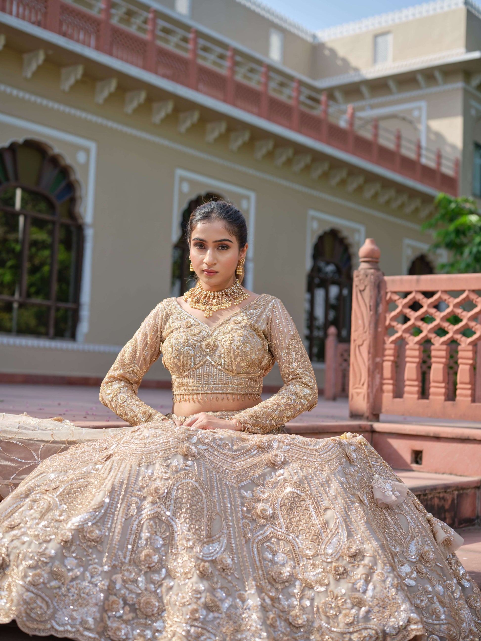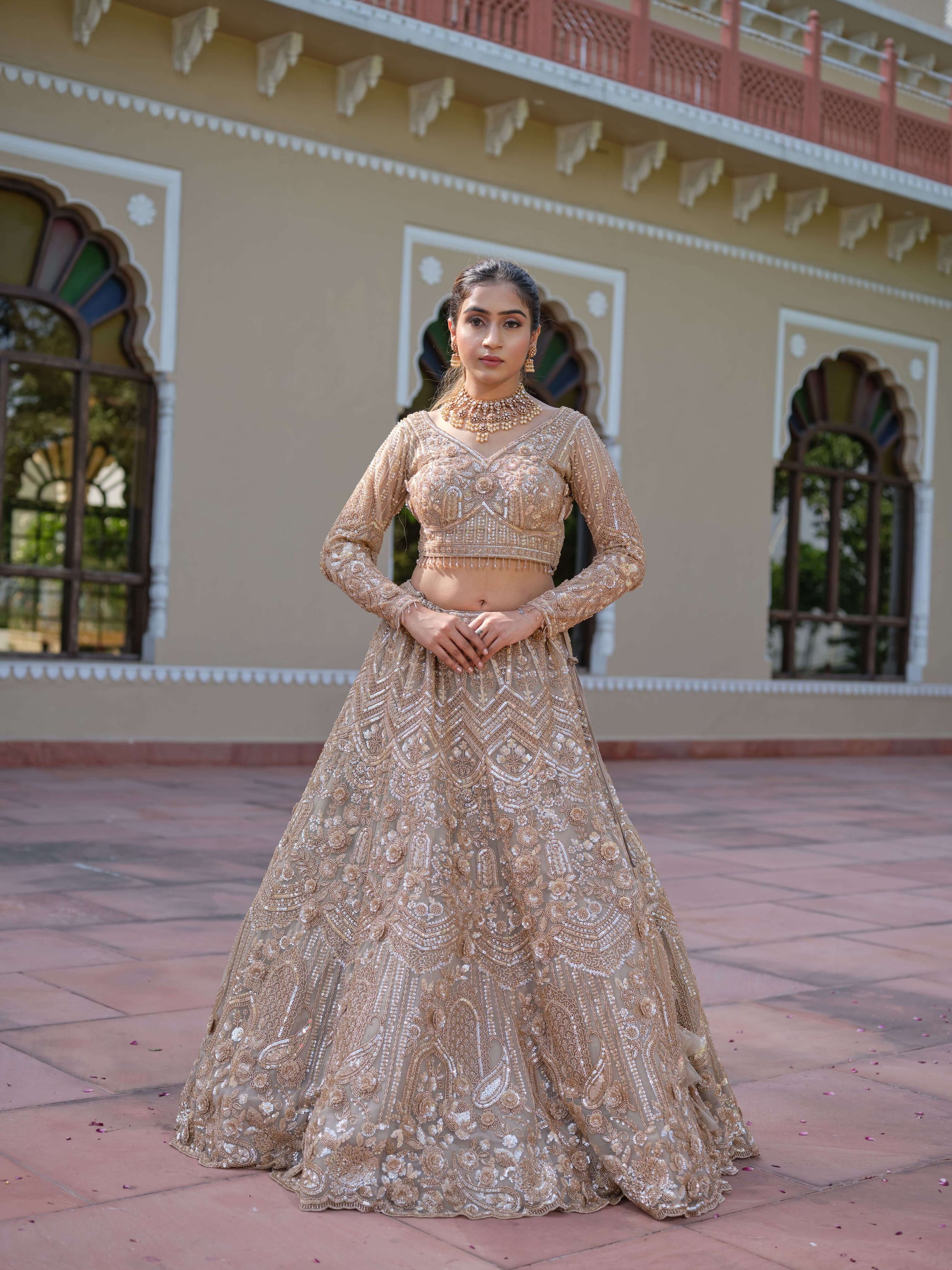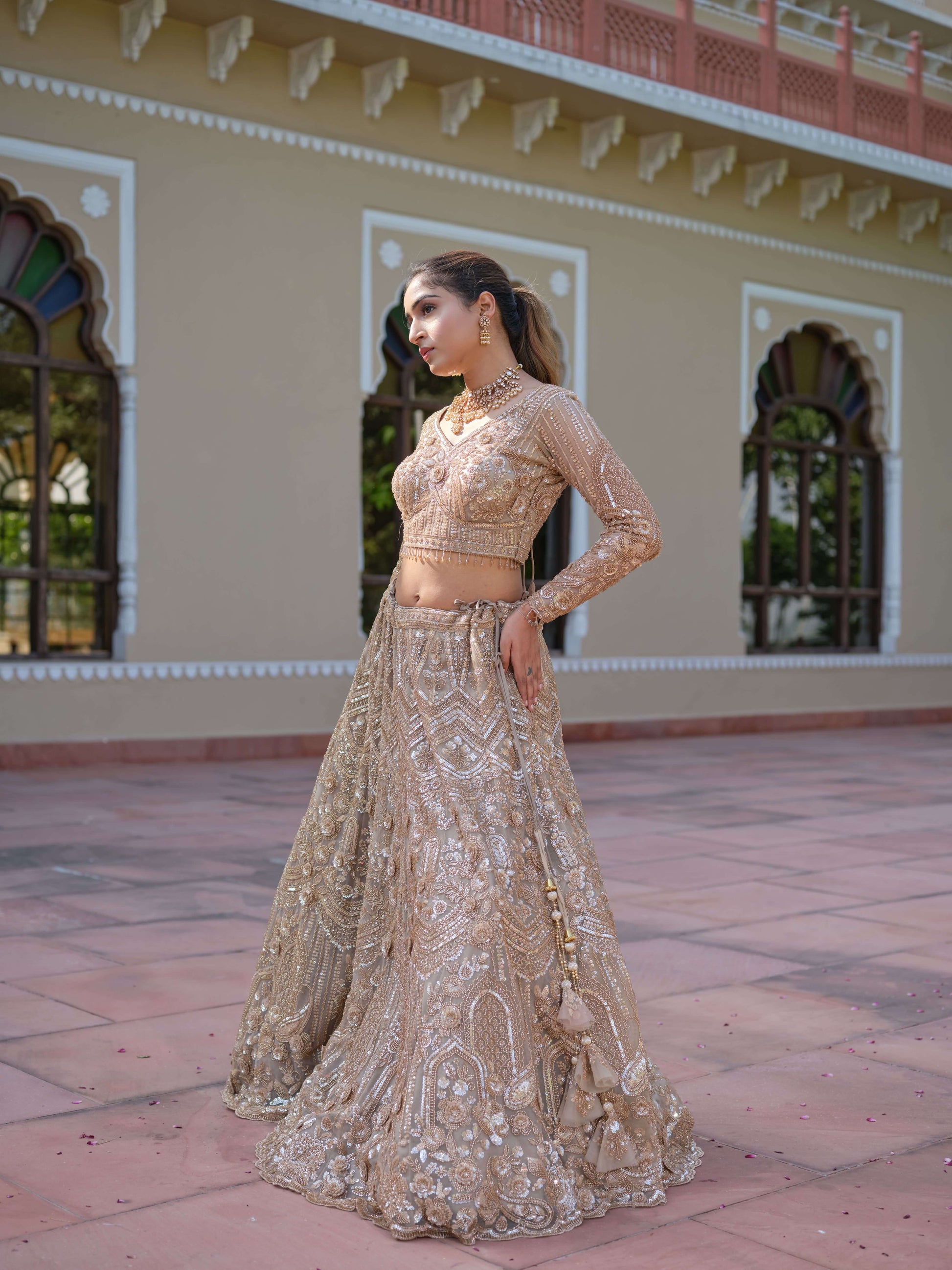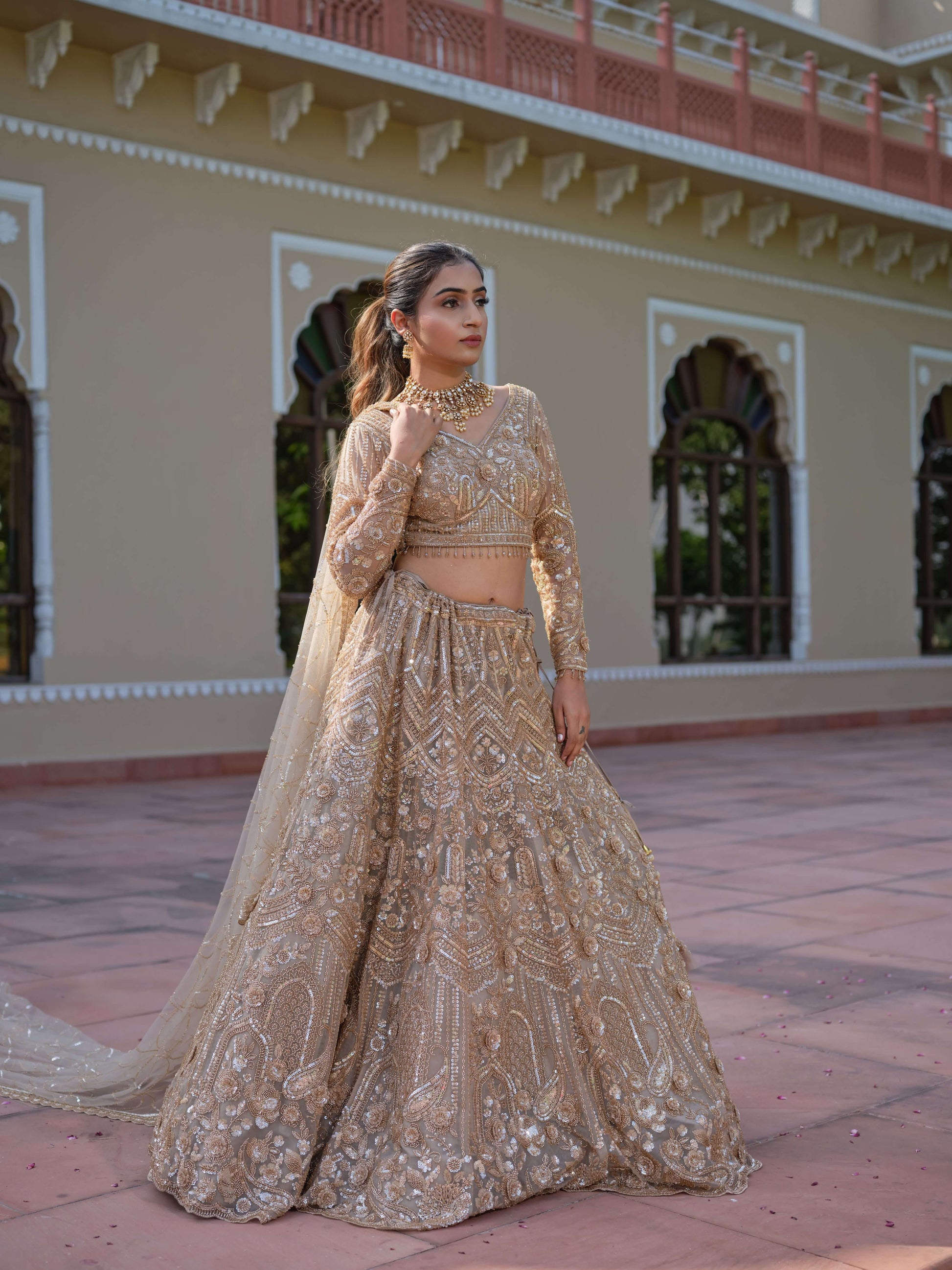 This breathtaking gold lehenga is the epitome of regal elegance and artisanal mastery. The ensemble is richly embellished with intricate handwork, featuring dense zari embroidery, shimmering sequins, beads, and pearls that create a three-dimensional texture across the entire silhouette. The detailed motifs flow seamlessly from the blouse to the voluminous skirt, forming a luxurious tapestry of gold craftsmanship.