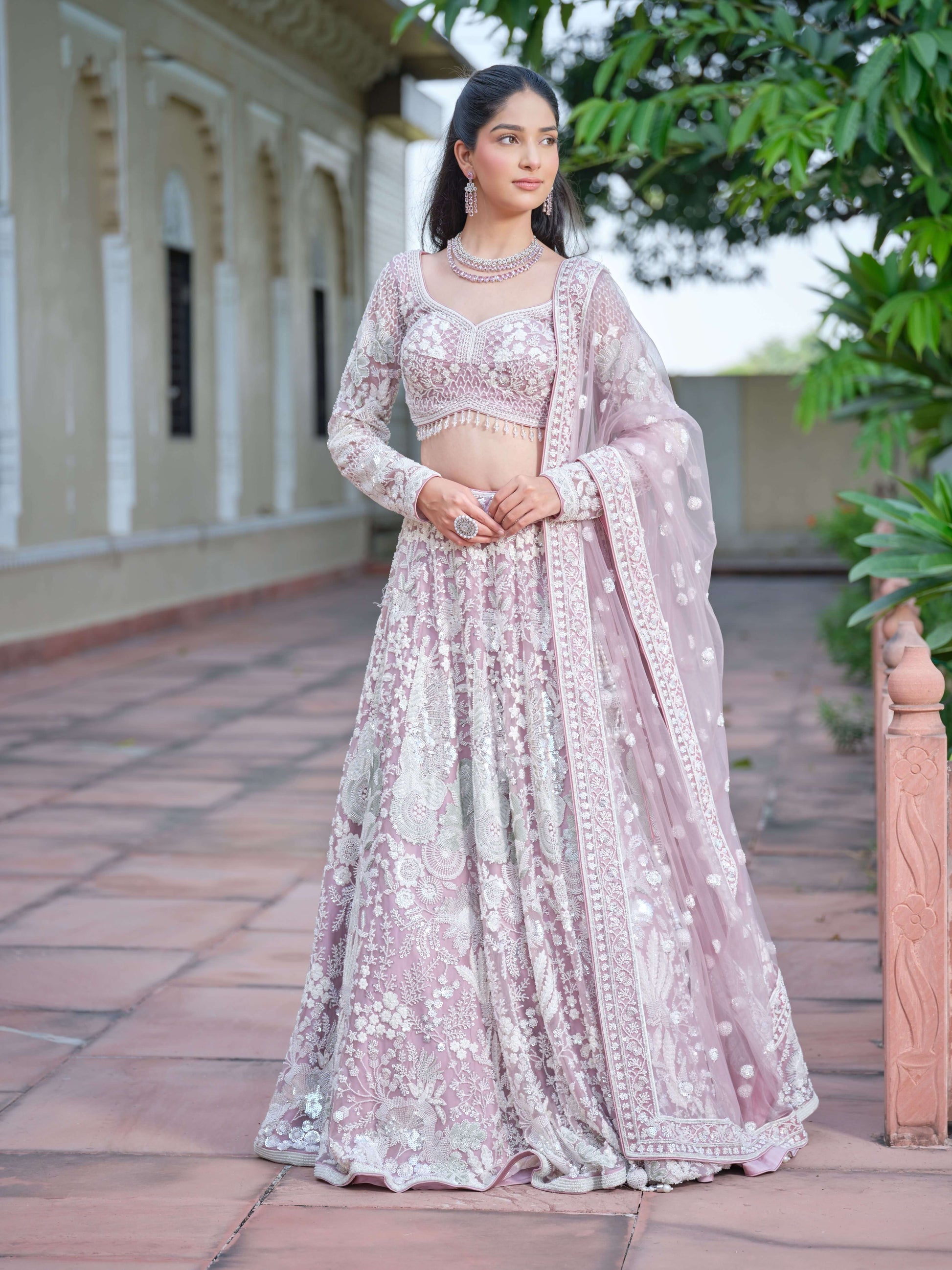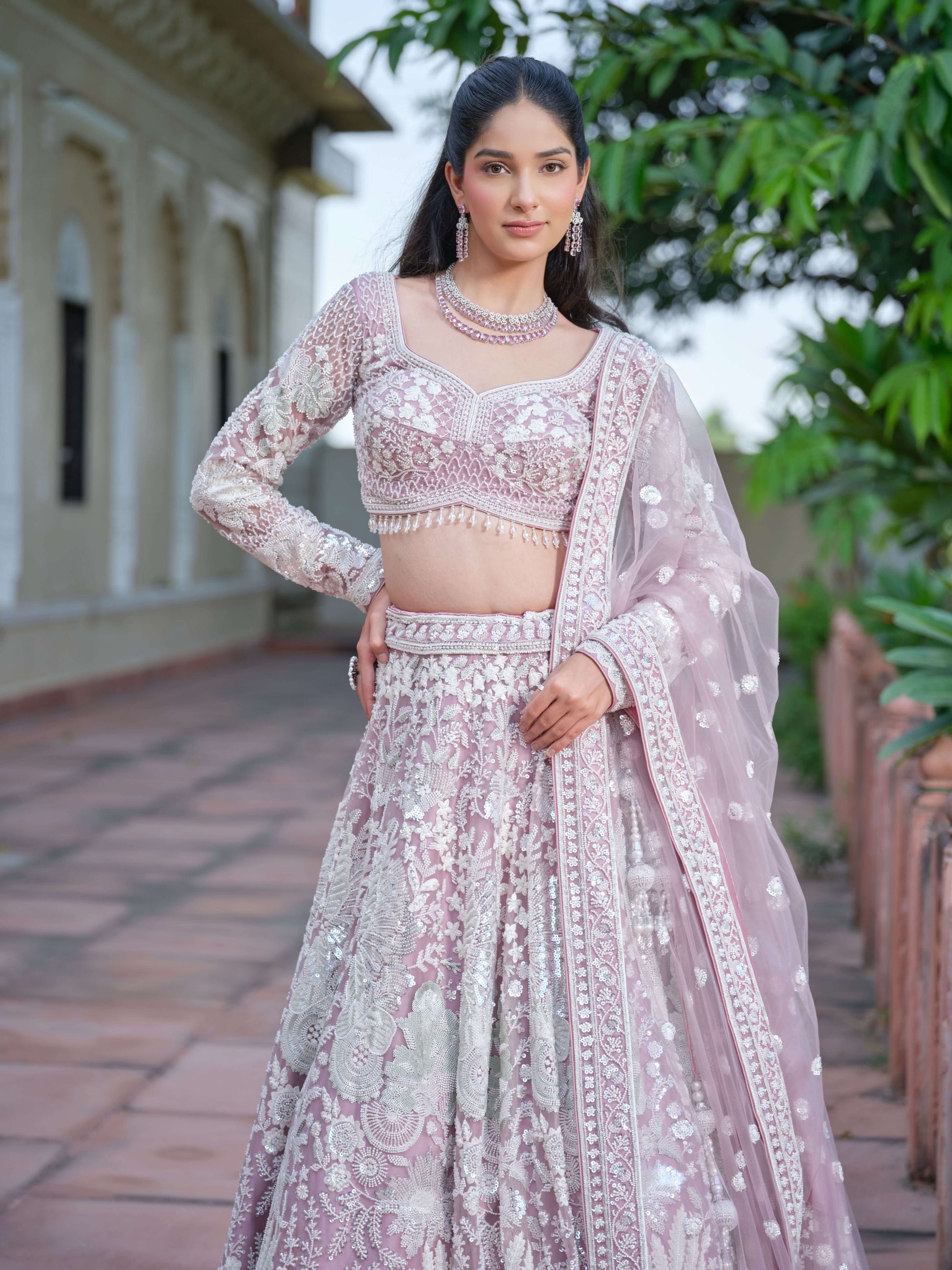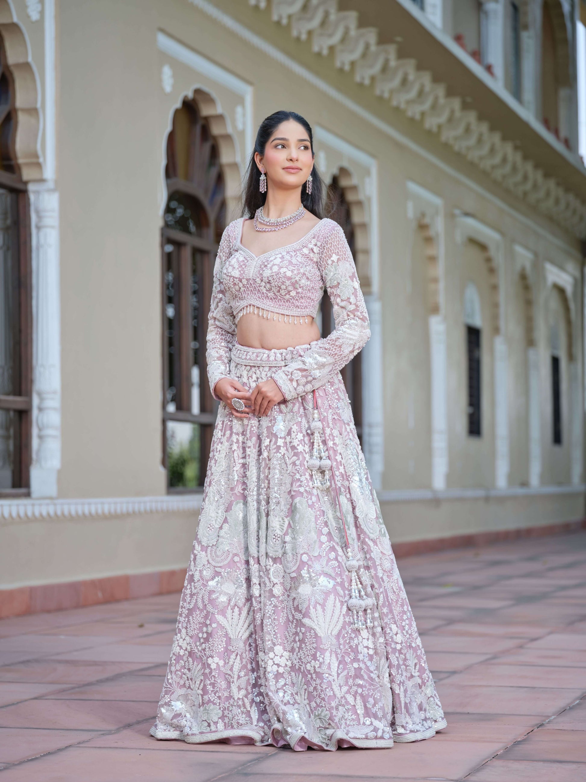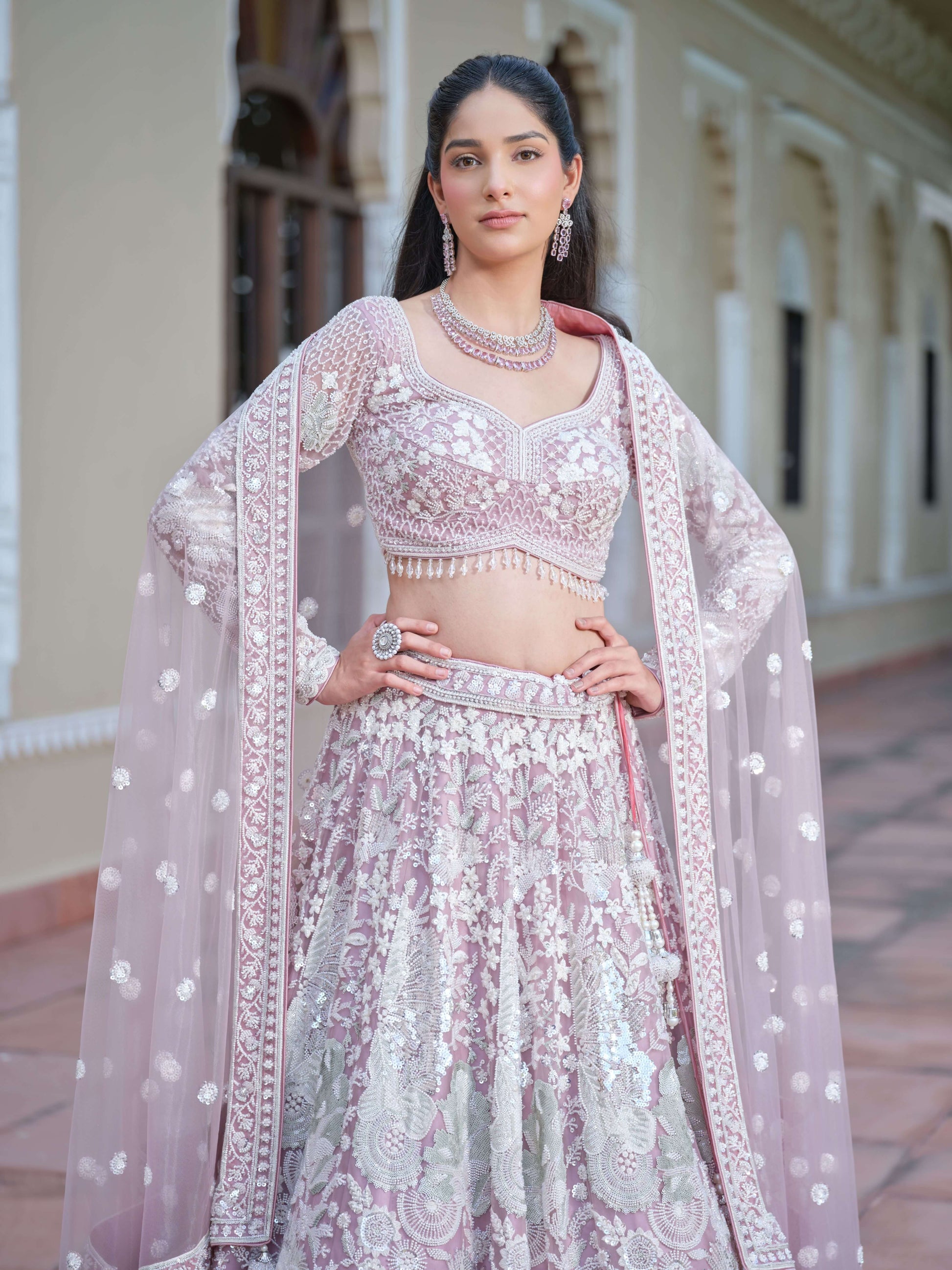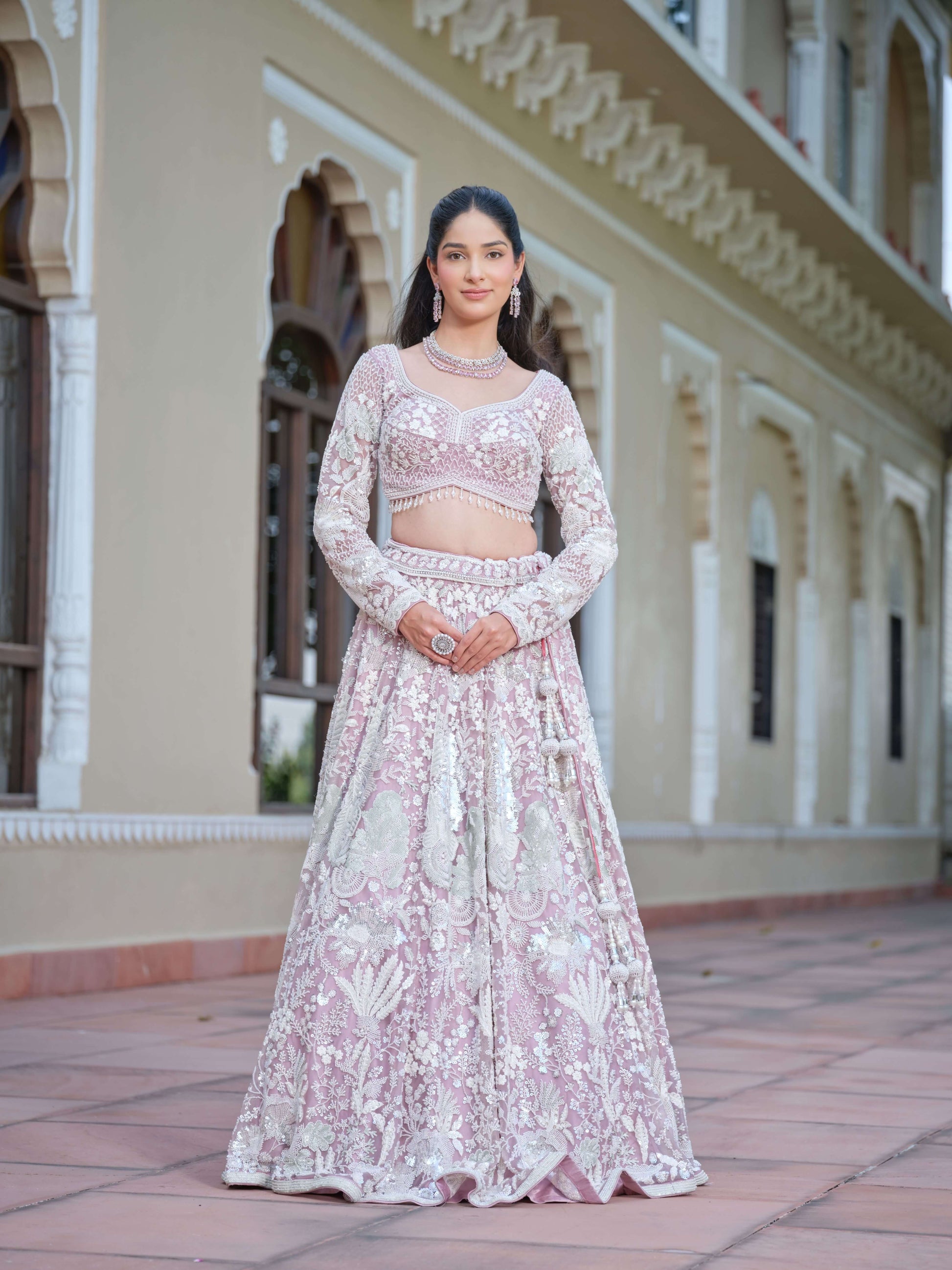 Subtle shimmer meets soft sophistication in the Pearl Fantasy Ensemble. With its pastel canvas, intricate embroidery, and contemporary silhouette, this outfit strikes the perfect balance between tradition and trend — designed for the bride who shines effortlessly.