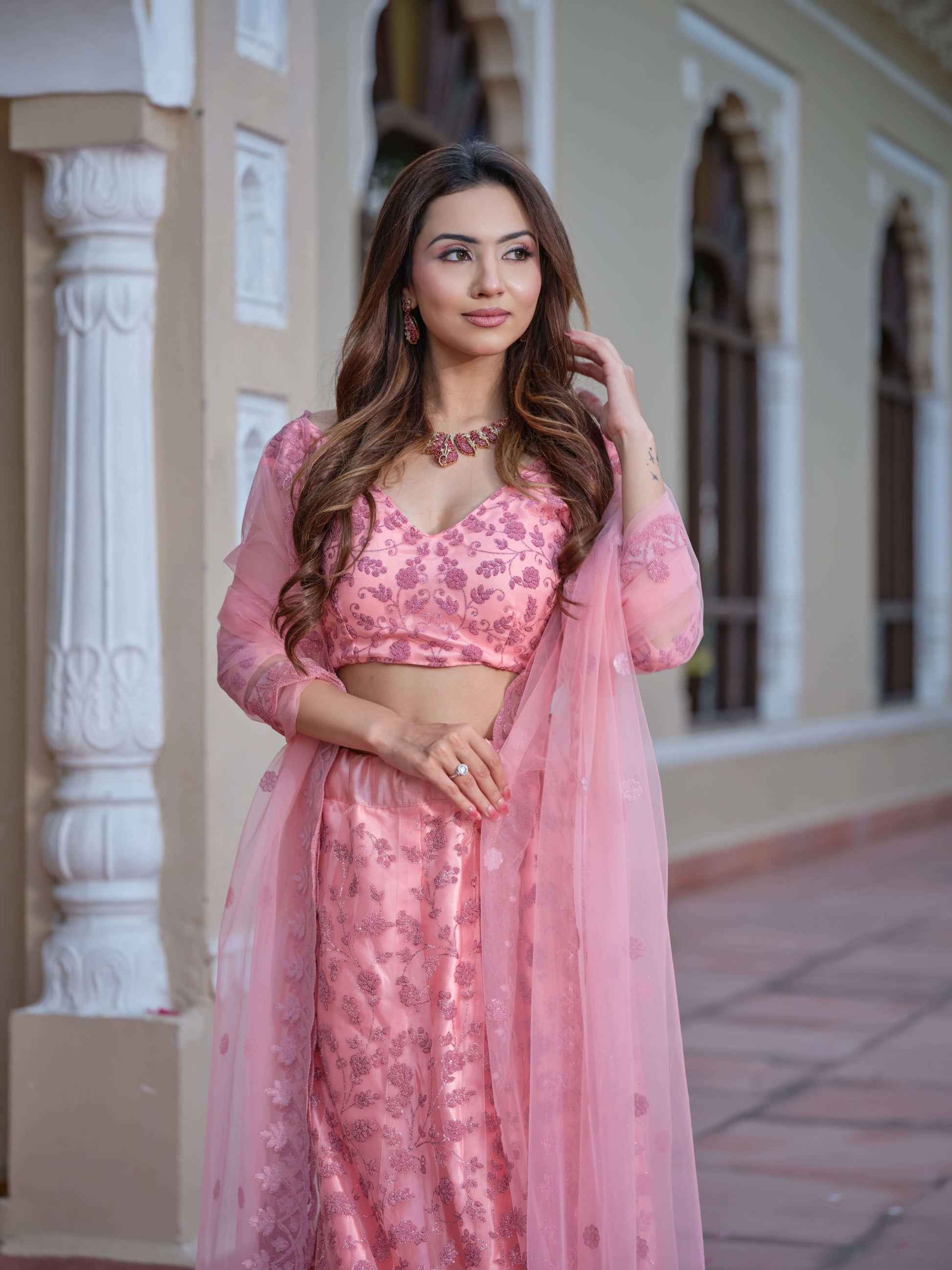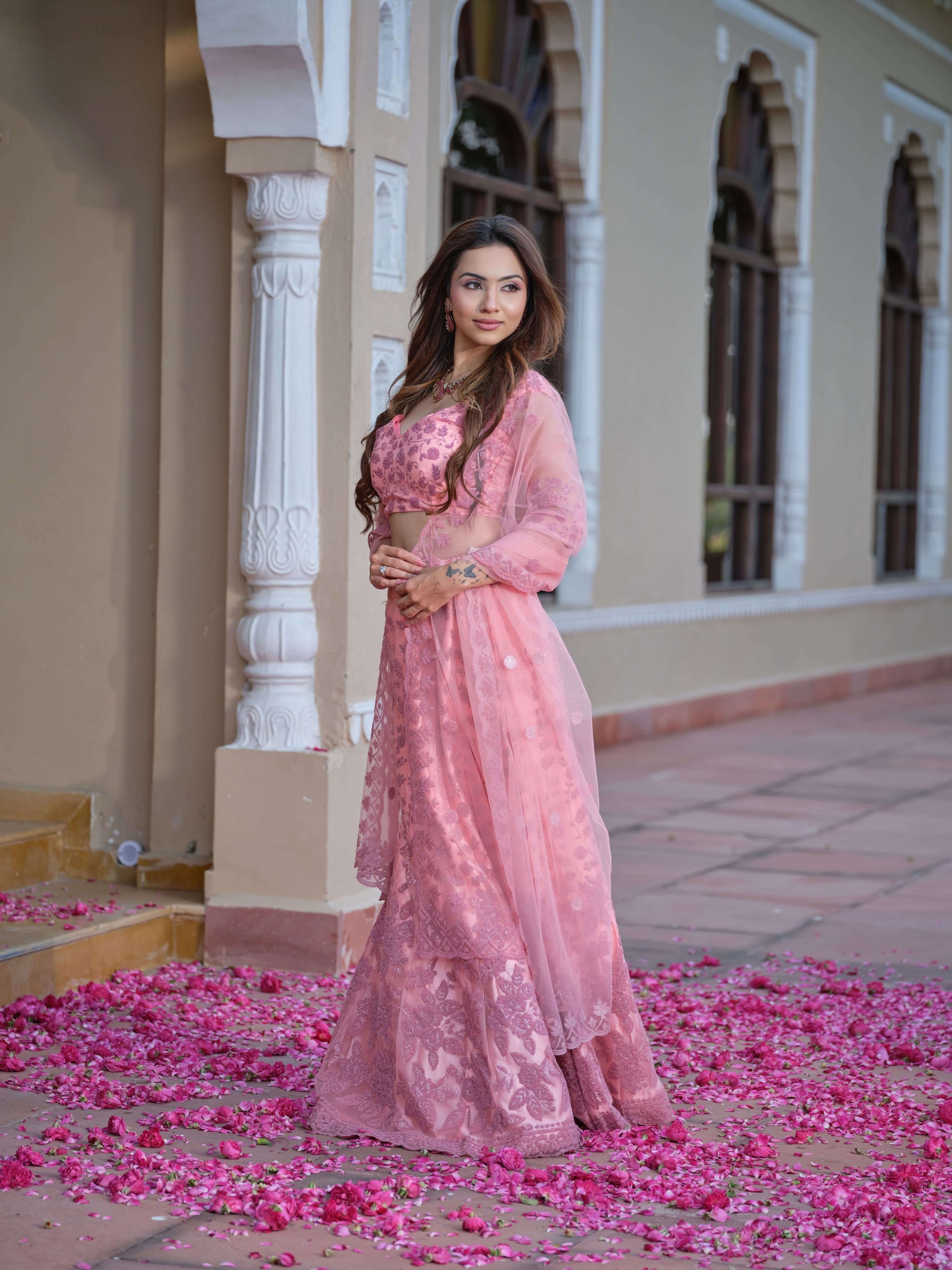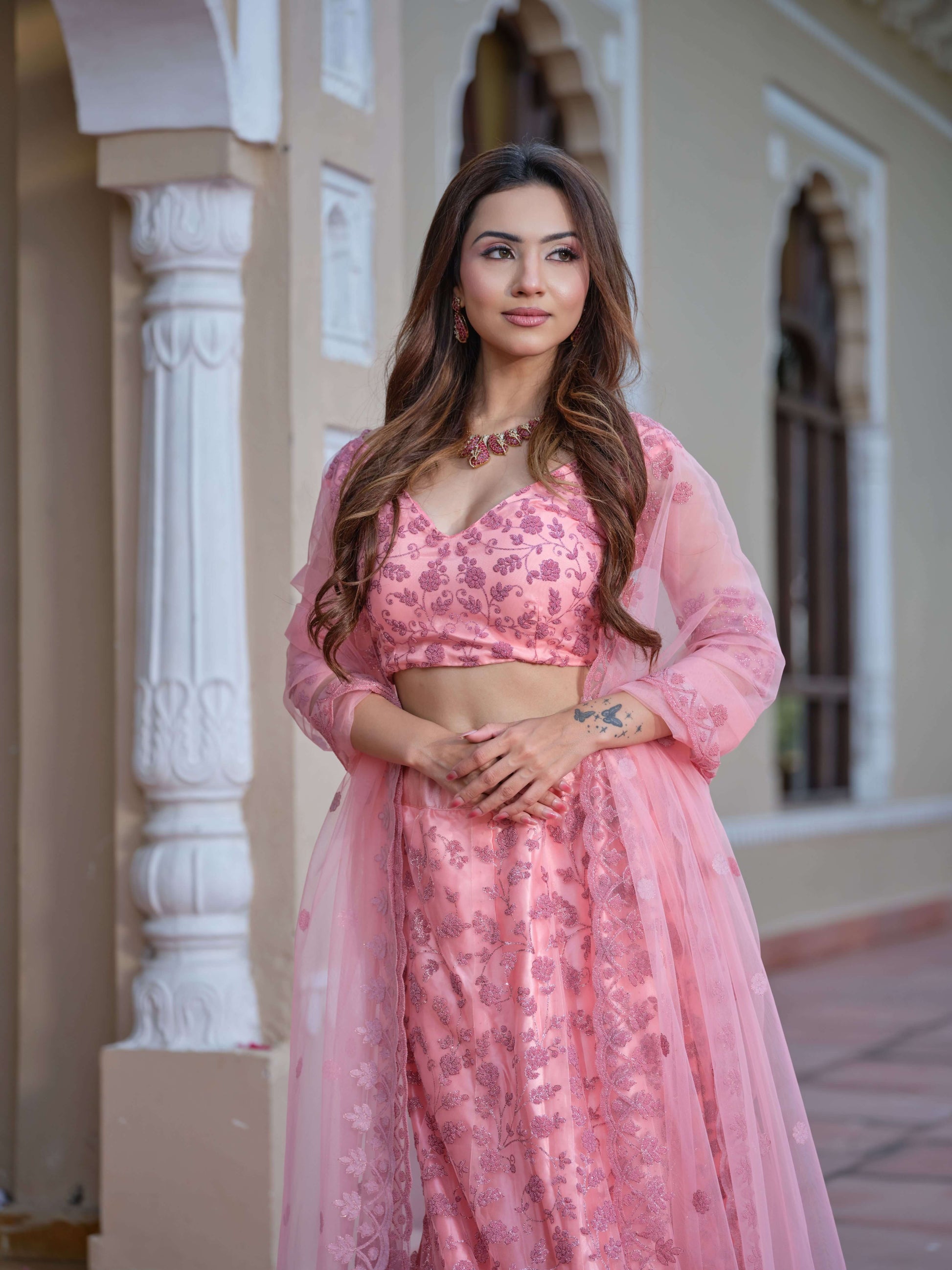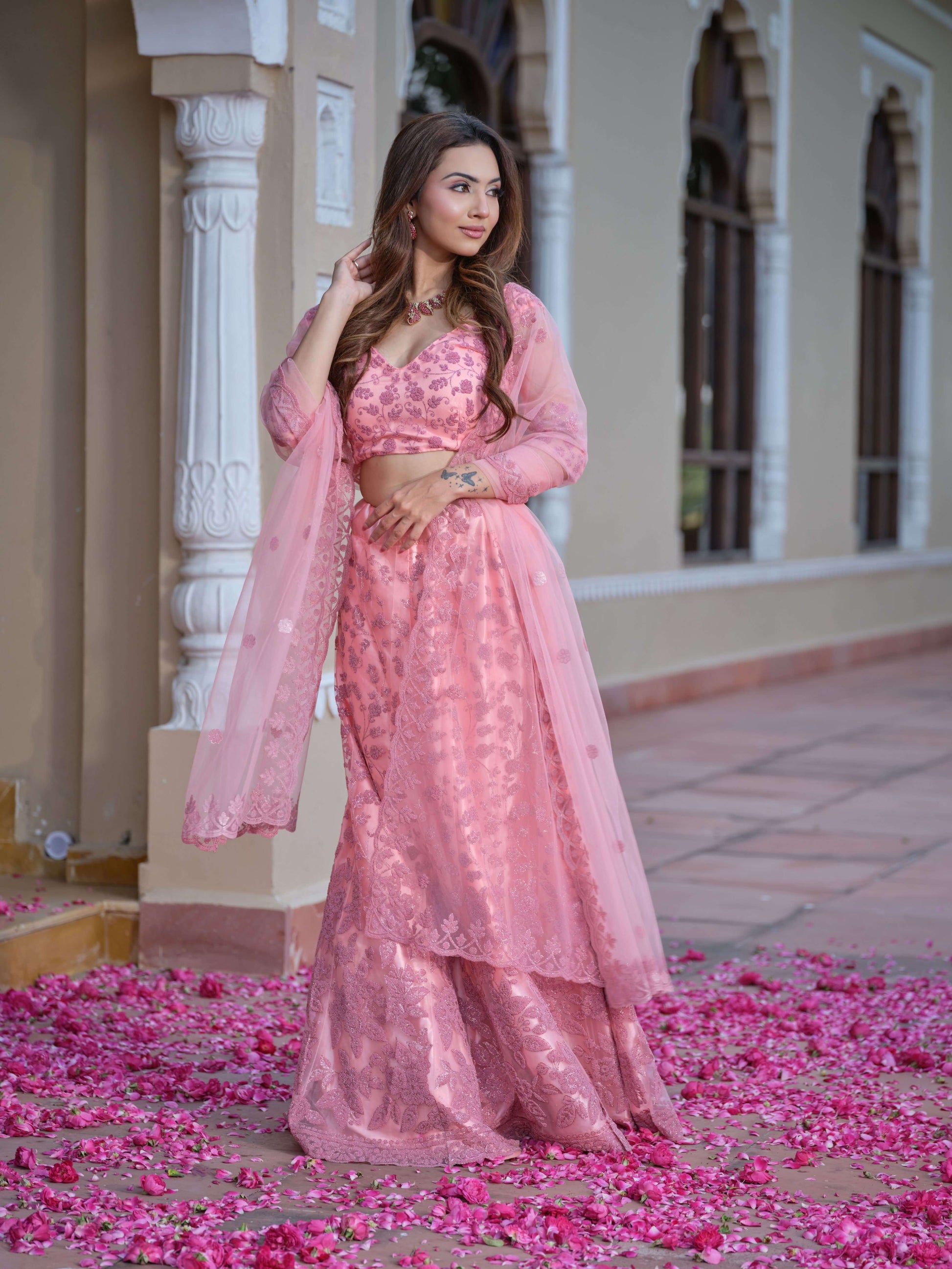 Step into a dream with the Petal Whisper, a celebration of femininity and grace. This blush pink ensemble features a shimmering floral pattern that dances with every step, complemented by a sheer dupatta adorned with delicate embellishments.