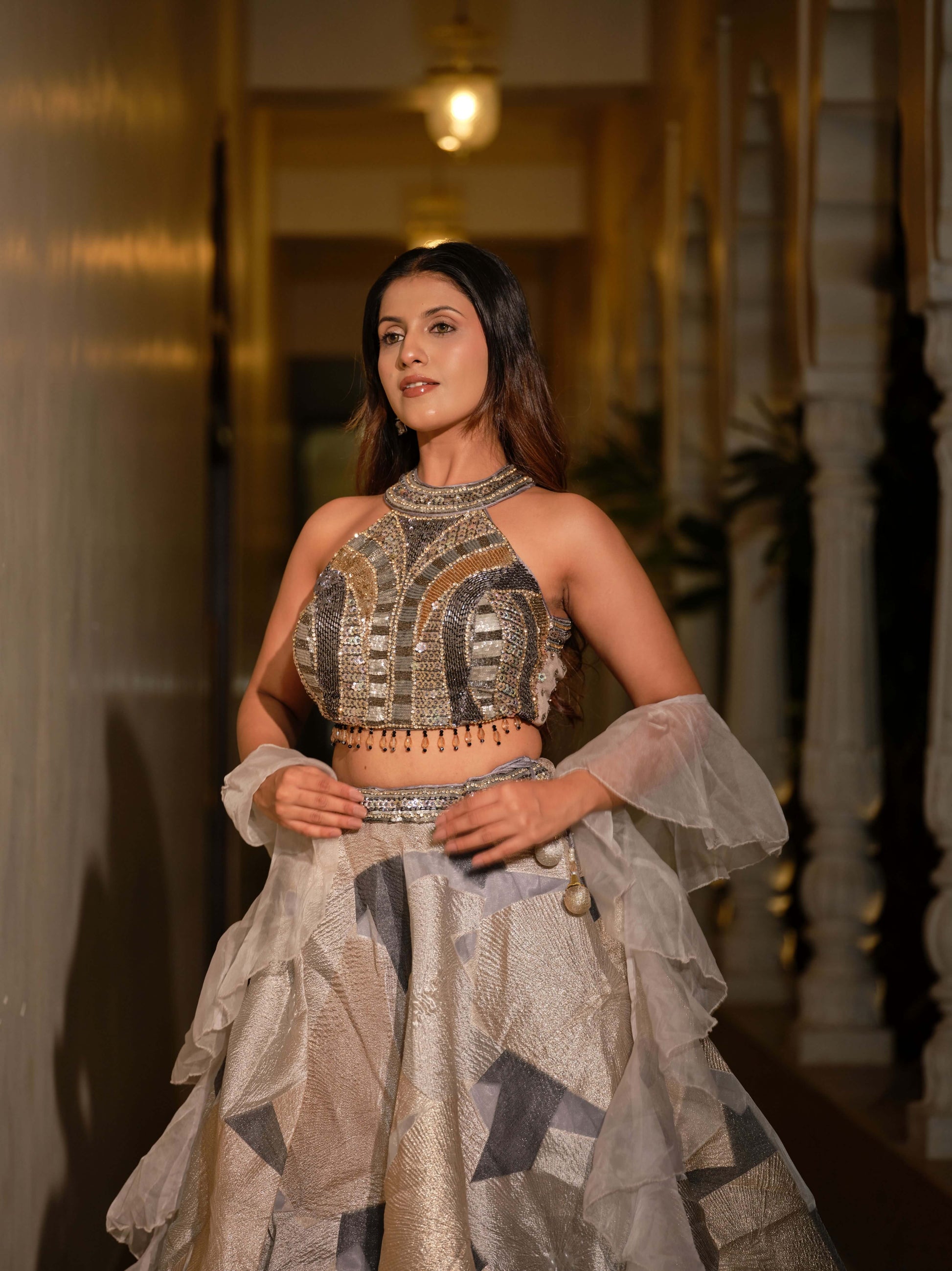 A bold play of shimmer and structure, the Royal Metallic Charm is crafted for the fearless trendsetter. With a beaded halter bodice and a metallic abstract skirt, this look merges couture craftsmanship with architectural fluidity — perfect for fashion galas or evening grandeur.