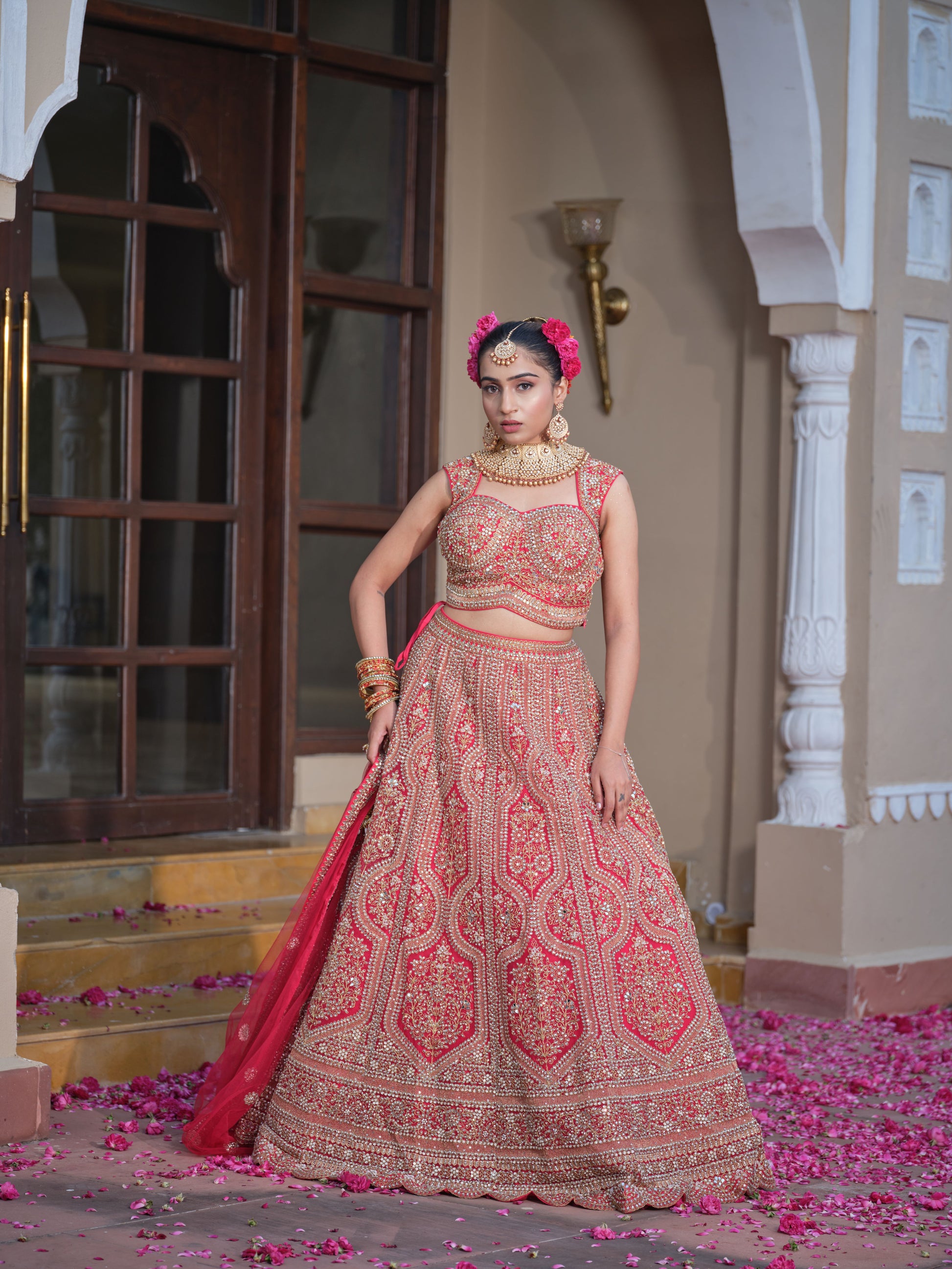 Royal Rose is a breathtaking bridal ensemble that embodies the grandeur of traditional Indian weddings. This lehenga choli is crafted in a rich red hue, adorned with intricate gold embroidery that shimmers with regal elegance. The heavily embellished skirt flows gracefully, paired with a matching blouse that echoes the ornate detailing. A sheer red dupatta, delicately draped over one shoulder, adds a touch of ethereal charm. Complementing the outfit is a full set of traditional jewelry, including a choker necklace, maang tikka, earrings, and bangles, enhancing the bride’s majestic presence. The hairstyle is neatly arranged and decorated with soft pink flowers, harmonizing beautifully with the pink petals scattered underfoot. Set against a heritage-style backdrop, Royal Rose evokes the timeless beauty and cultural richness of royal Indian ceremonies, making it the perfect choice for weddings, receptions, or festive celebrations.