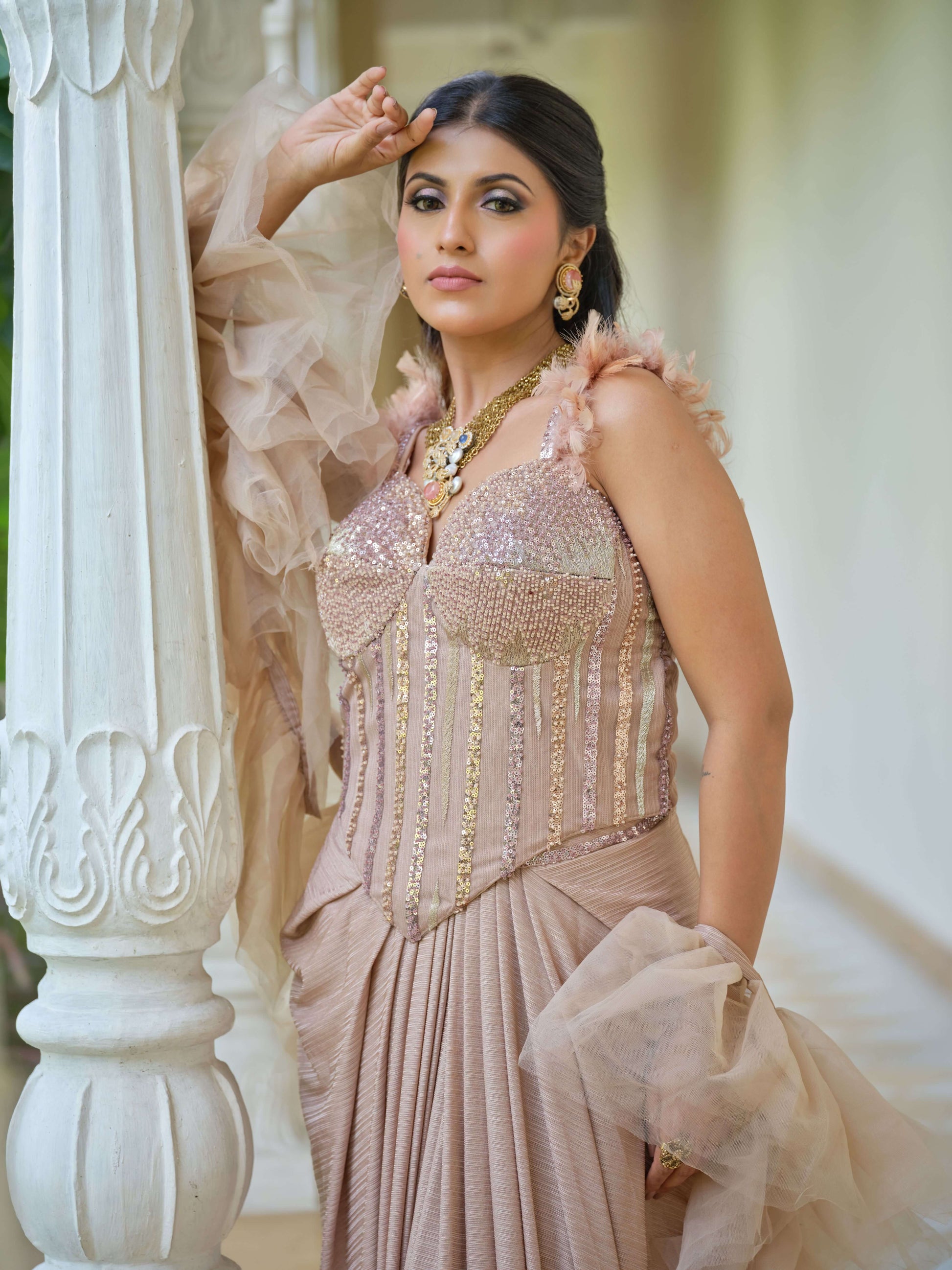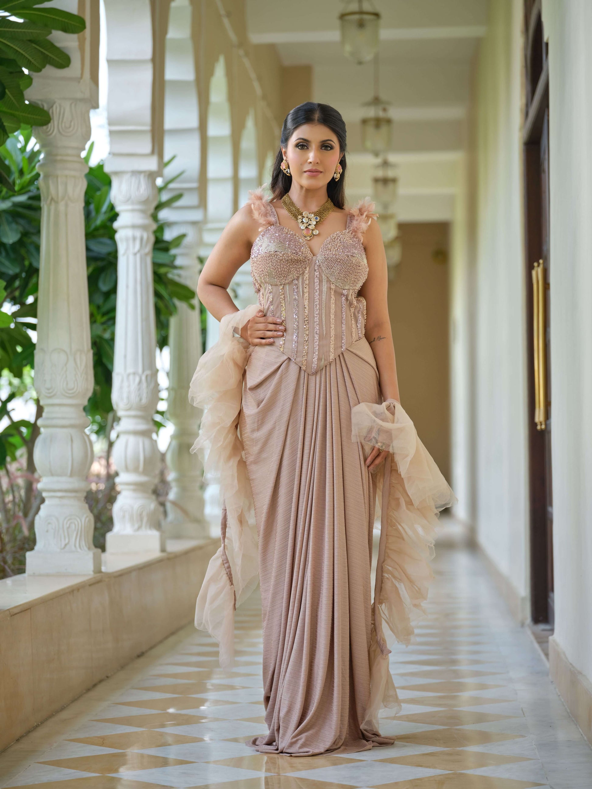 A luxurious champagne-blush drape saree fused with a sculpted corset blouse, adorned with shimmering beadwork and soft feathered accents on the shoulders and pallu. The structured bodice enhances the silhouette, while the fluid drape adds softness and elegance. Perfect for modern bridesmaids, cocktail parties, sangeet glam, receptions, and high-fashion soirée looks—this ensemble blends sensuality with couture charm.