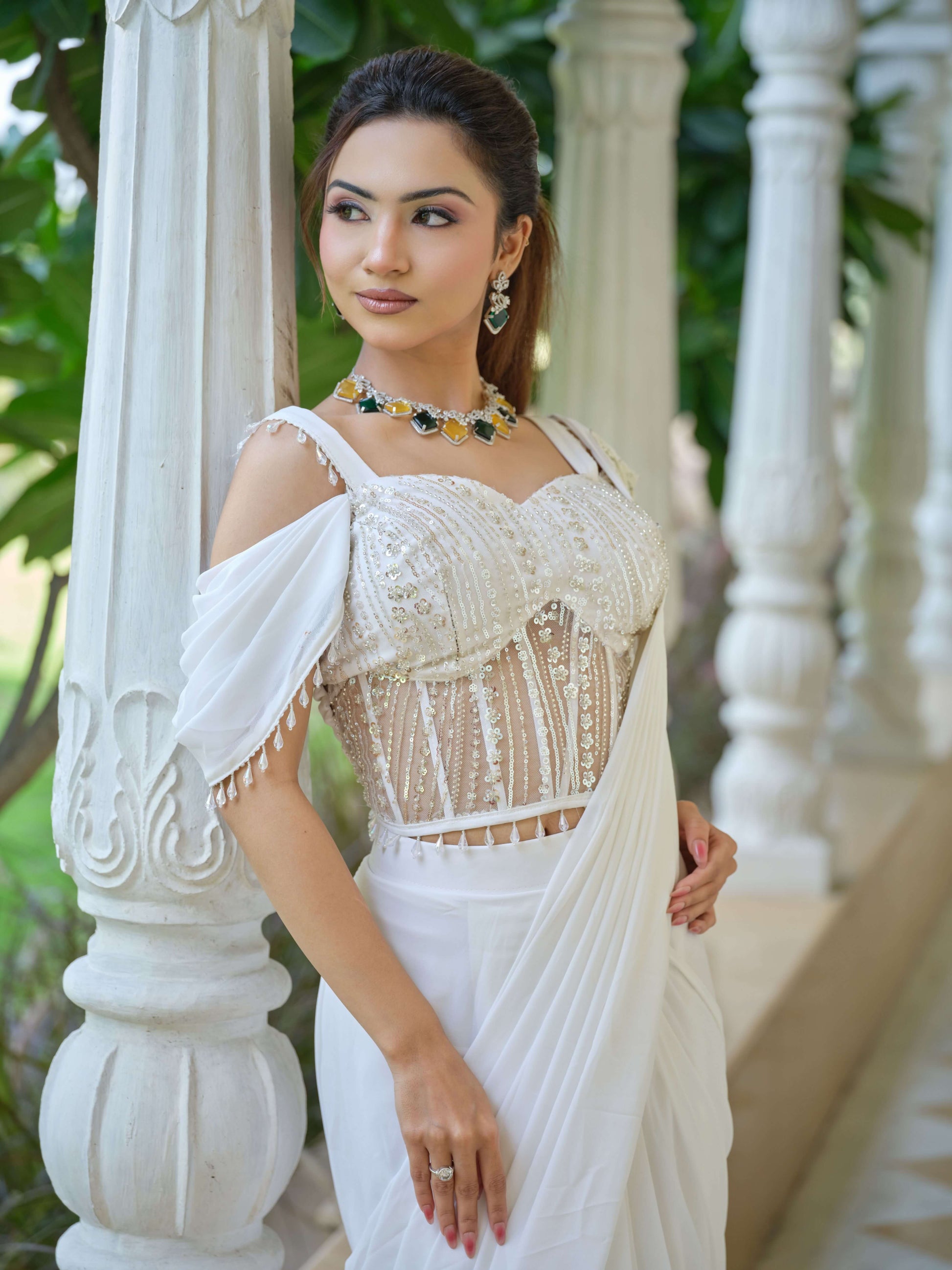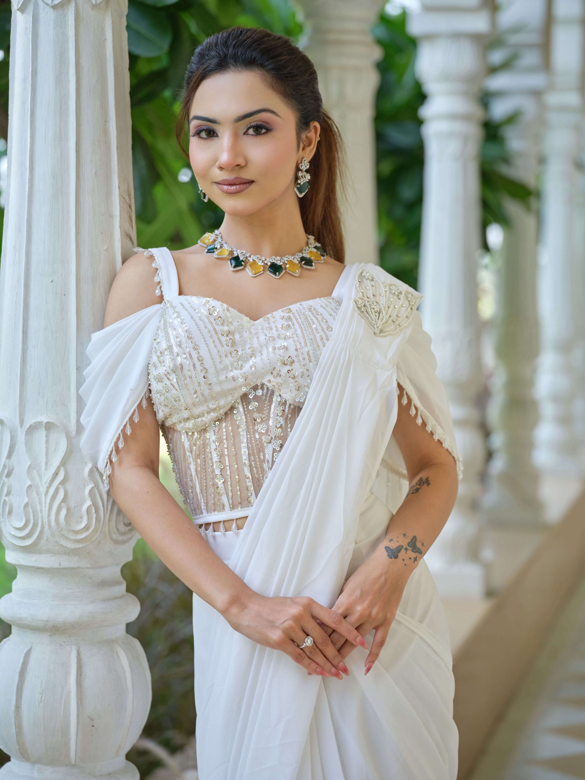 A breathtaking white drape ensemble that blends the grace of a saree with the modern charm of a structured, pearl-and-sequin embellished corset blouse. The delicate shoulder detailing, sheer paneling, and dreamy flow of the drape create an angelic, fairy-like aura. Perfect for those who love elegance with a contemporary twist, this outfit radiates purity, luxury, and effortless sophistication.