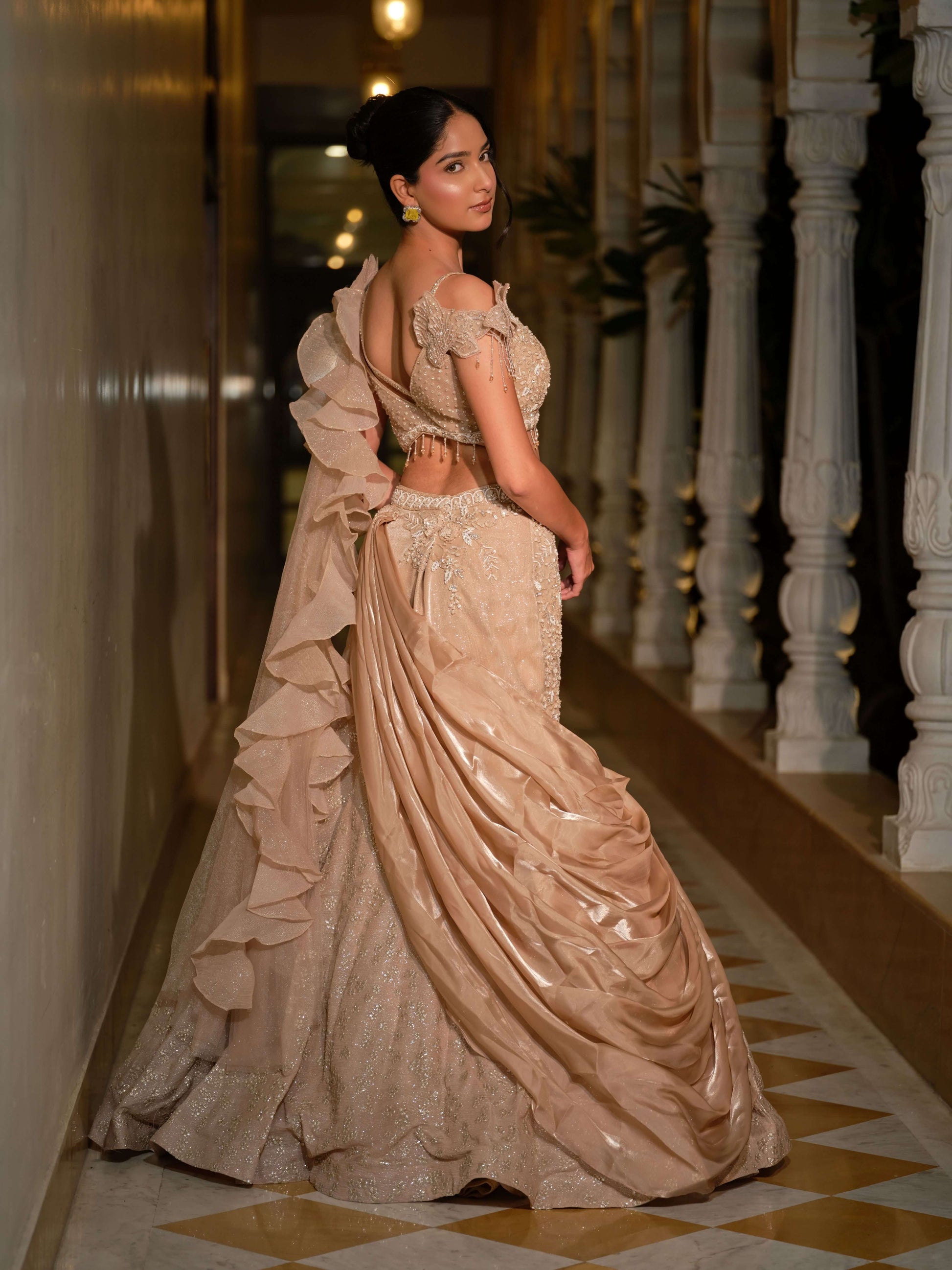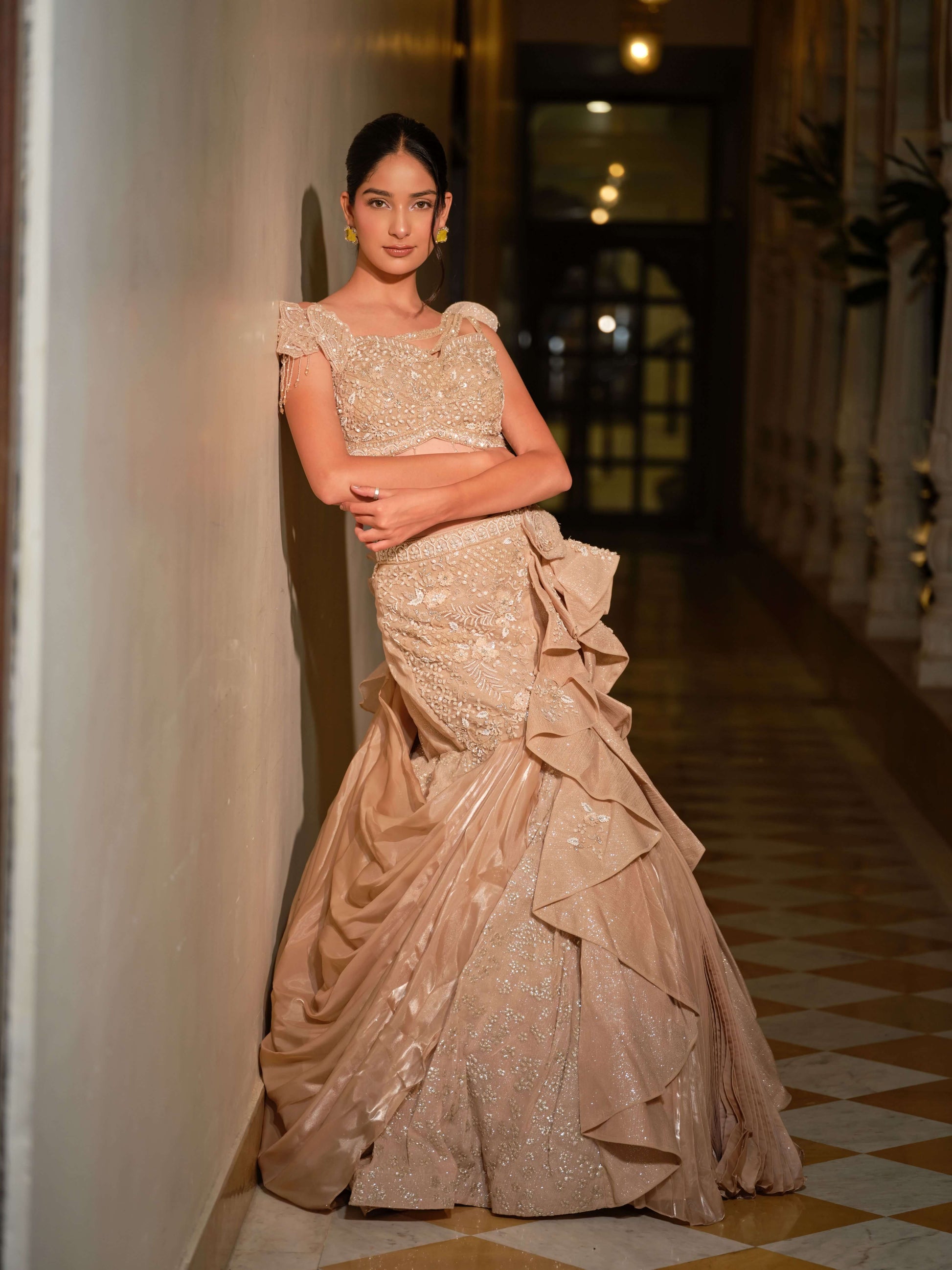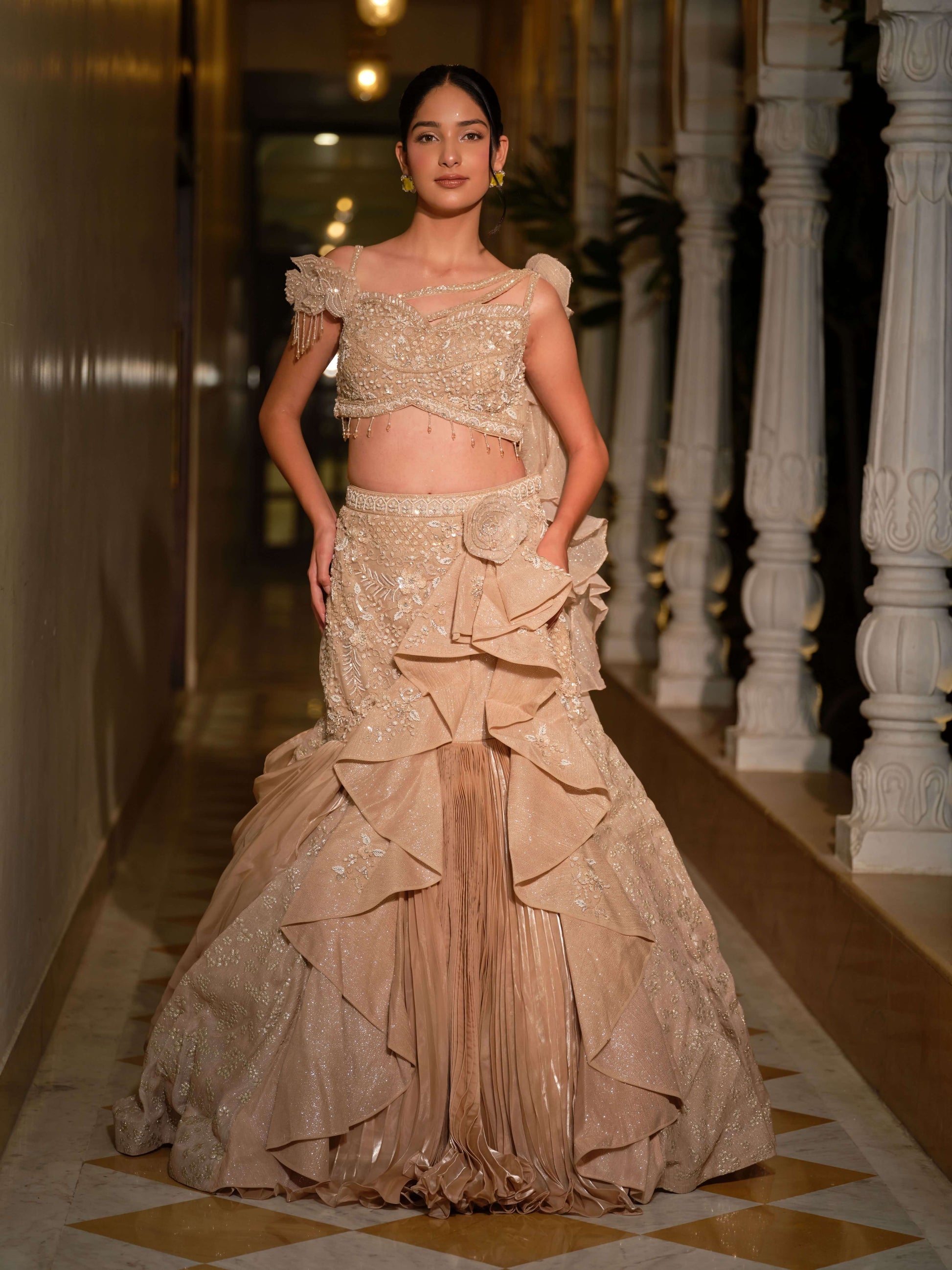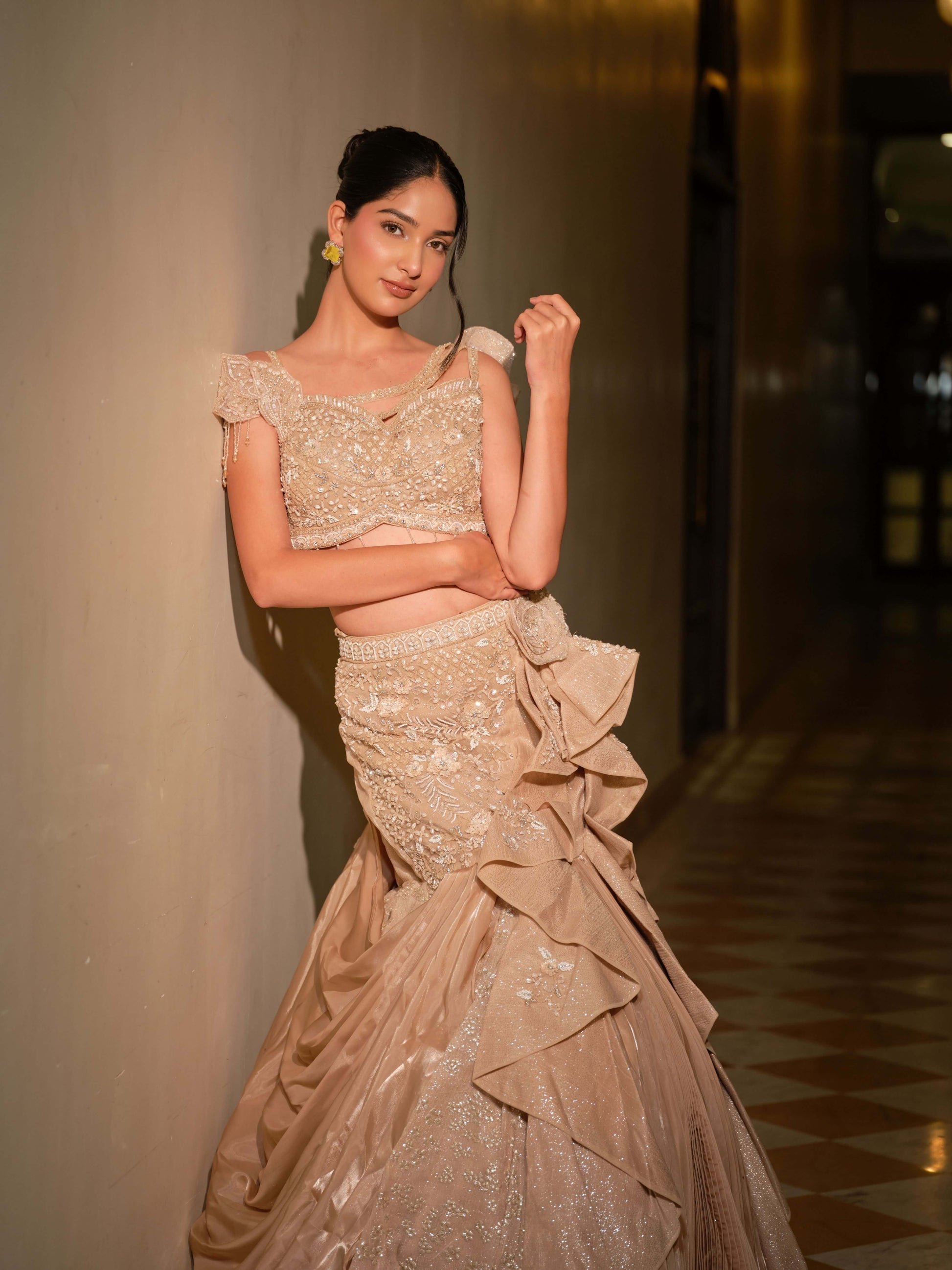 Radiate celestial elegance in Stellar Bloom, a champagne-hued masterpiece that blends cosmic charm with couture finesse. This off-shoulder ensemble features a delicately embroidered crop top paired with a voluminous ruffled skirt that cascades like stardust. The dramatic bow detail adds a touch of whimsy, while the sleek bun and statement earrings complete the look with regal poise. Designed for the modern muse who embodies grace and grandeur, this outfit is a celebration of light, luxury, and lunar beauty.
