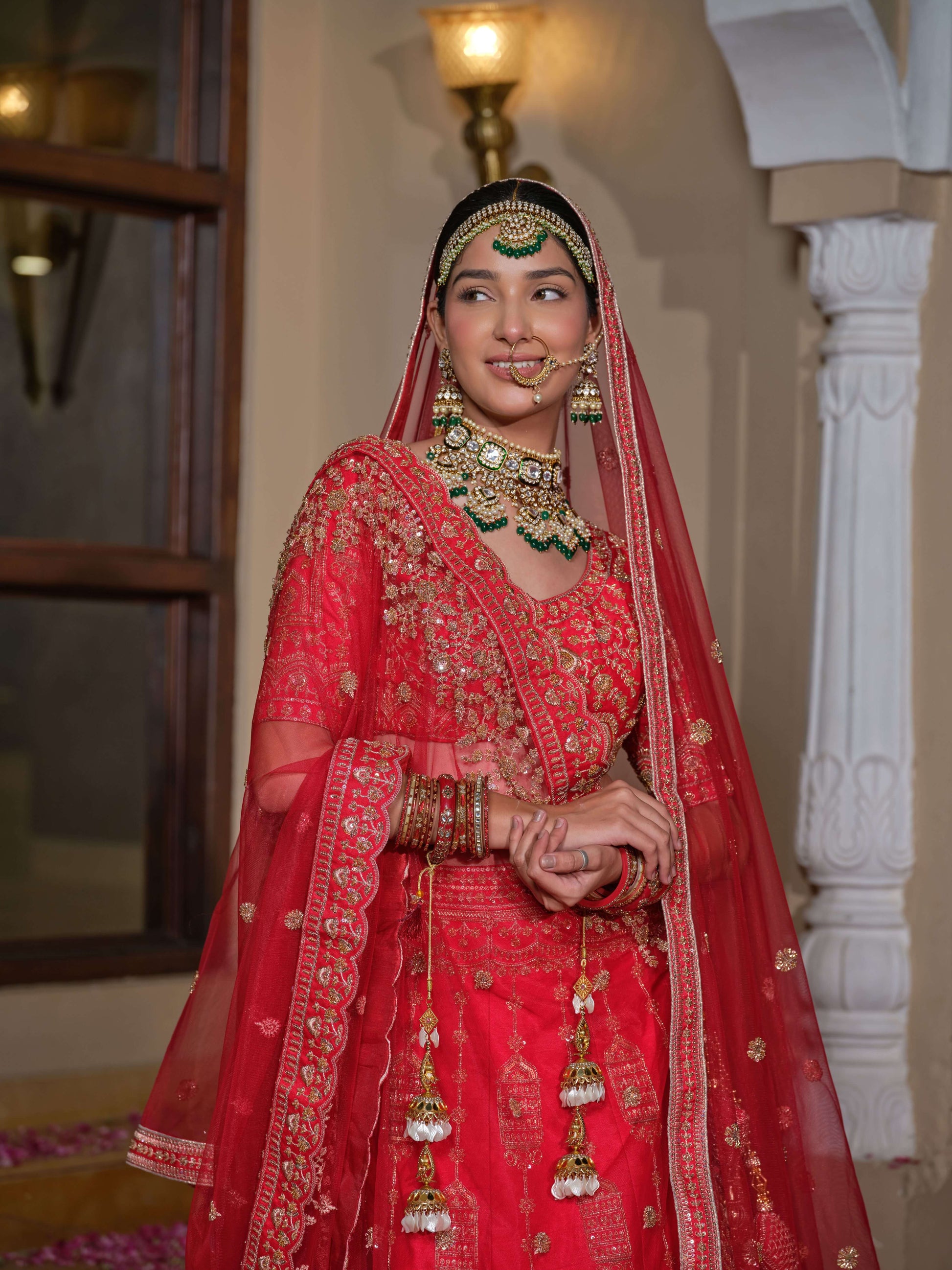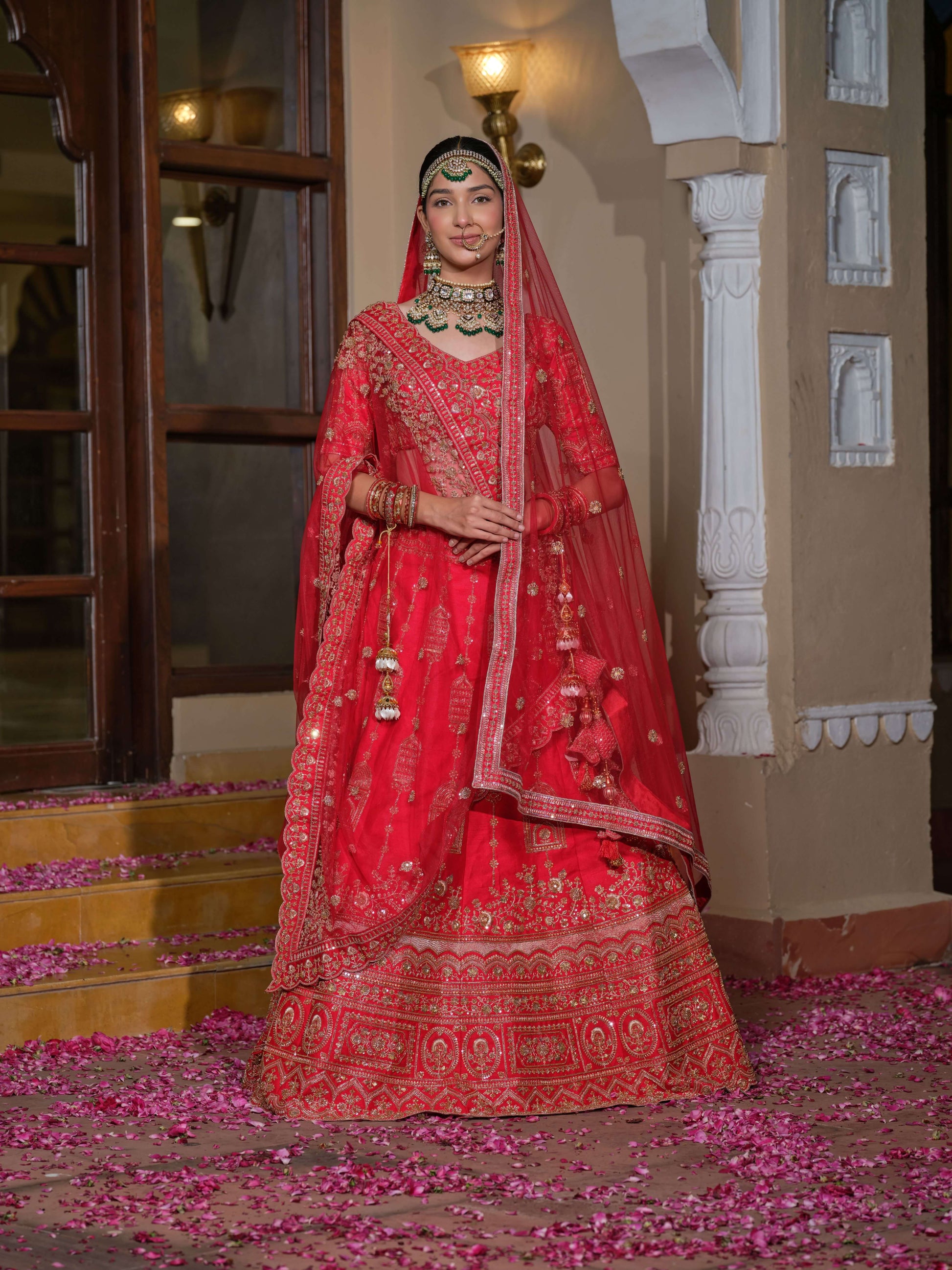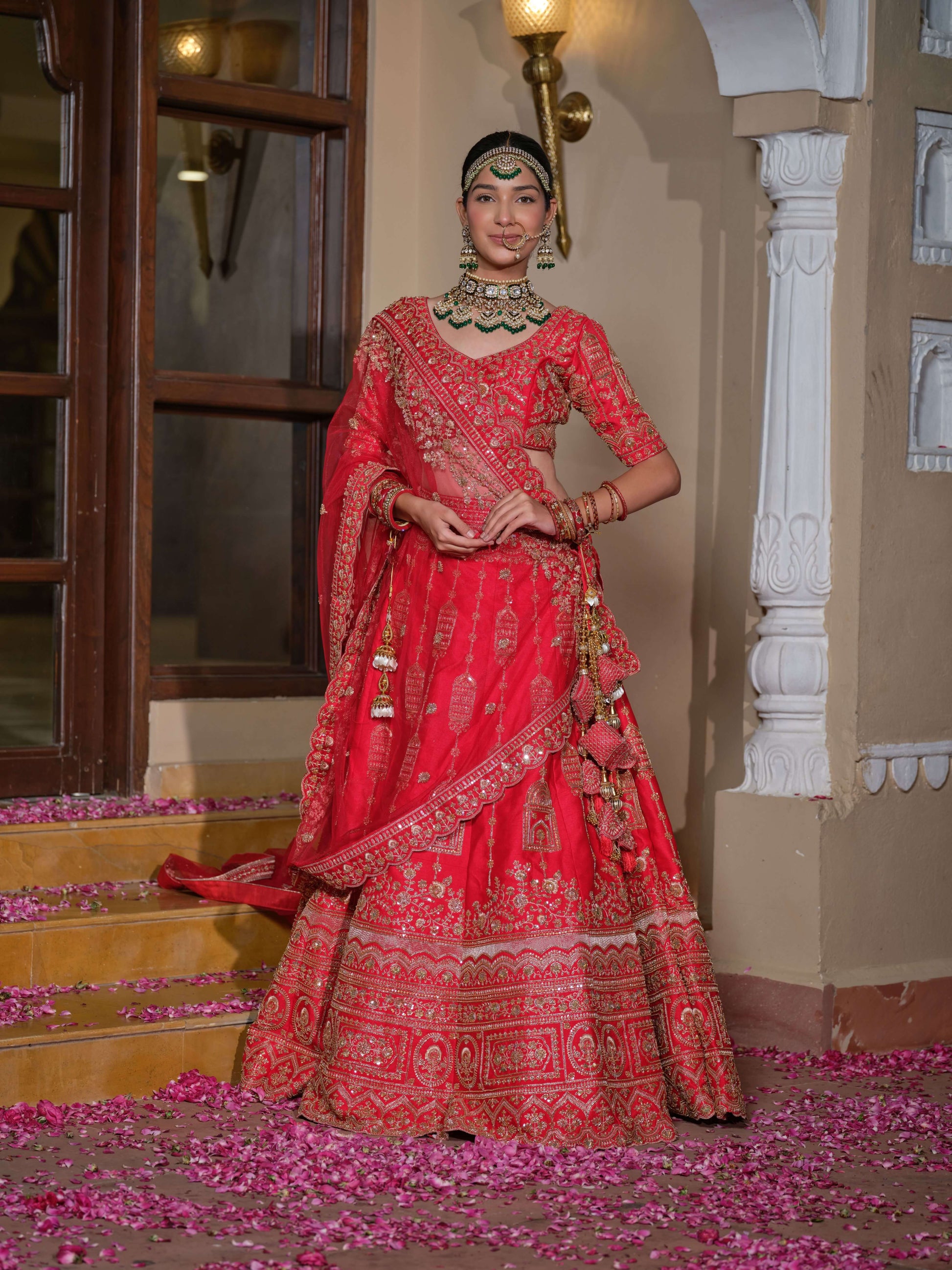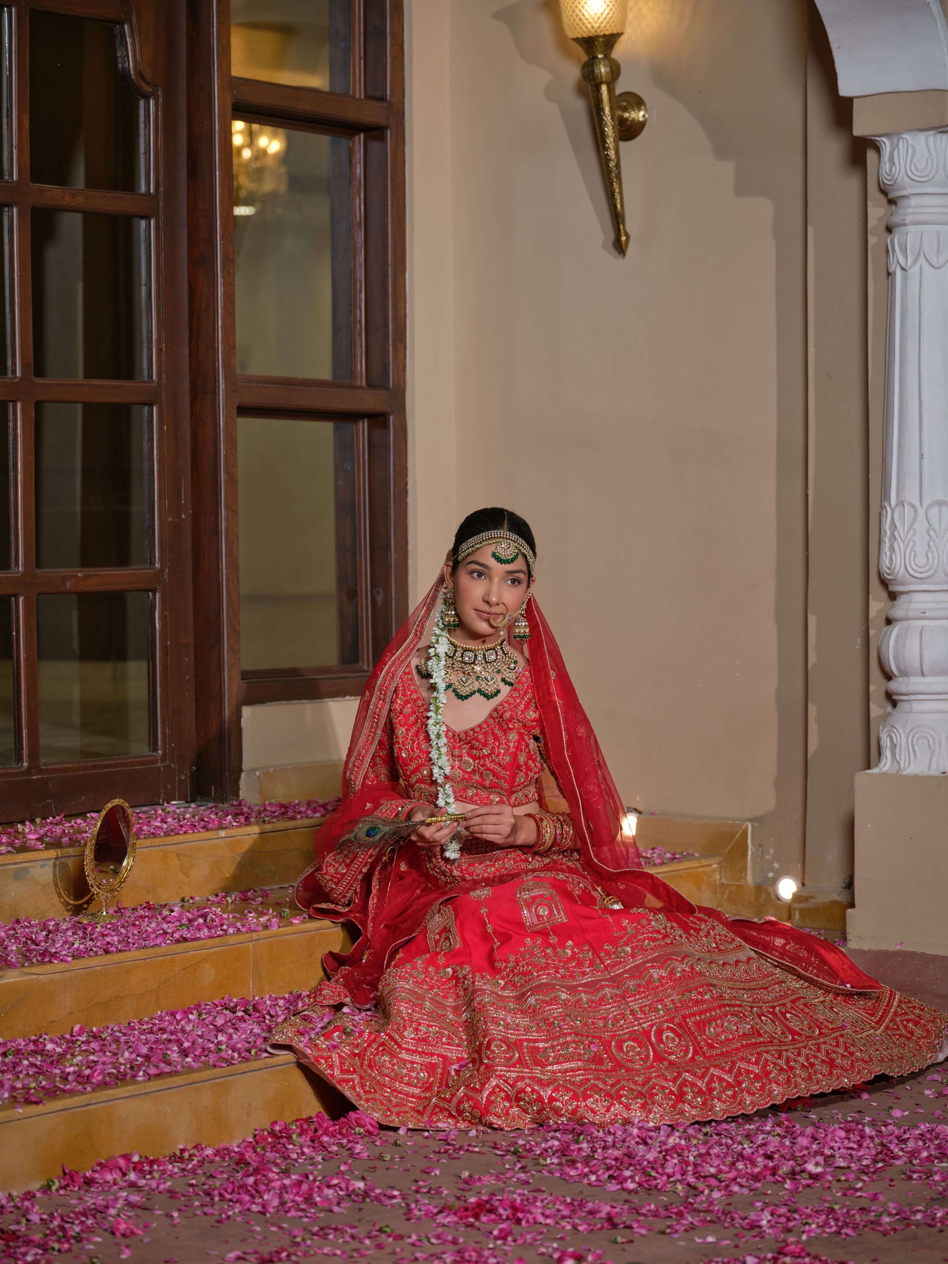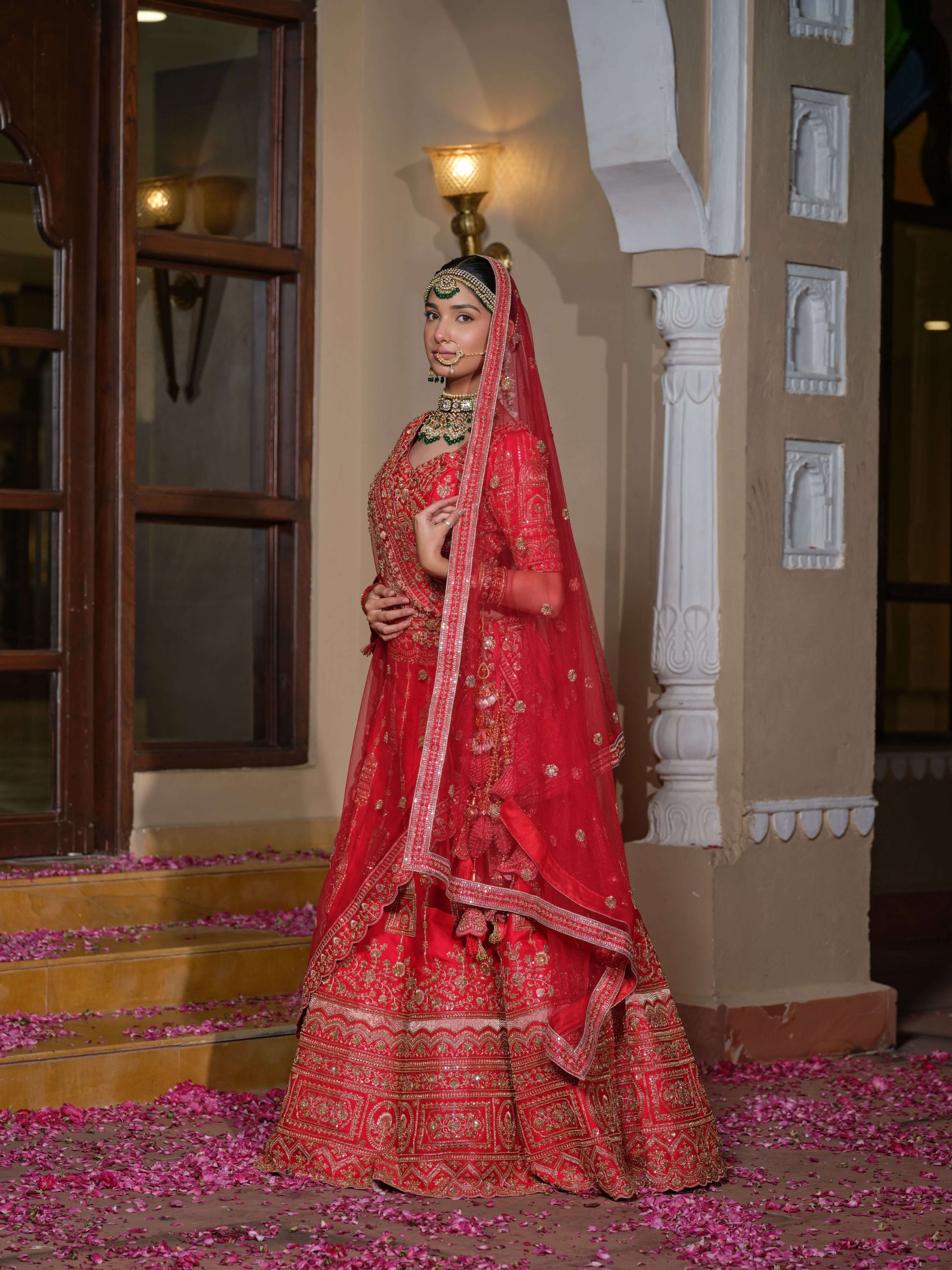 Adorned in the richness of handcrafted zardosi and resham embroidery, this deep vermilion red bridal lehenga captures the essence of timeless Indian royalty. Its intricate temple motifs, heritage patterns, and regal dupatta narrate a story of love, tradition, and devotion — a true heirloom for the modern-day queen.