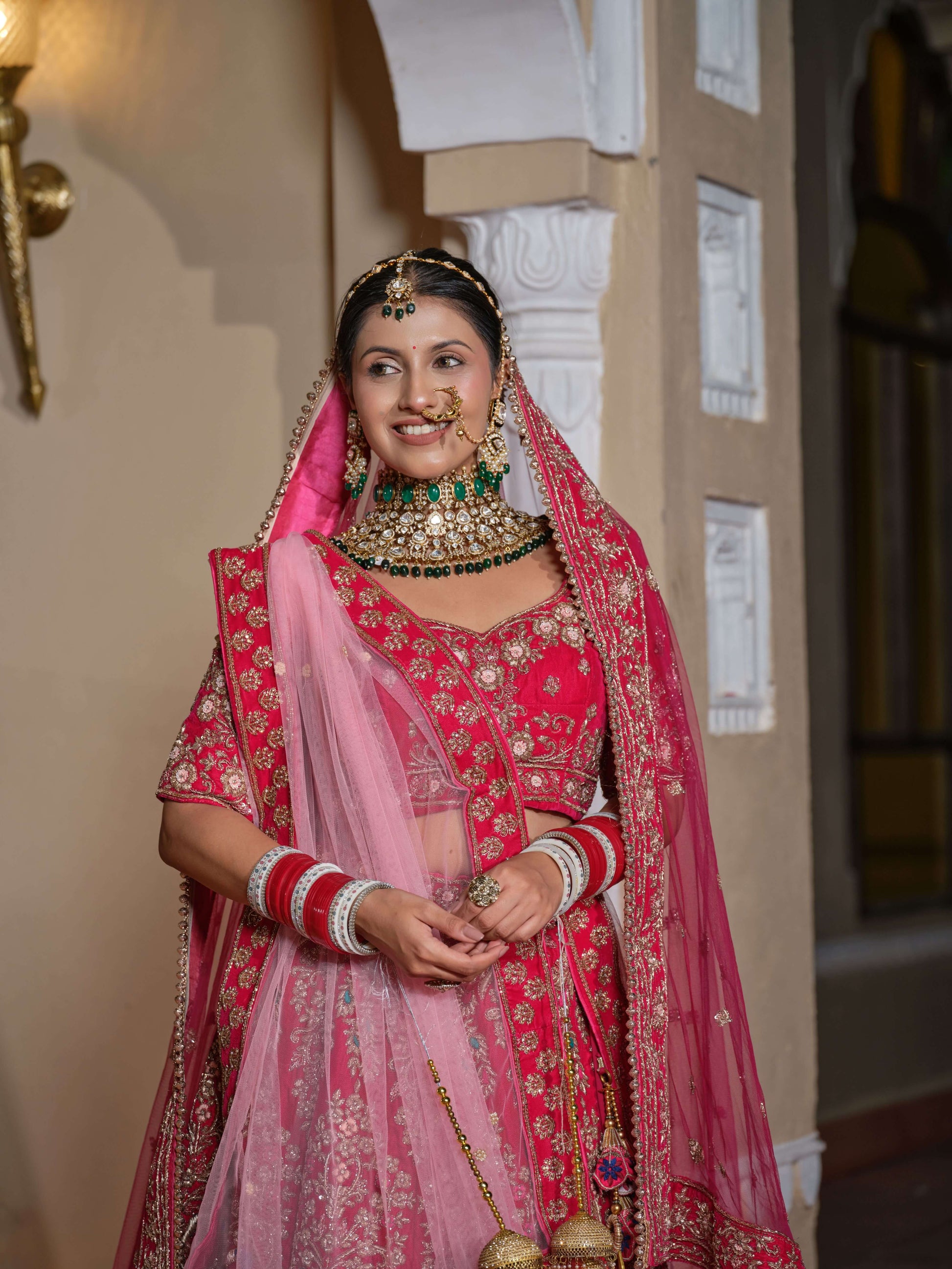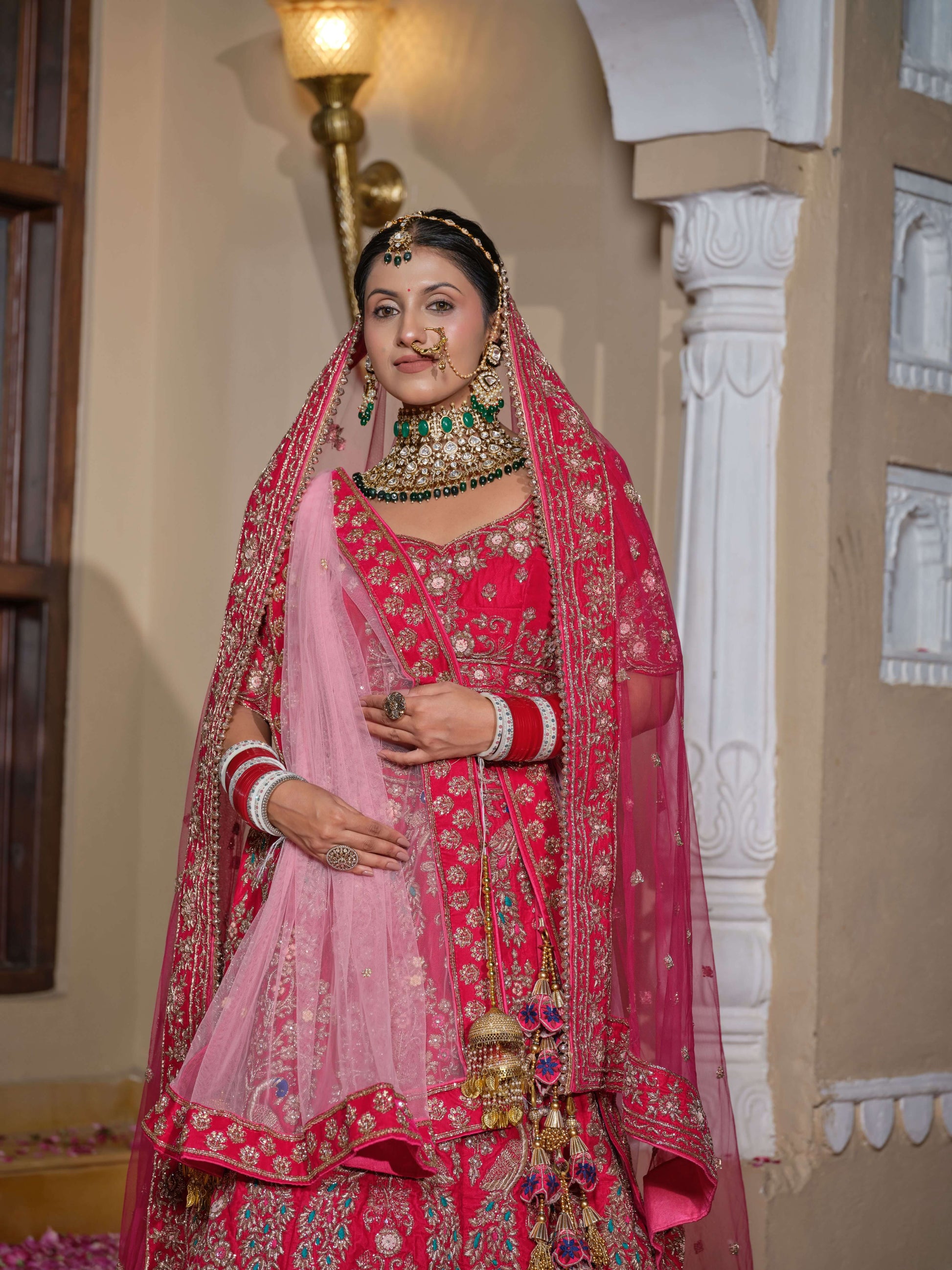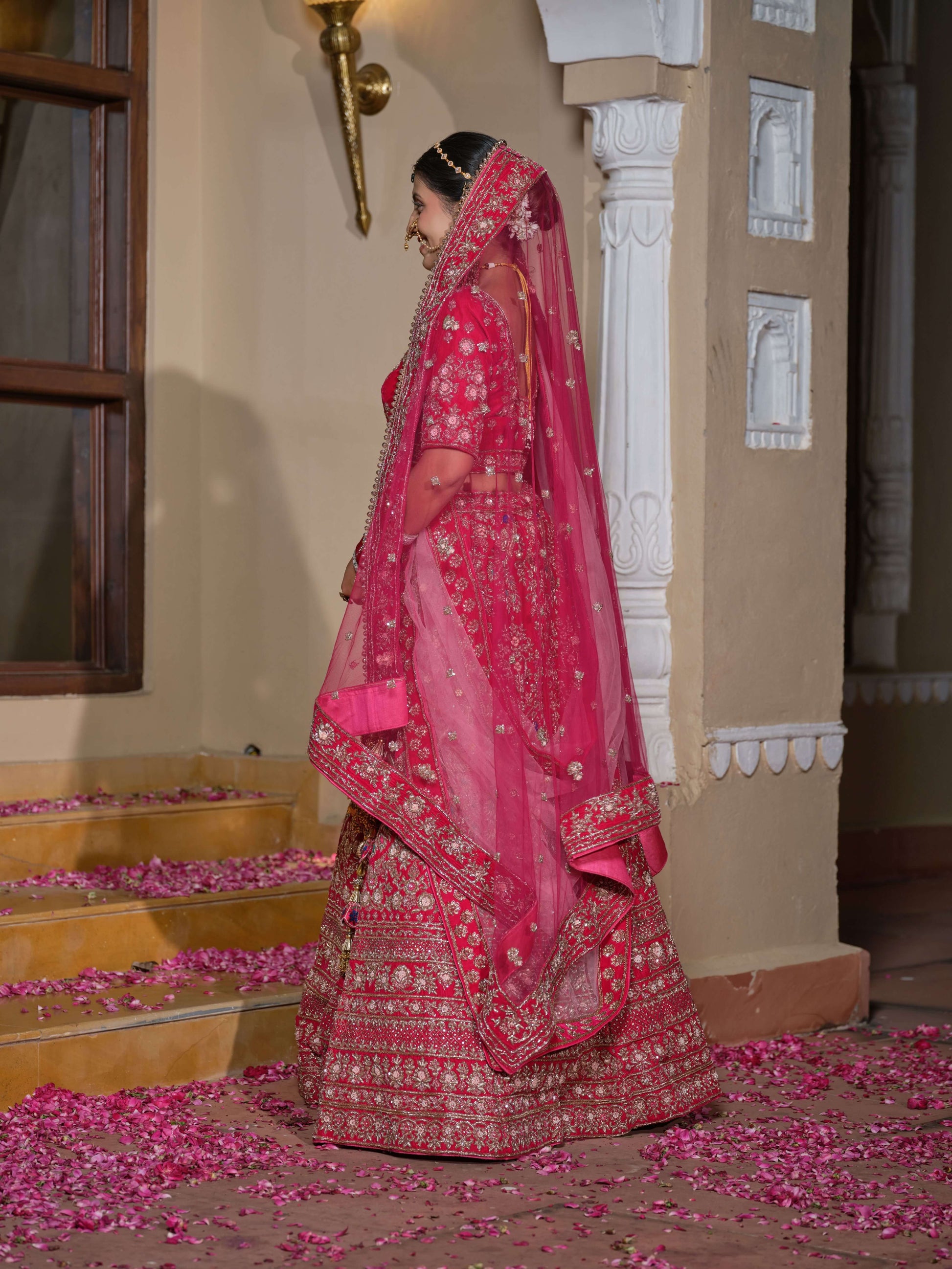 The Velvet Amara Lehenga embodies romance and royalty in equal measure. Crafted in sumptuous magenta velvet, it features exquisite zardozi embroidery that catches the light like poetry in motion. The deep hue and ornate detailing make it perfect for a bride who wants to blend old-world charm with modern grace.