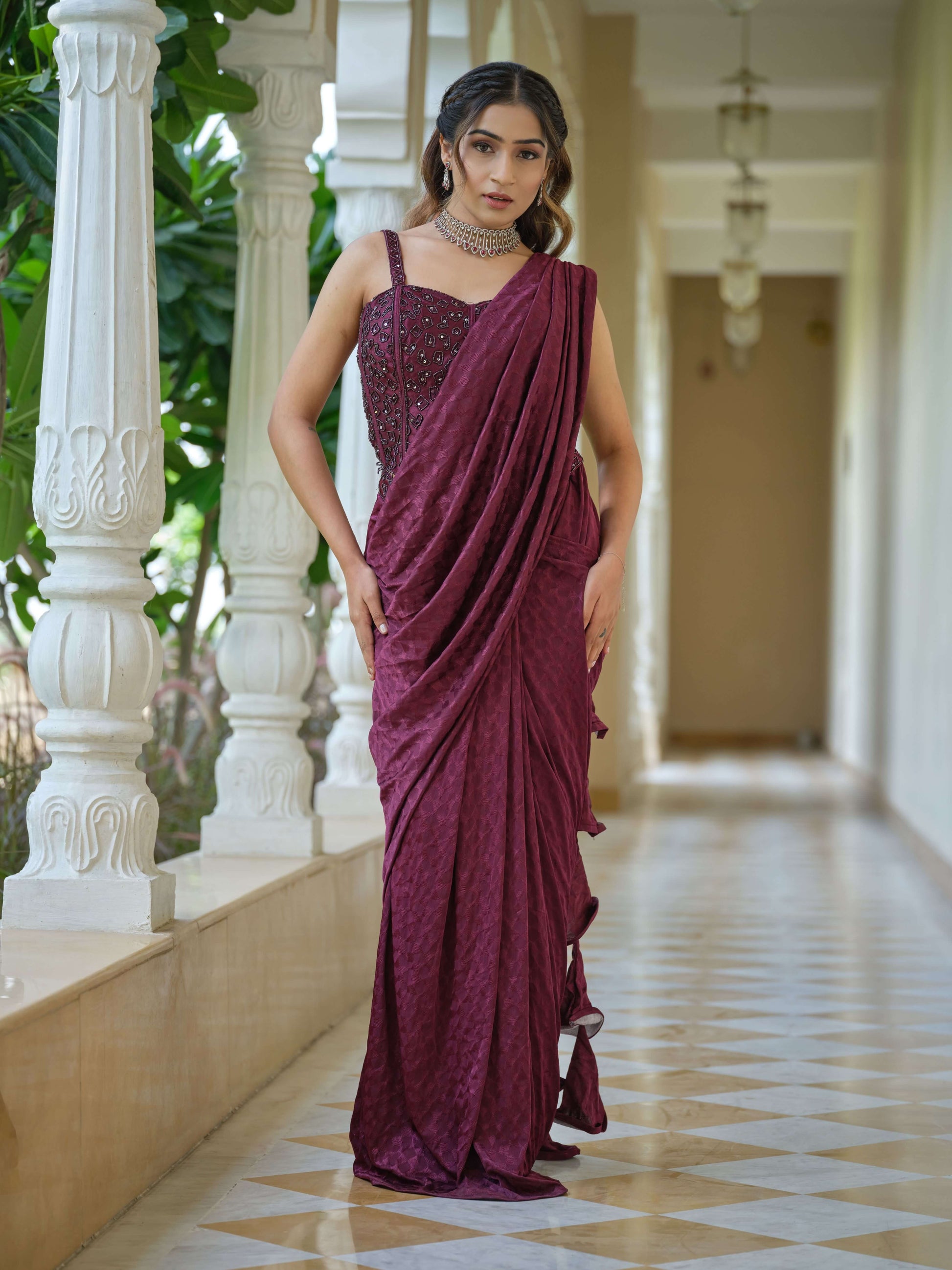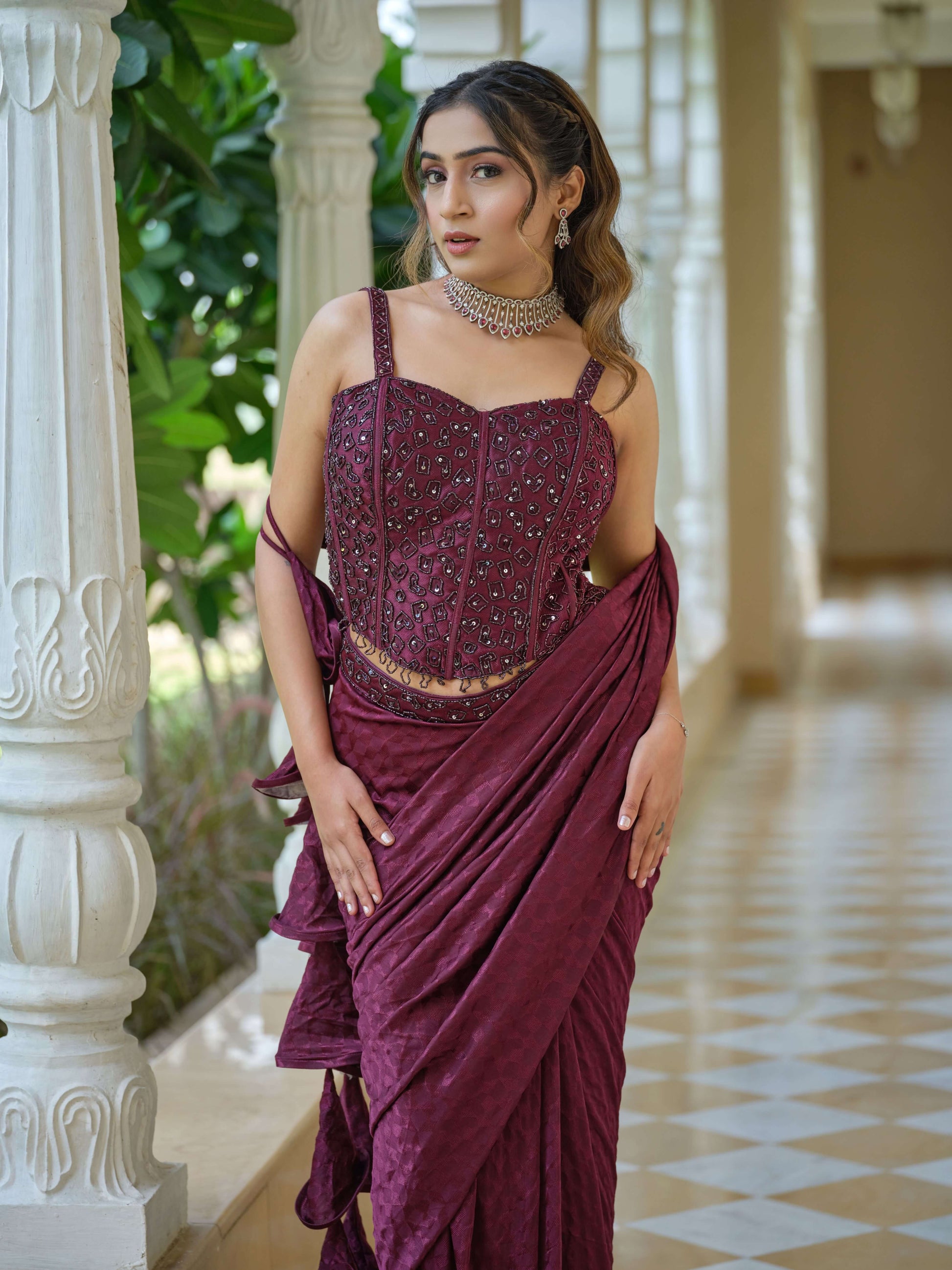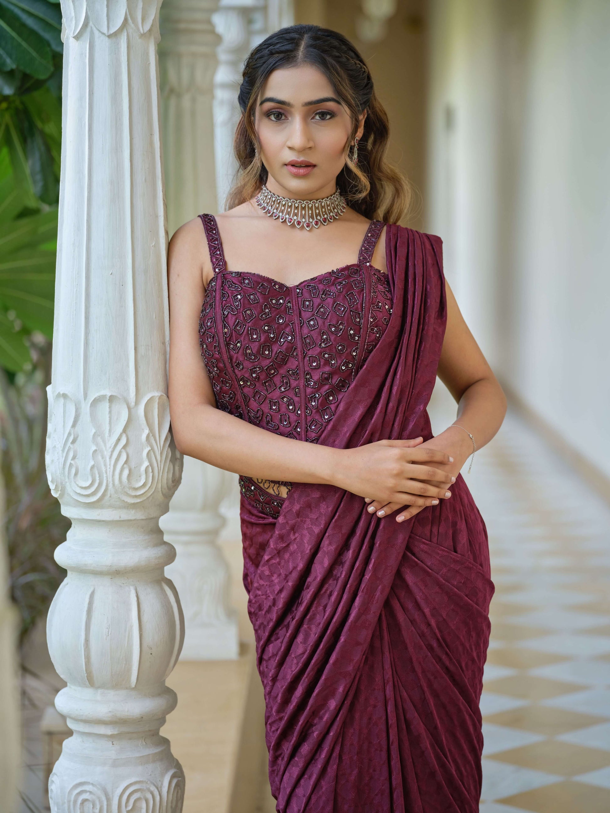 A mesmerizing plum-toned pre-draped saree gown crafted from rich satin silk, adorned with intricate hand embellishments on the bodice. The contemporary silhouette merges the elegance of a saree with the comfort of a gown, featuring tassel detailing that adds movement and charm. Perfectly paired with statement jewelry, this ensemble radiates sophistication and allure.