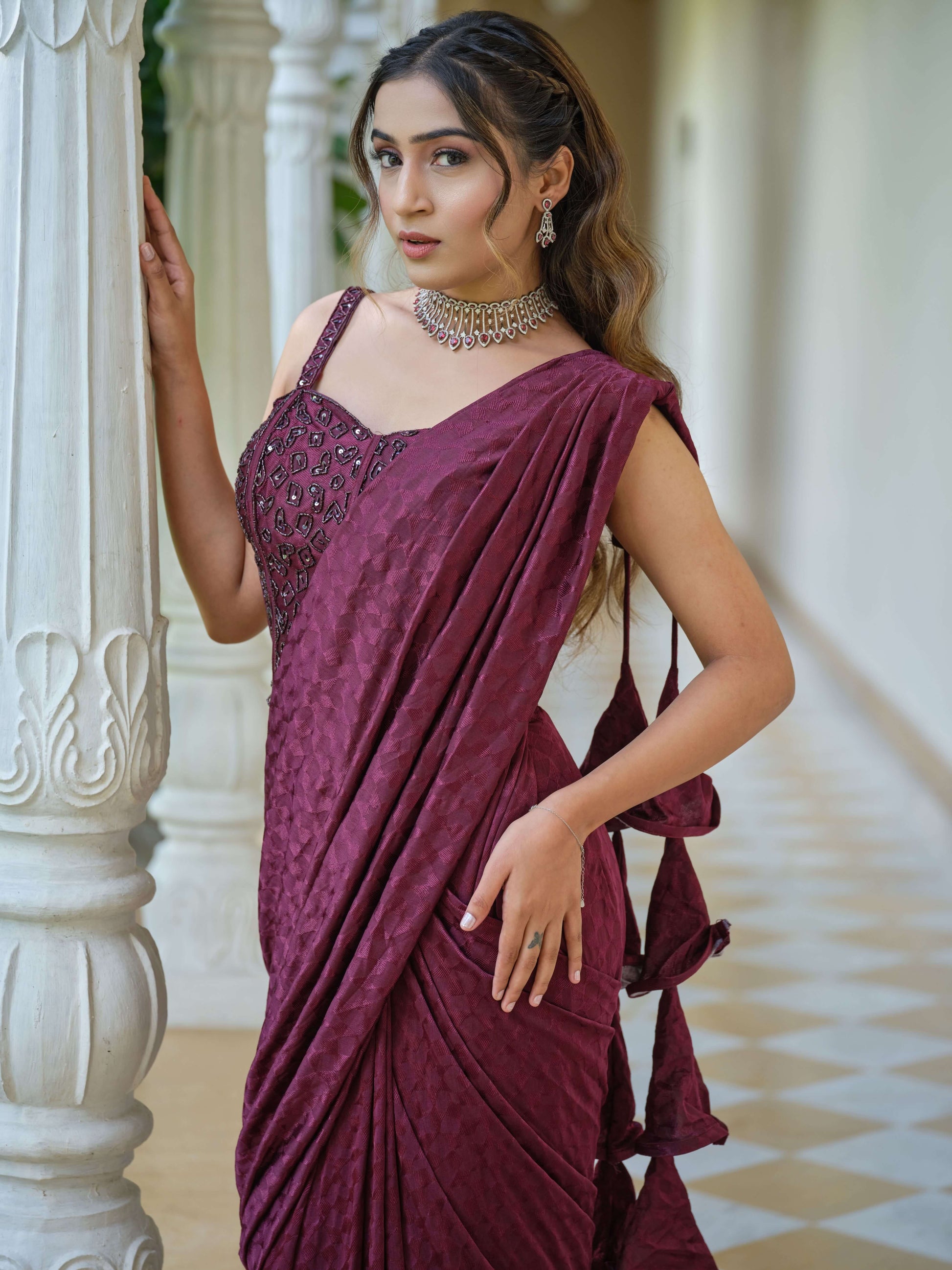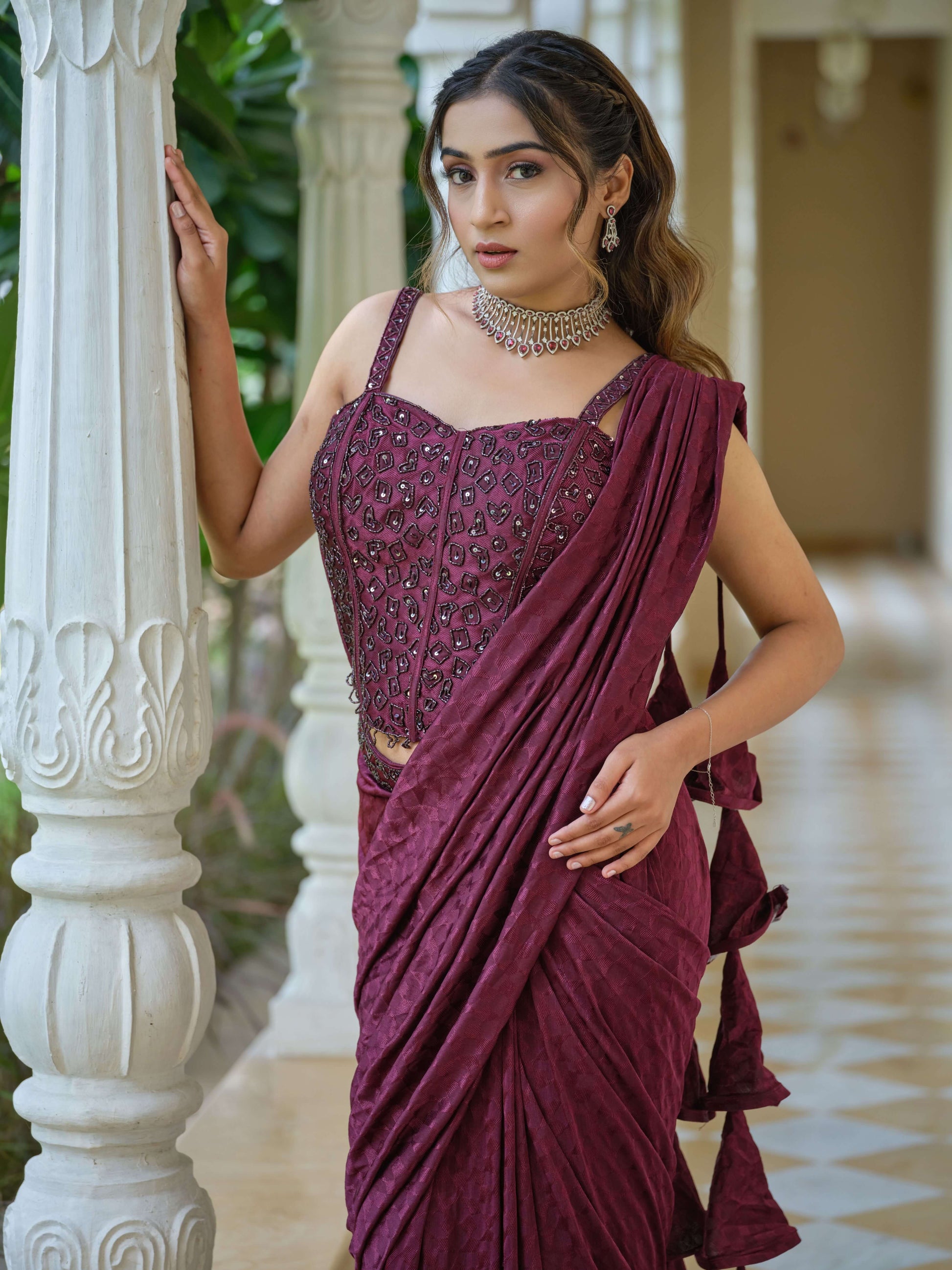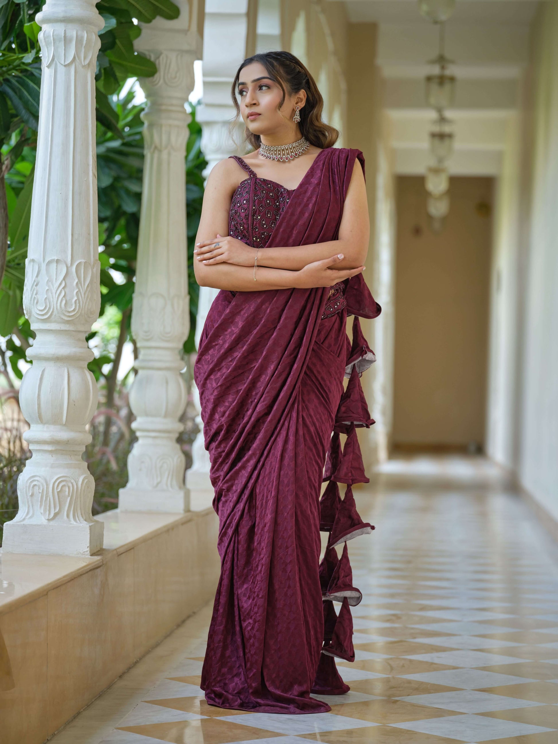 A mesmerizing plum-toned pre-draped saree gown crafted from rich satin silk, adorned with intricate hand embellishments on the bodice. The contemporary silhouette merges the elegance of a saree with the comfort of a gown, featuring tassel detailing that adds movement and charm. Perfectly paired with statement jewelry, this ensemble radiates sophistication and allure.
