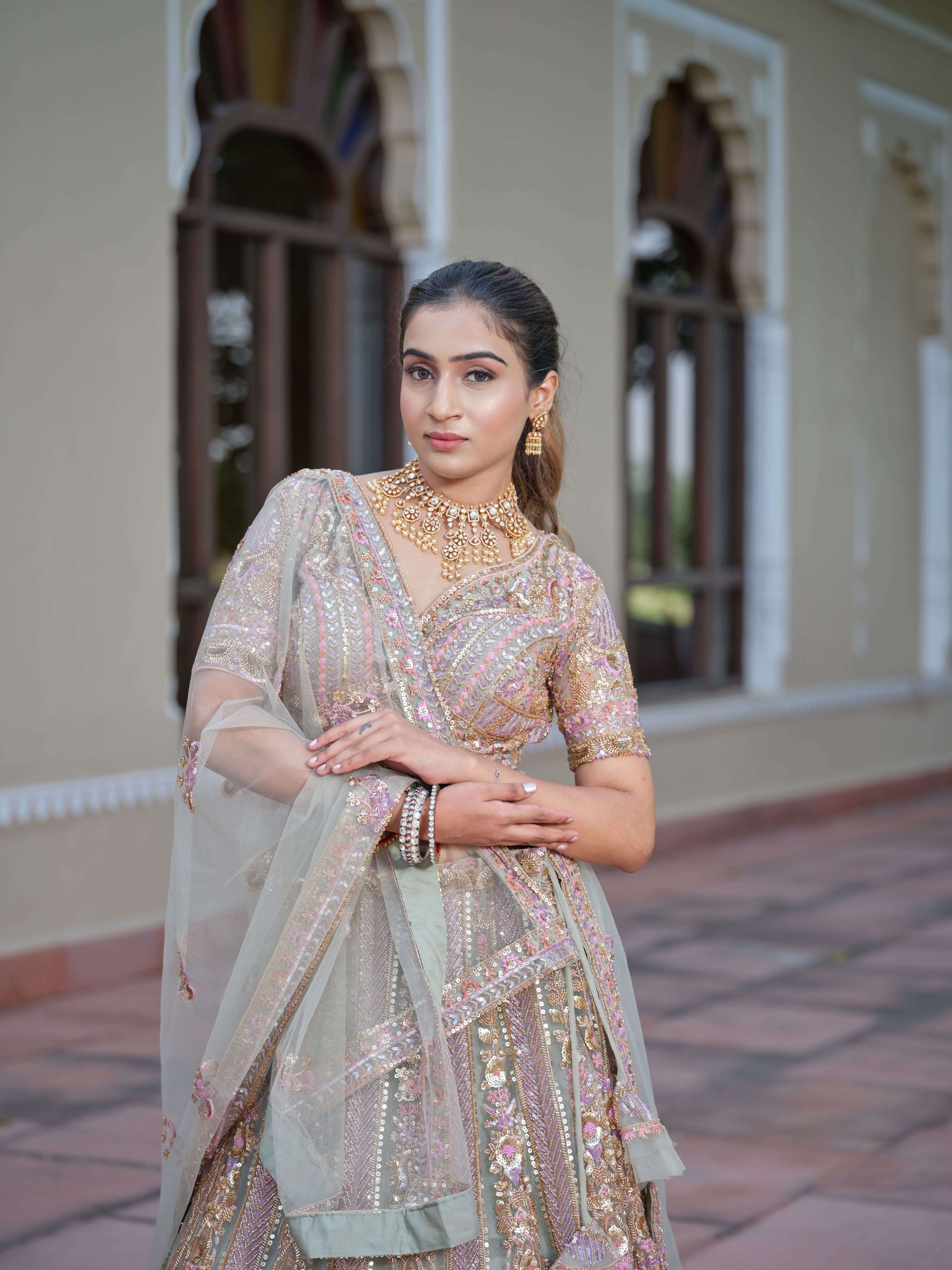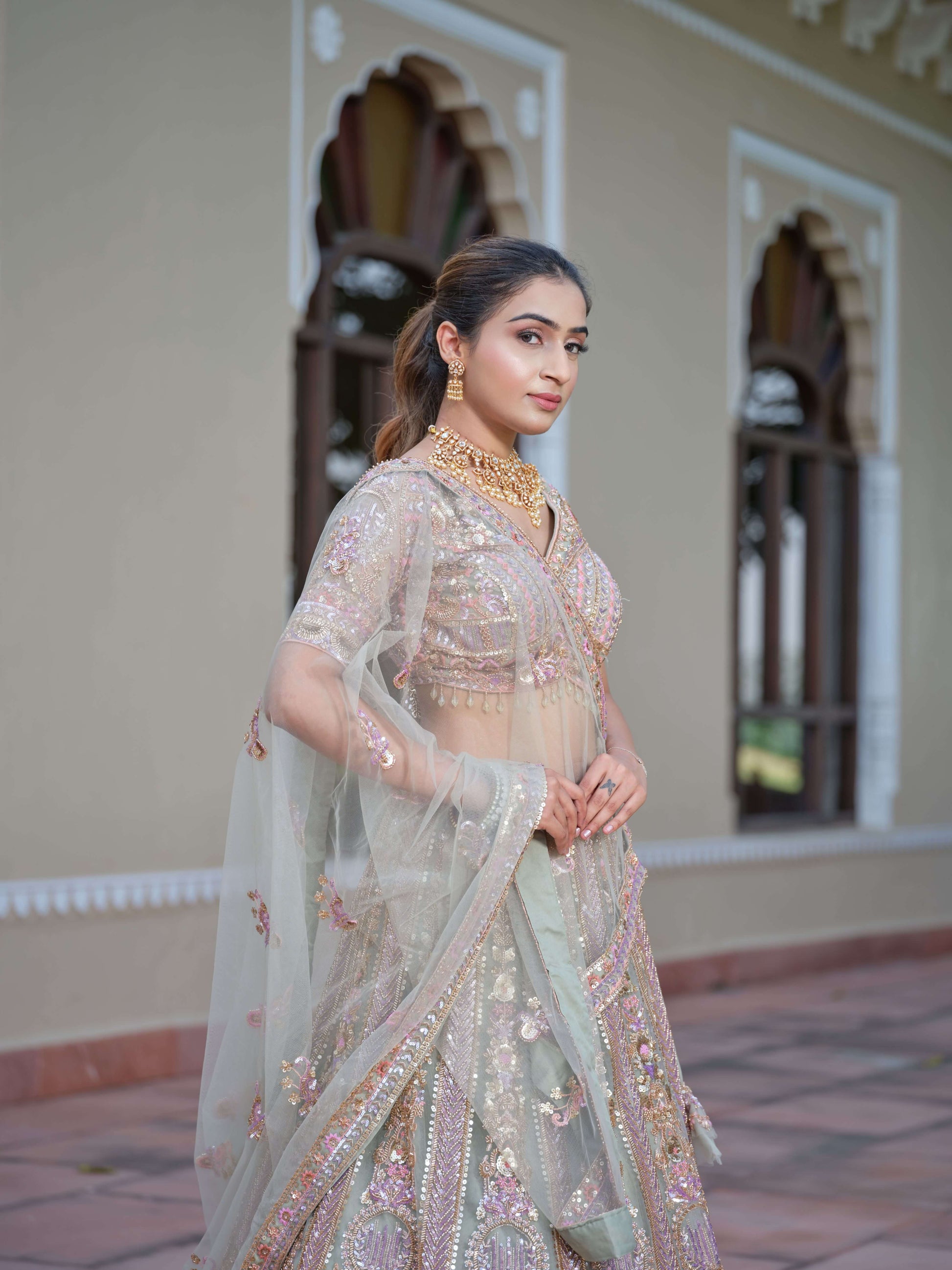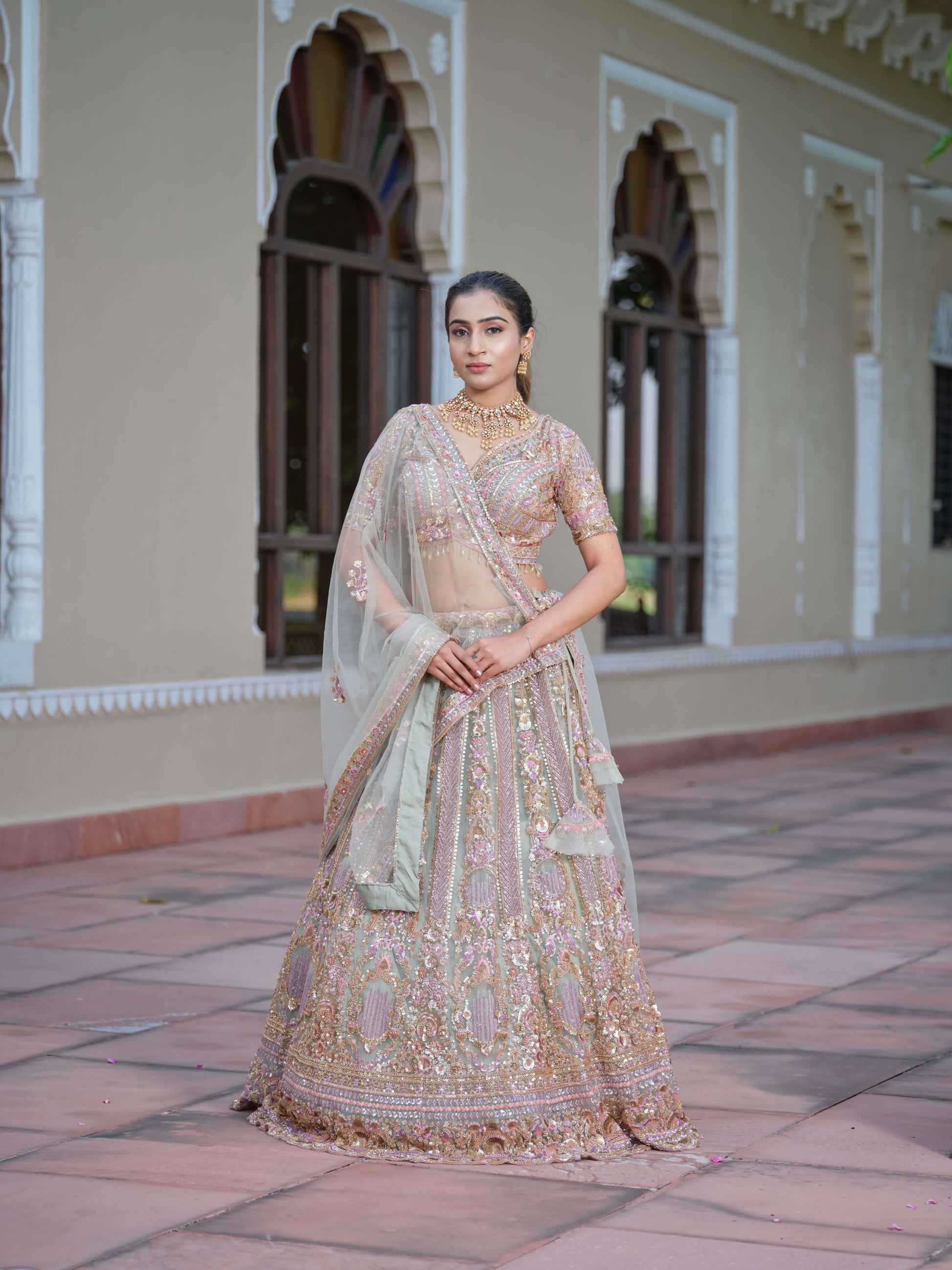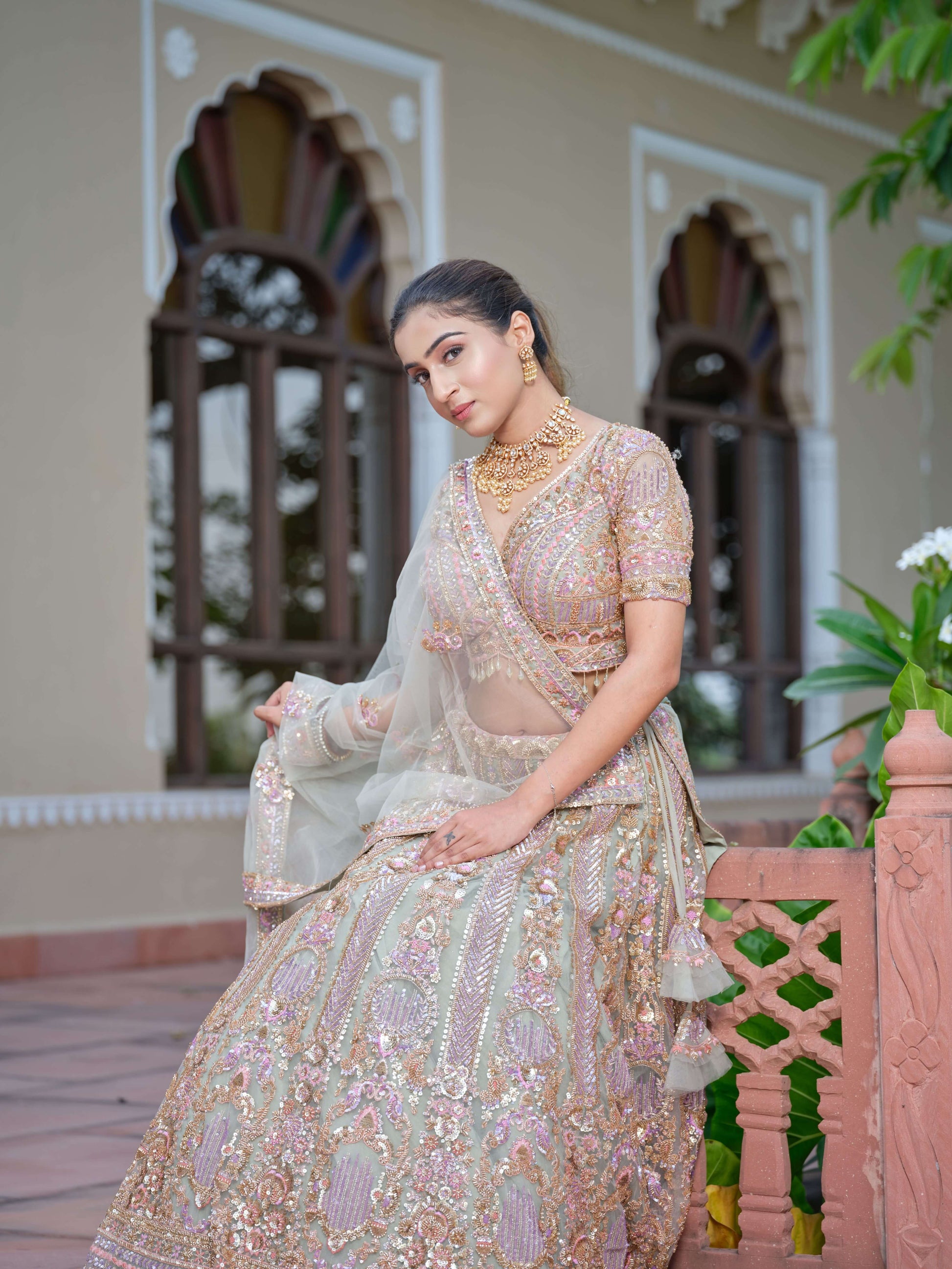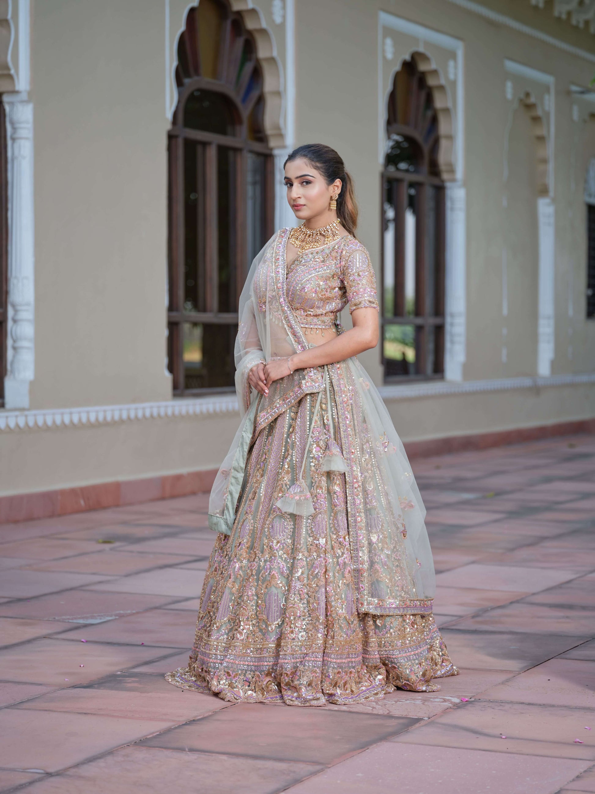The lehenga features luxurious sequin, zari, cutdana, and threadwork detailing that creates a breathtaking blend of pastel hues and shimmering elegance.