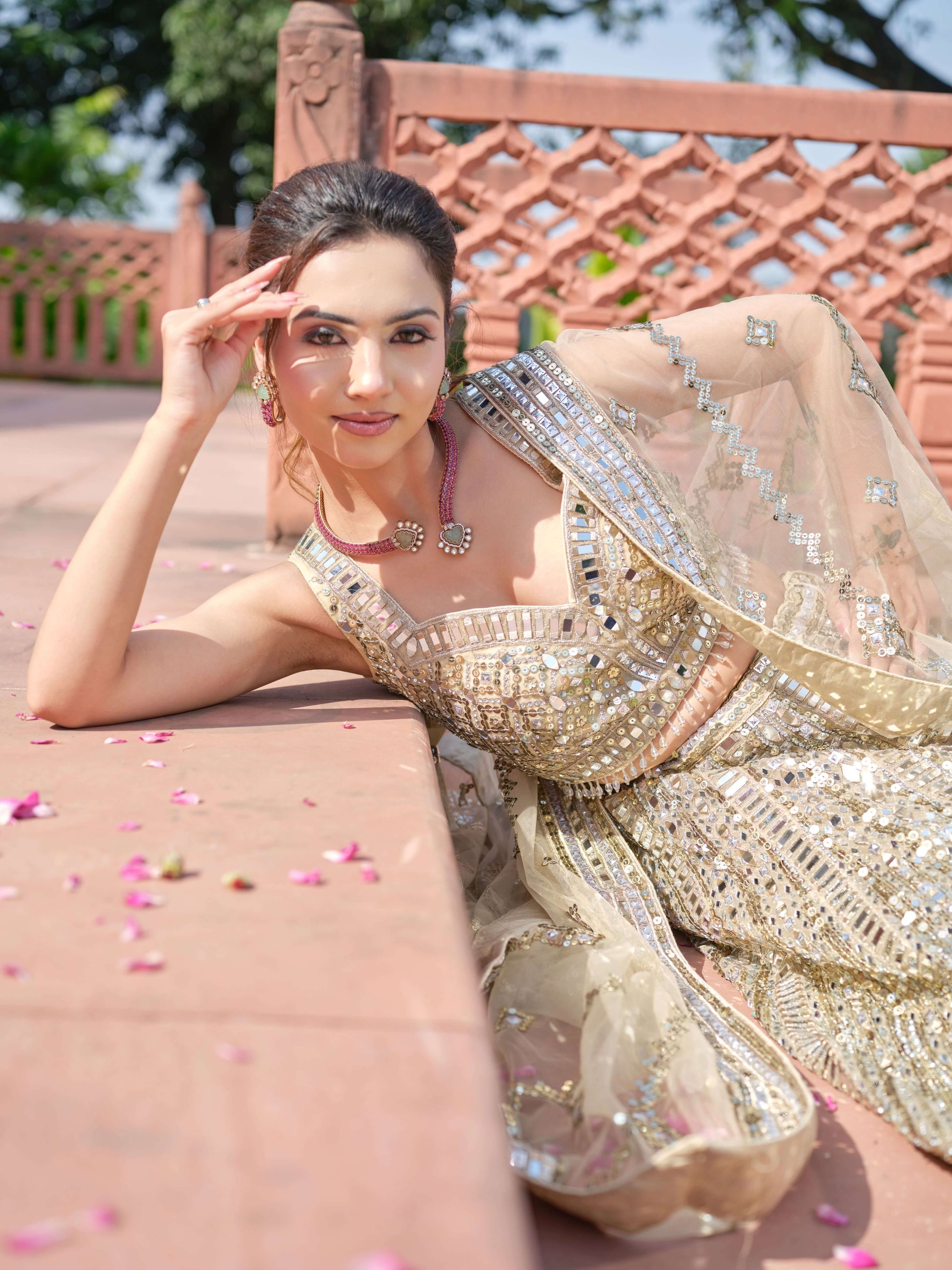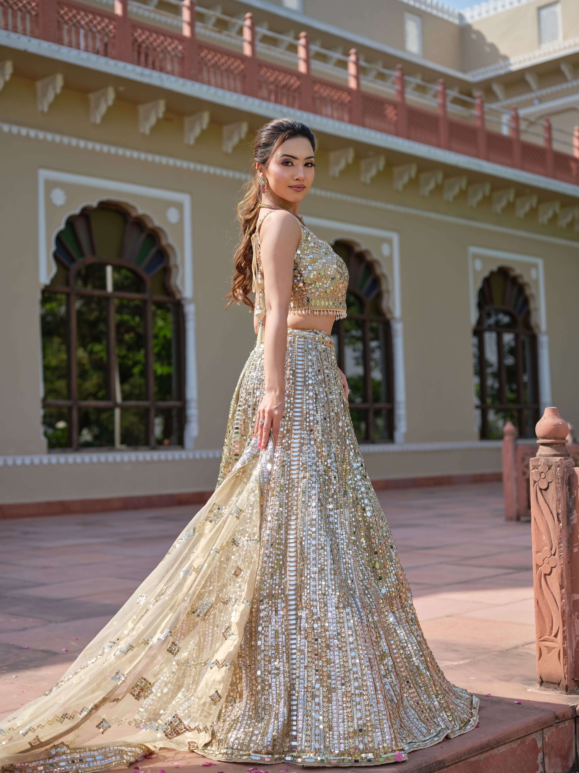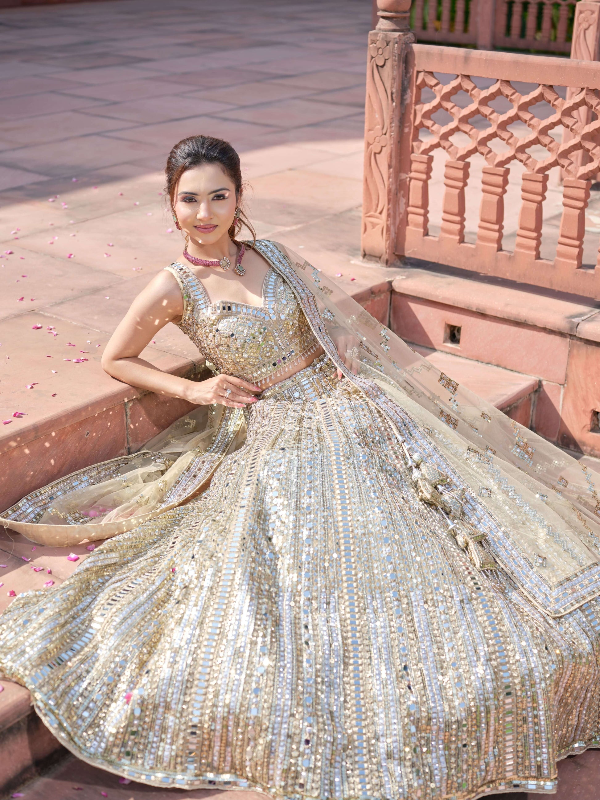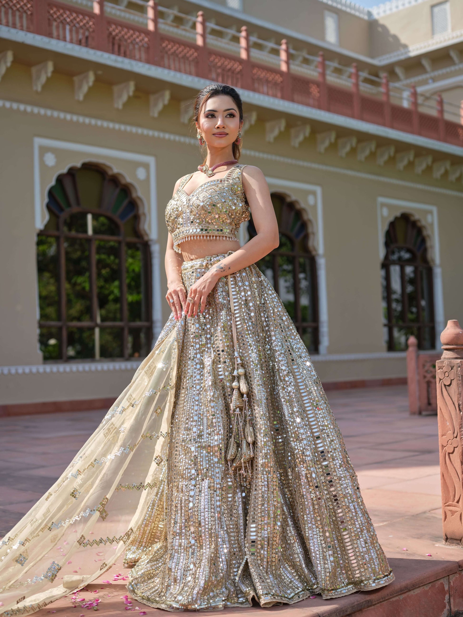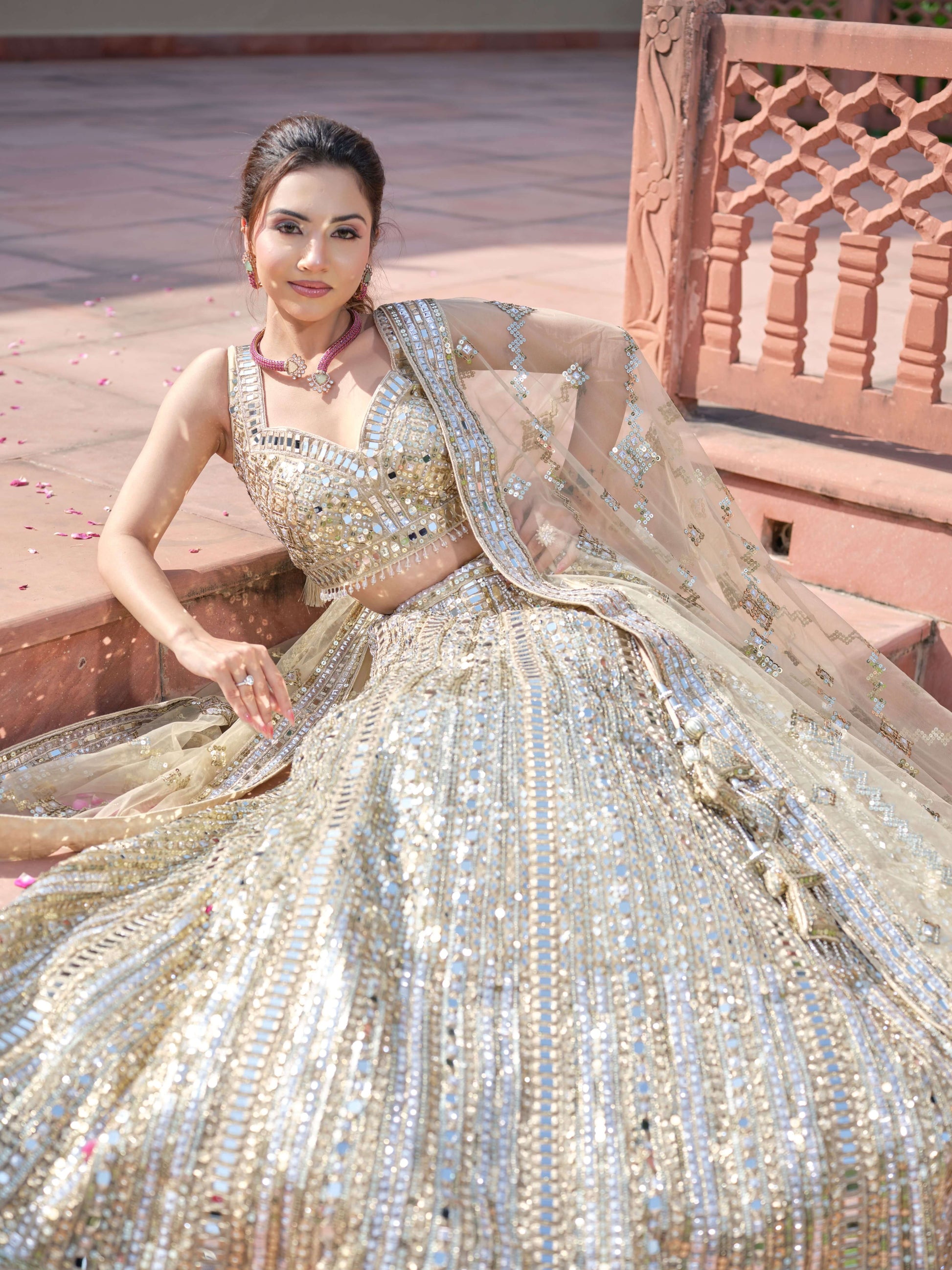 This luxurious gold lehenga is a true statement piece, crafted with intricate hand-embroidered mirror work that captures and reflects light with every movement. The blouse features a structured, modern silhouette, enhancing the outfit’s contemporary elegance, while the flared skirt showcases a breathtaking mosaic of mirrors arranged in artistic geometric patterns.